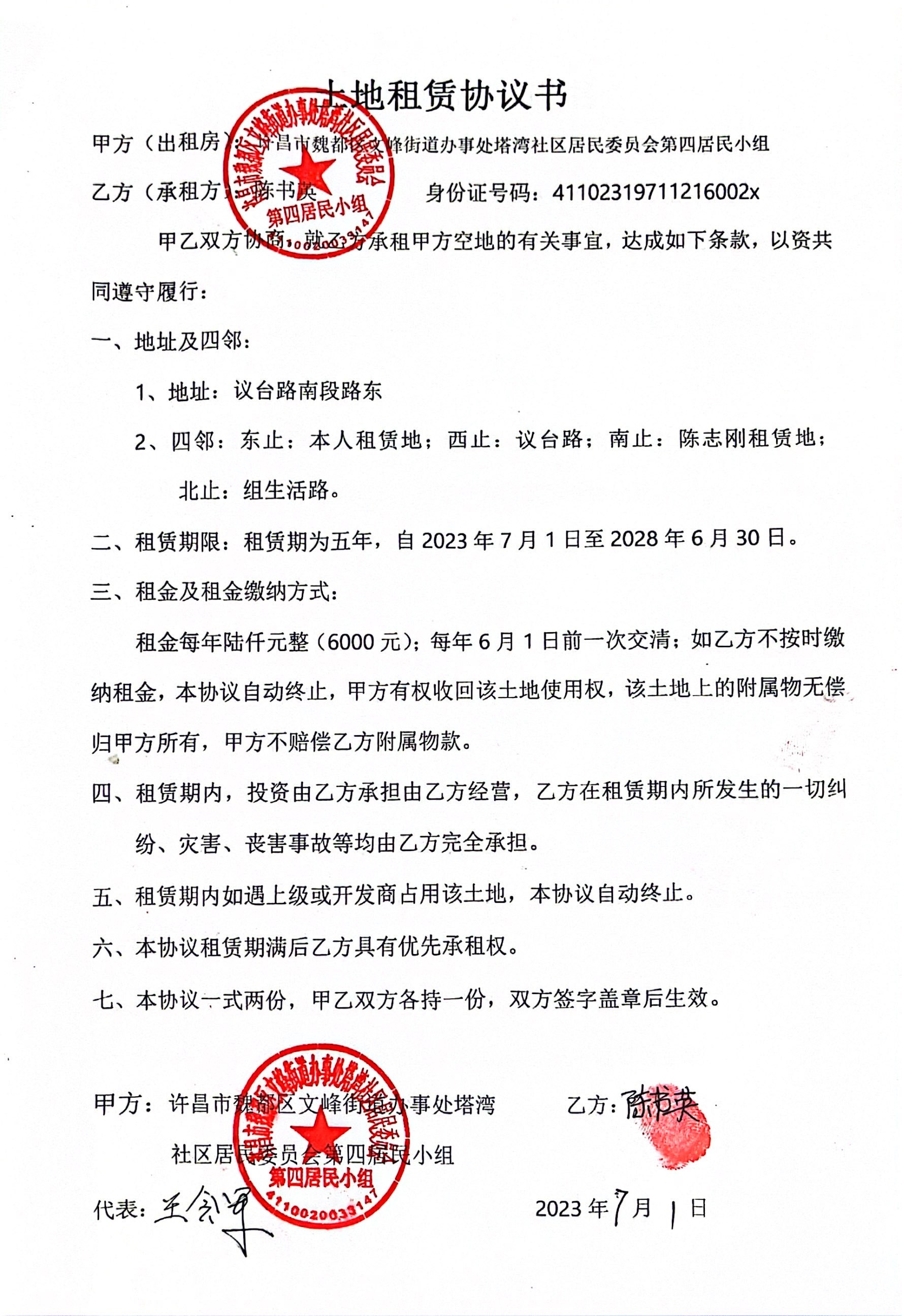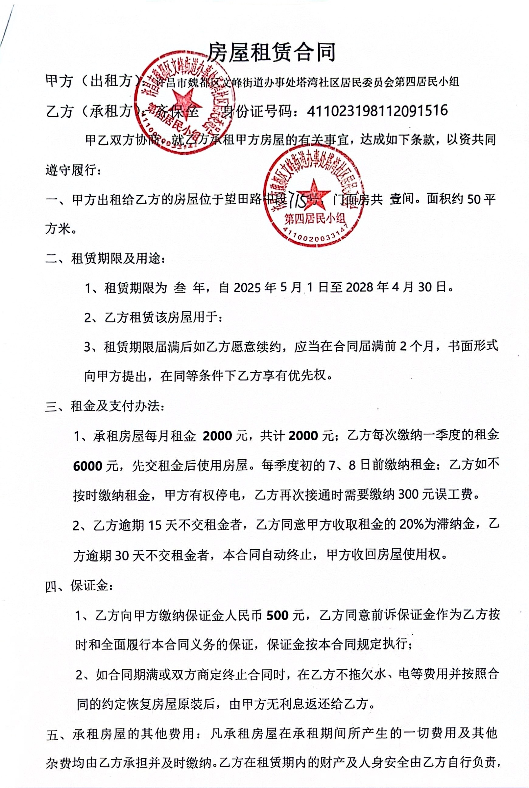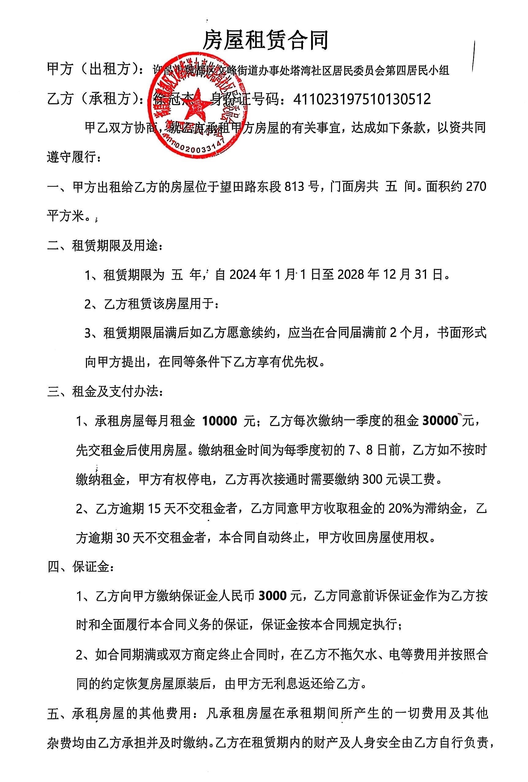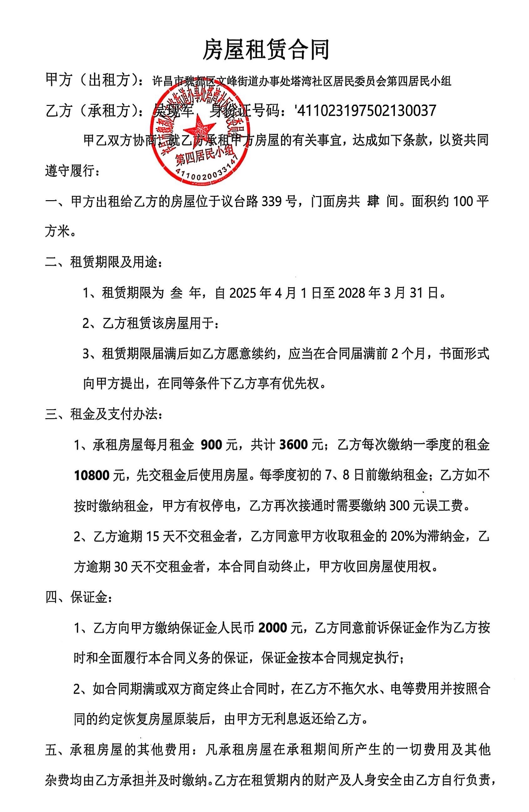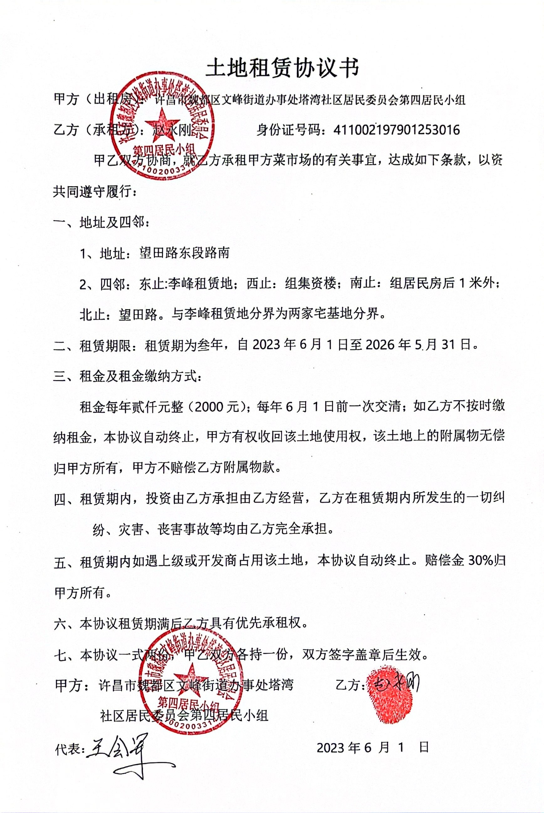 文峰办事处塔湾社区第五居民小组门面房及场院租赁协议