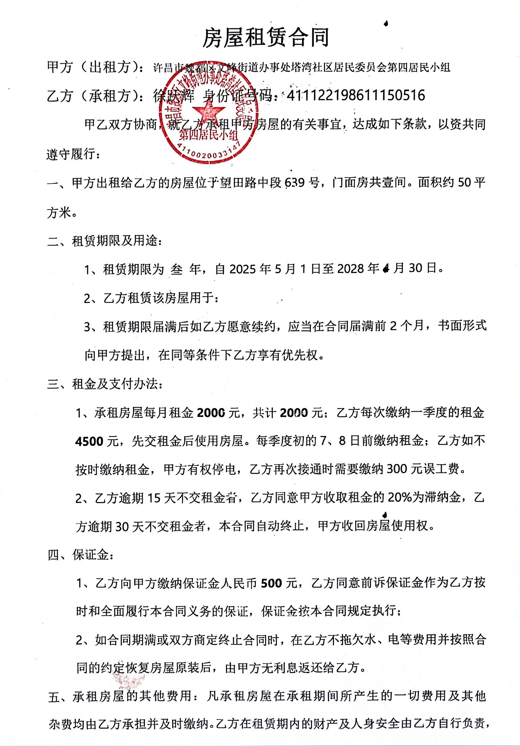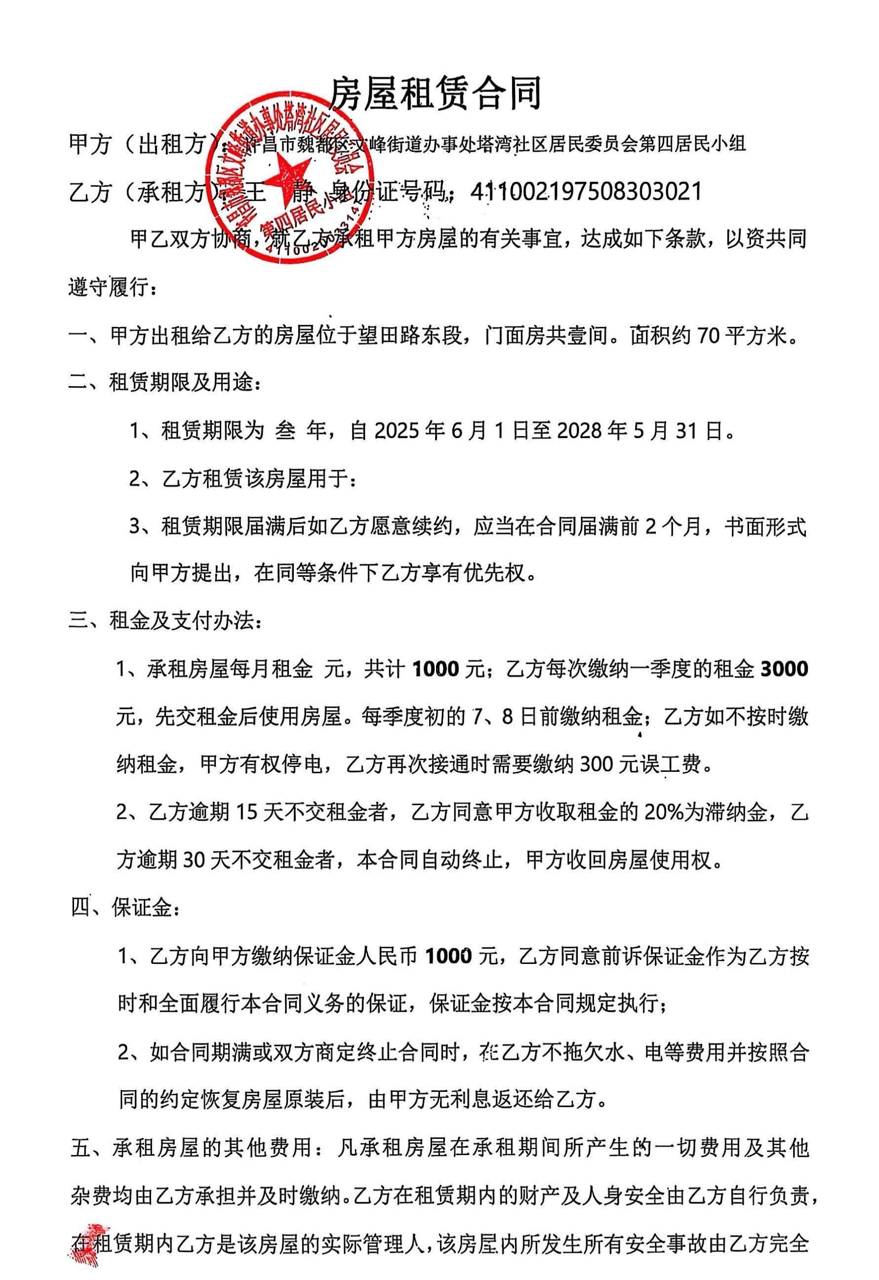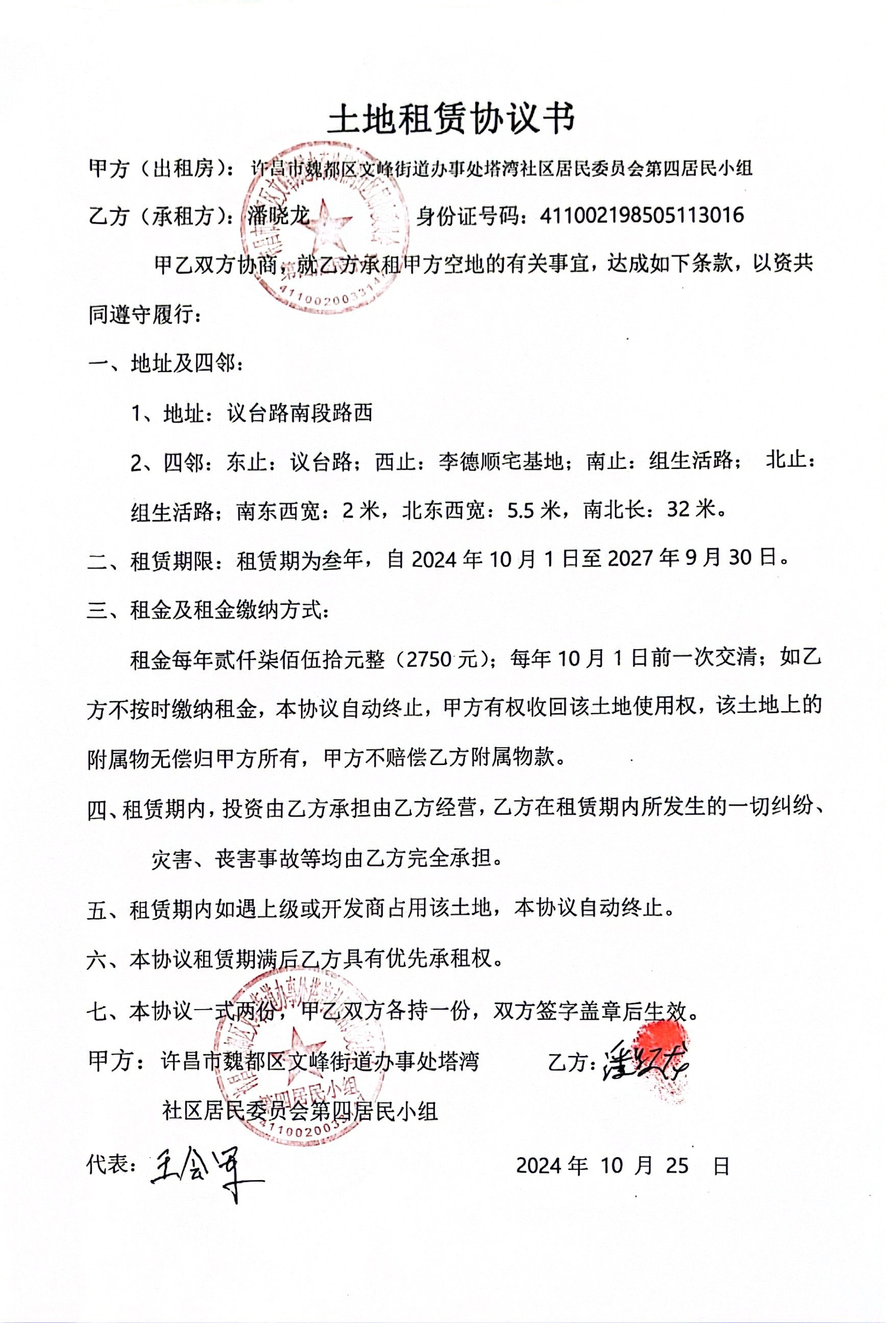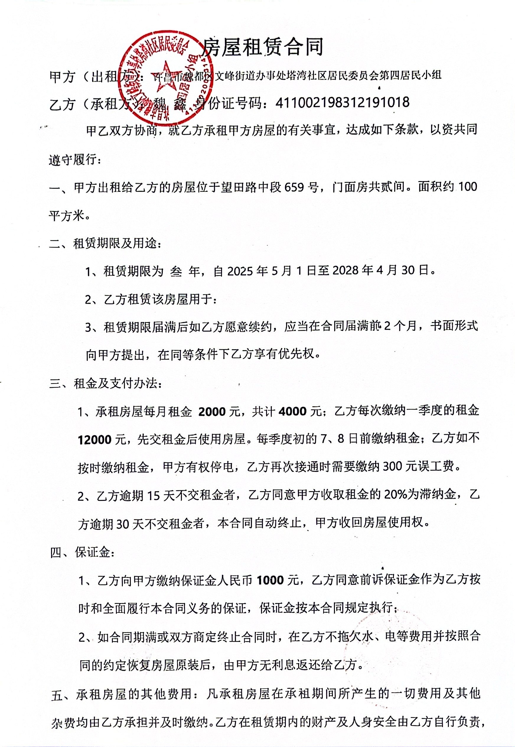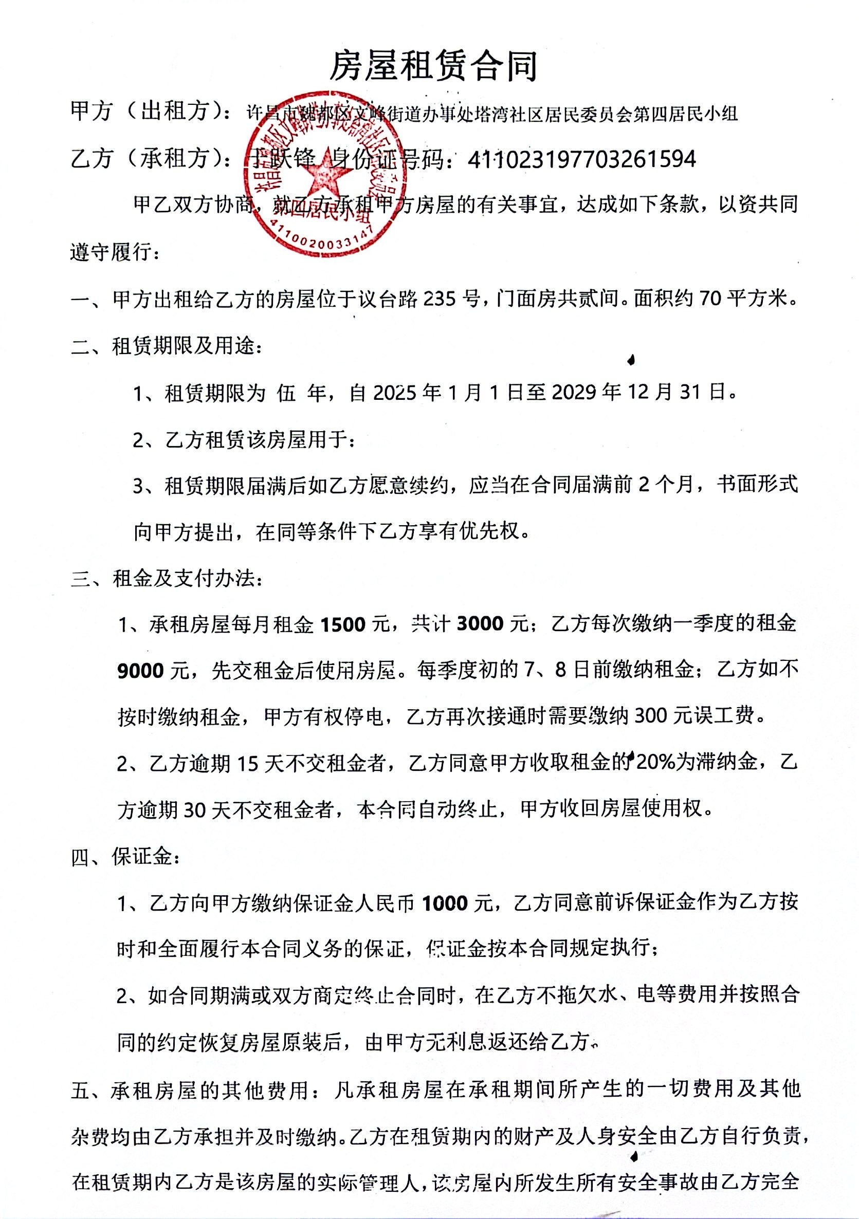 文峰办事处塔湾社区第五居民小组门面房及场院租赁协议