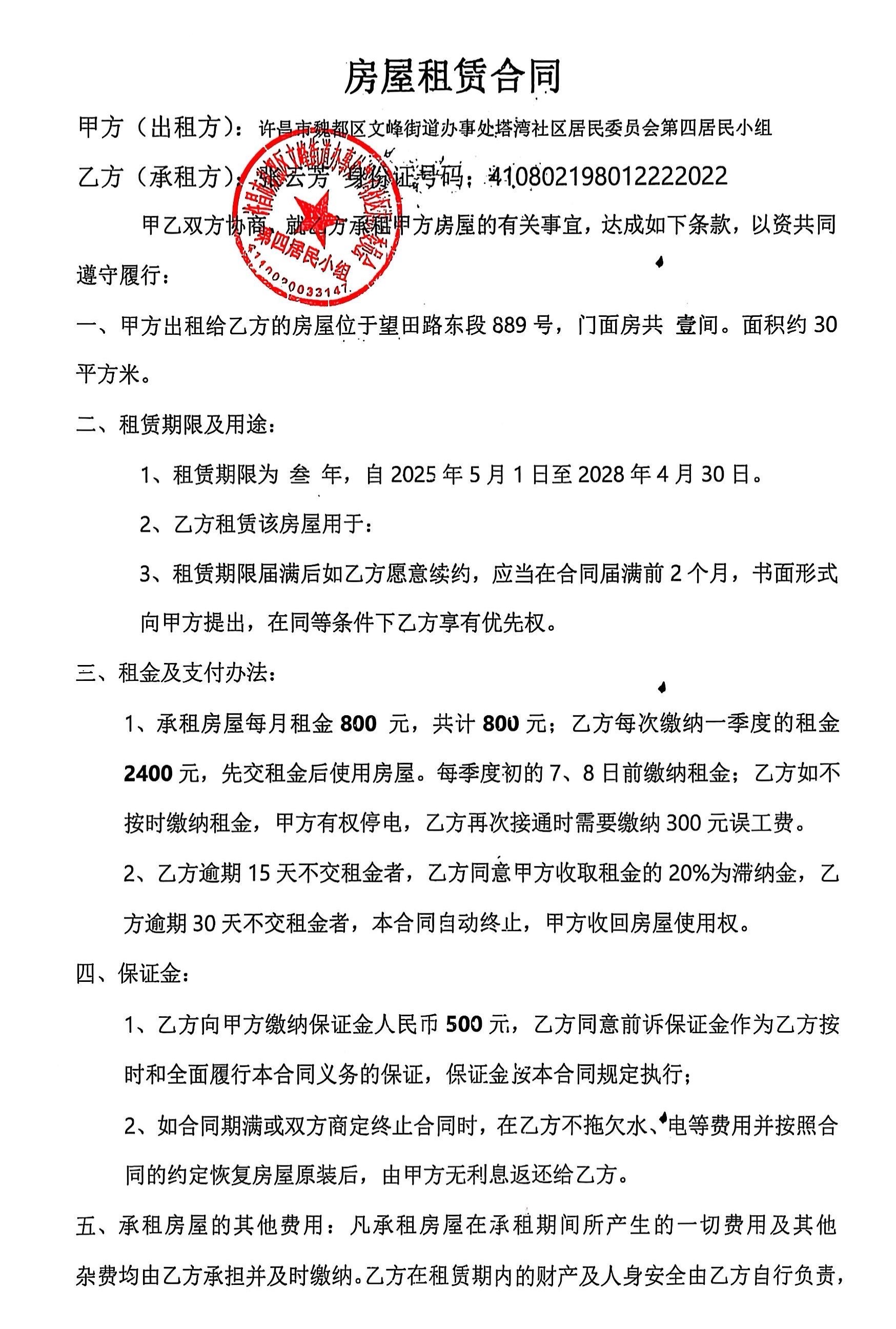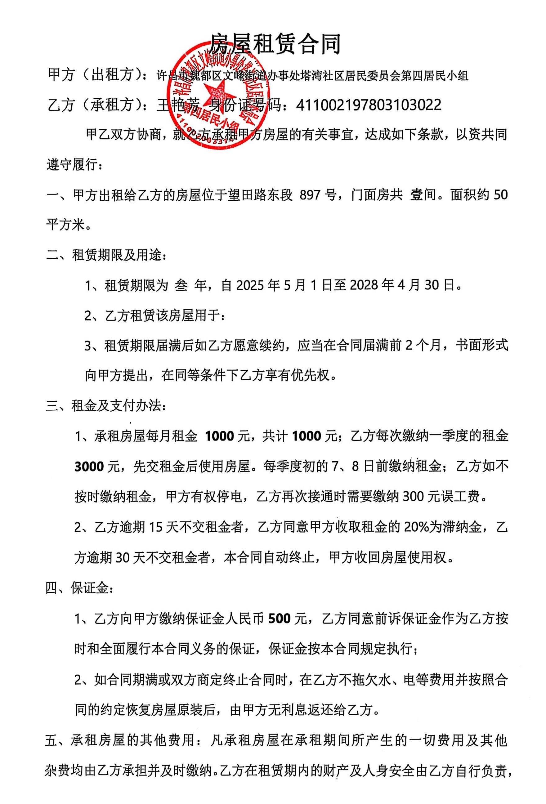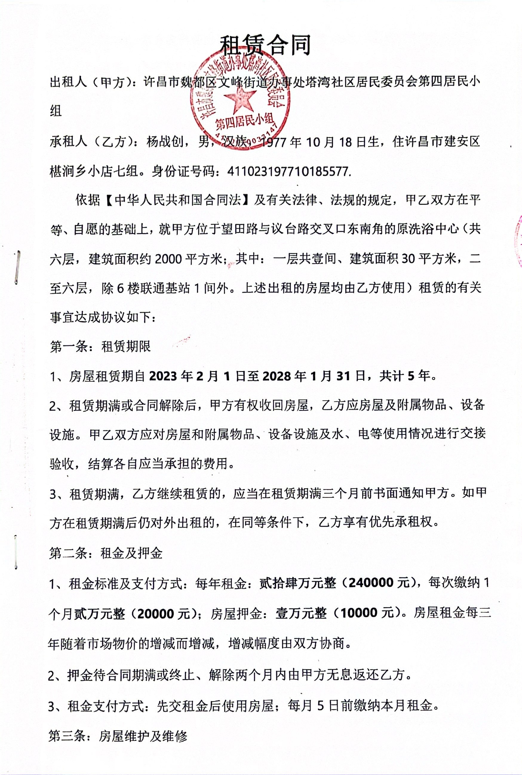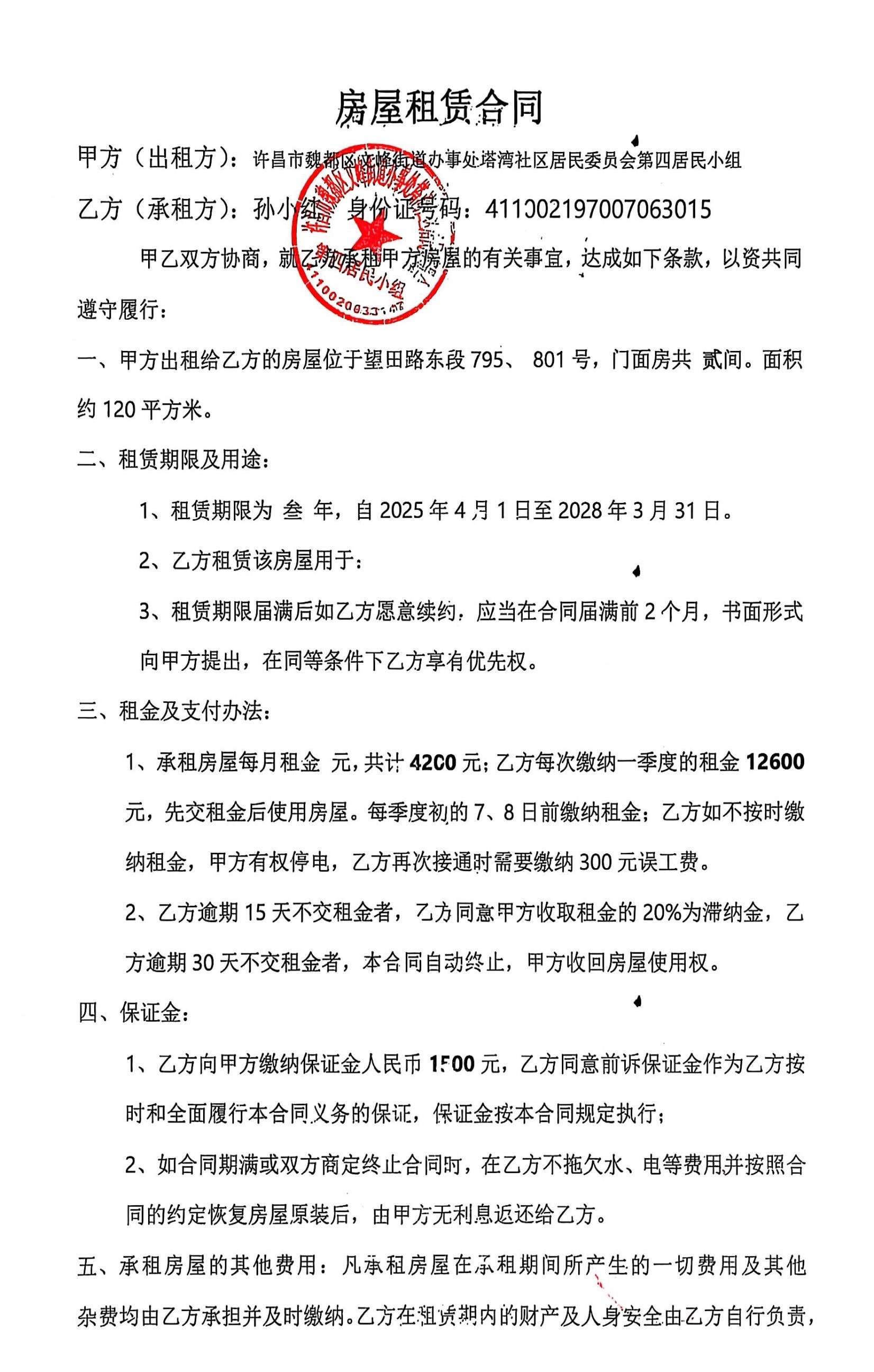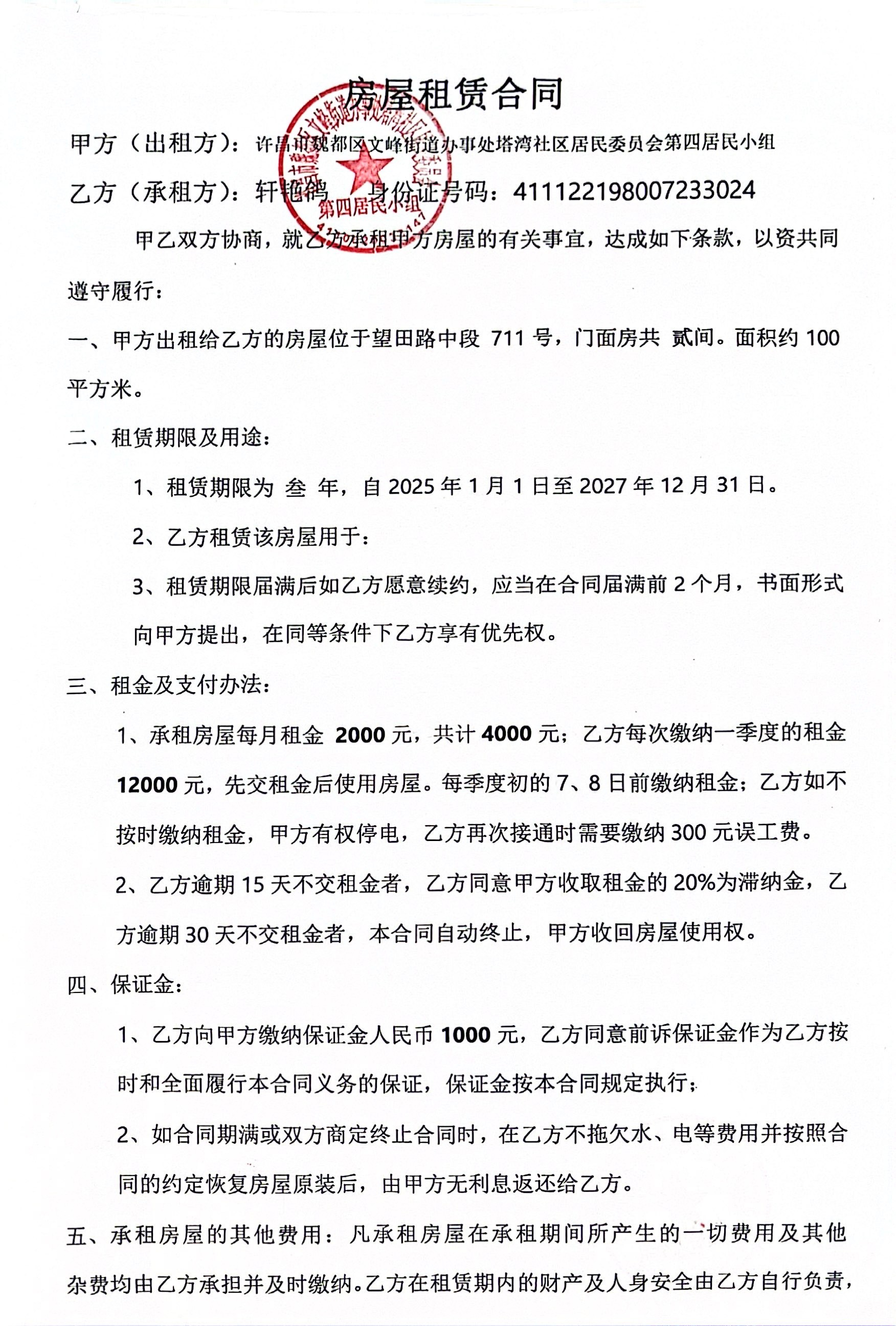 文峰办事处塔湾社区第五居民小组门面房及场院租赁协议