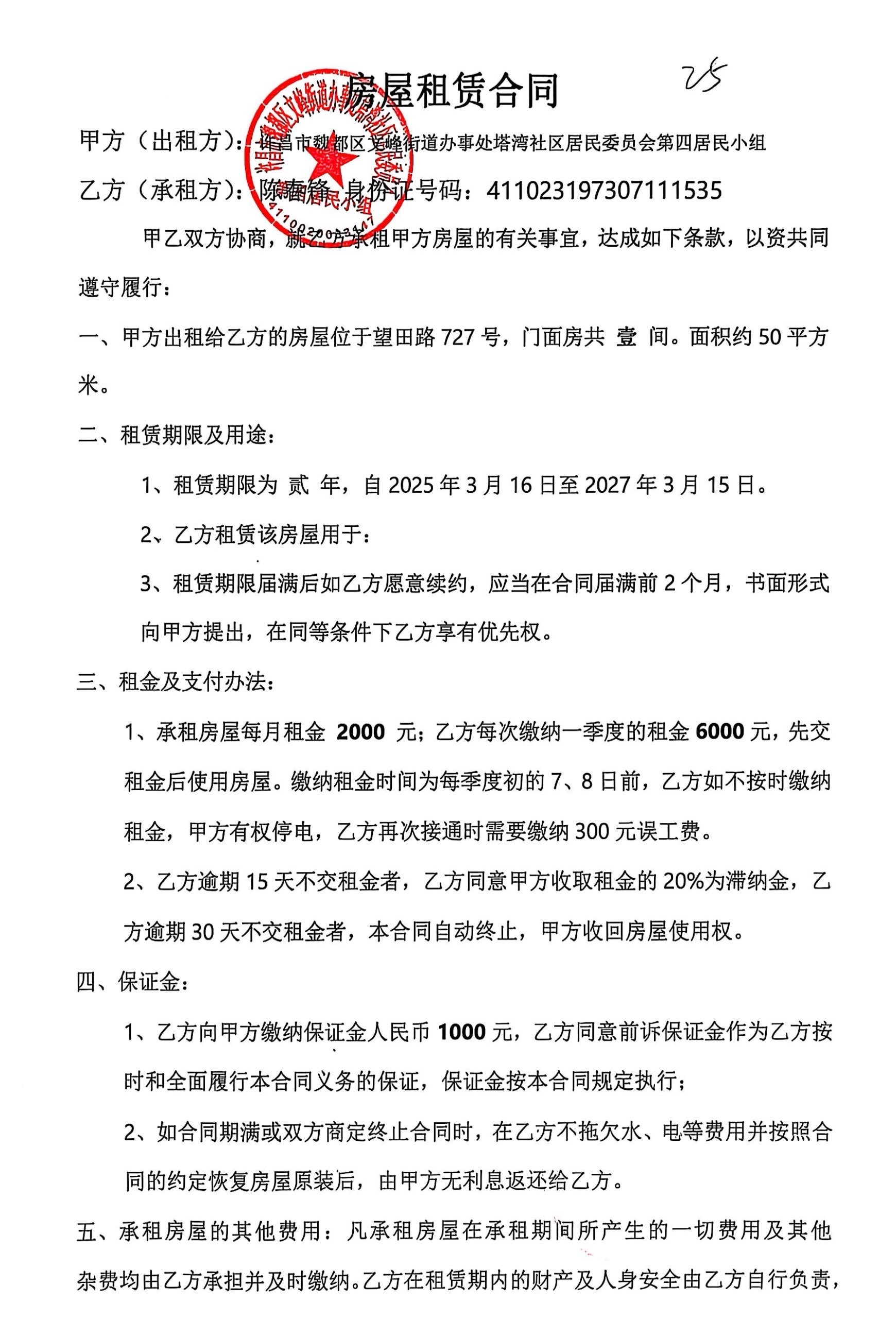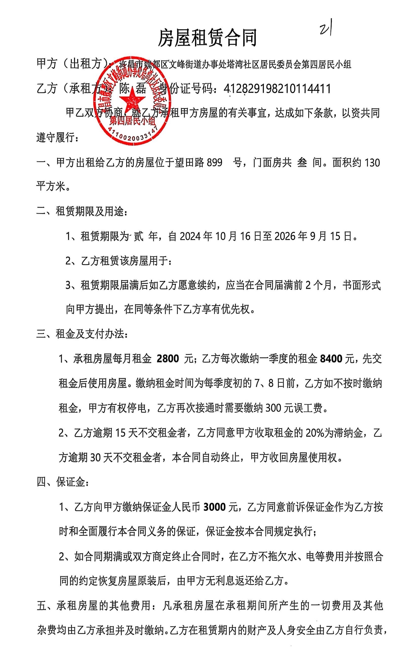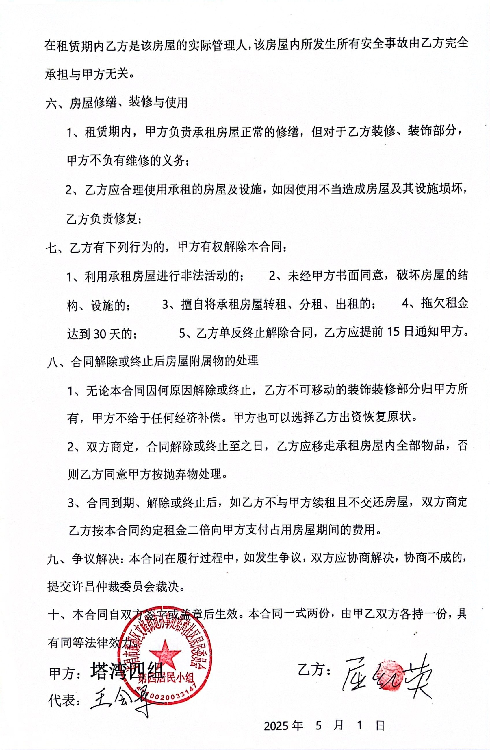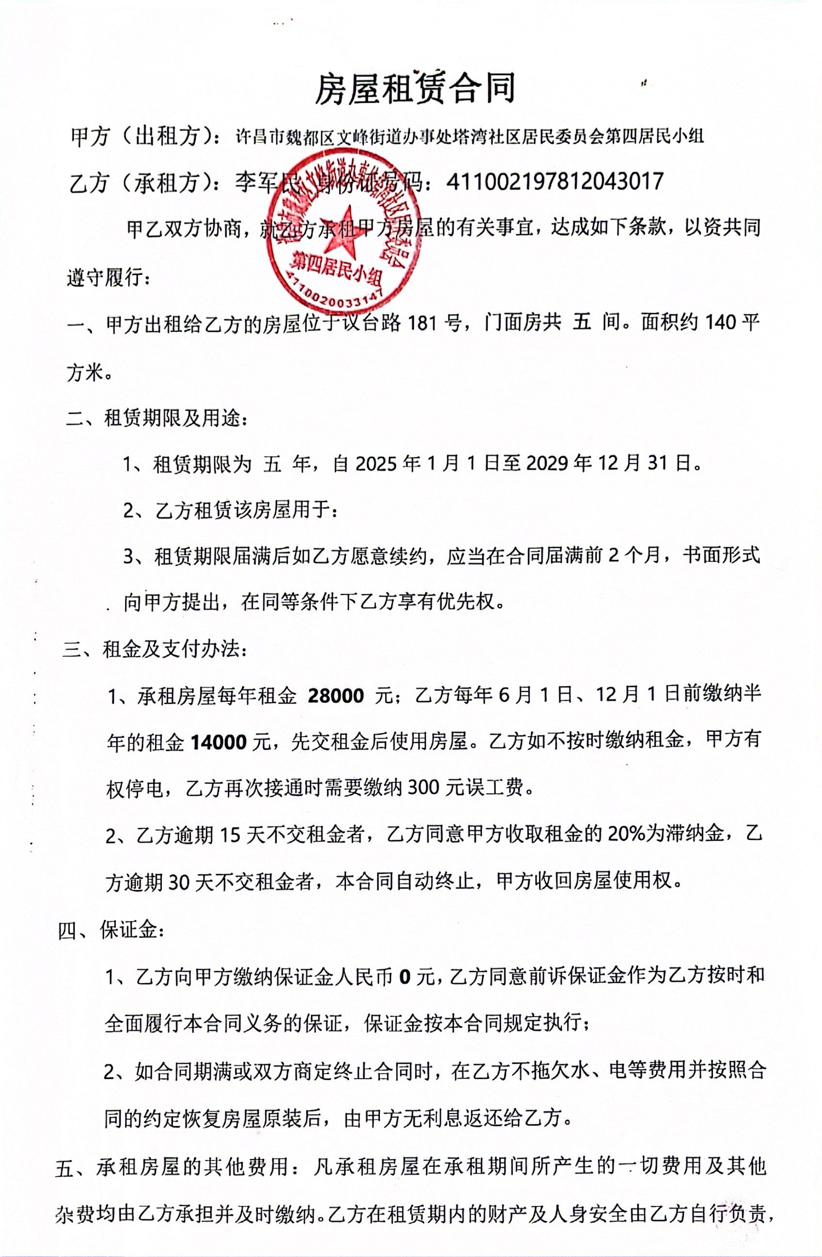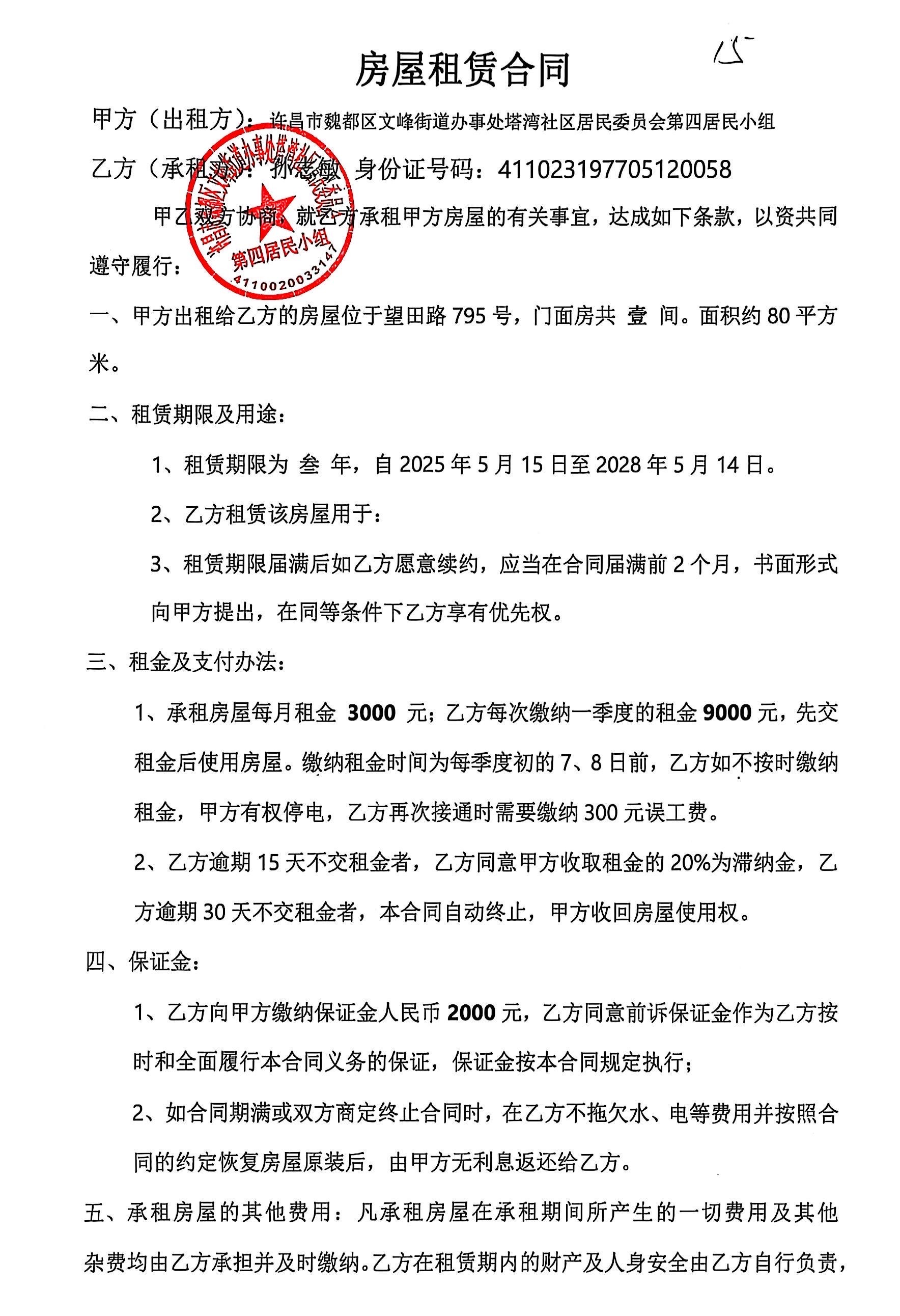 文峰办事处塔湾社区第五居民小组门面房及场院租赁协议
