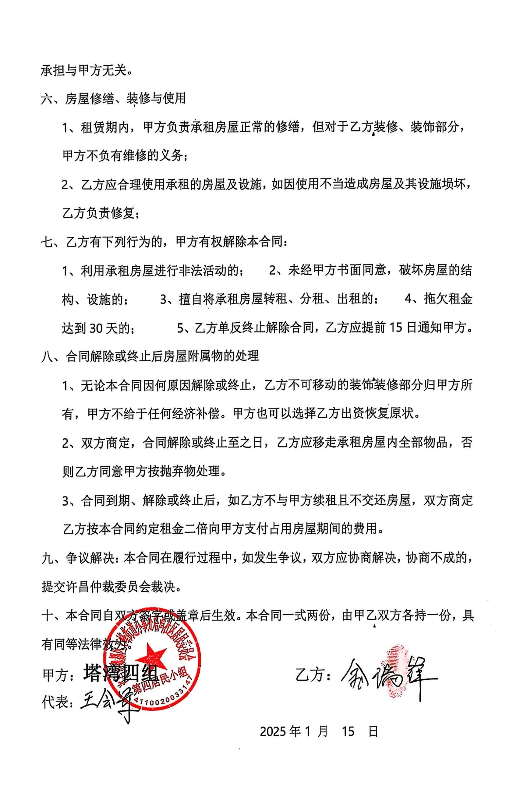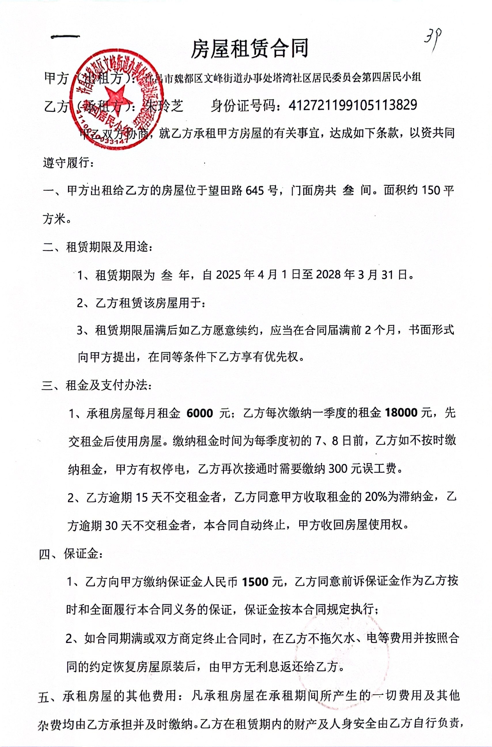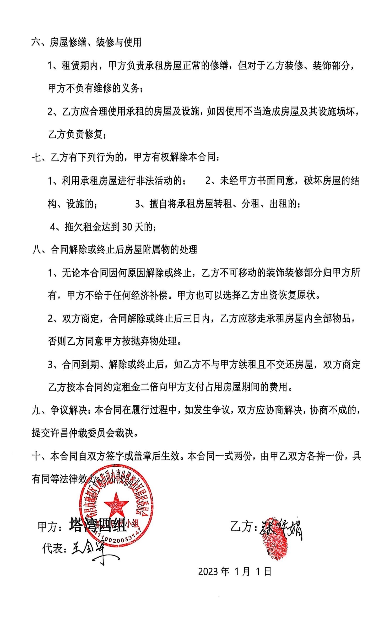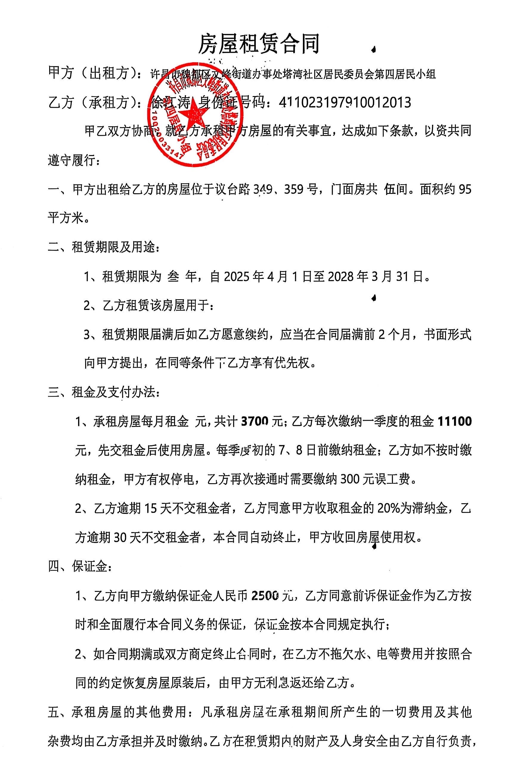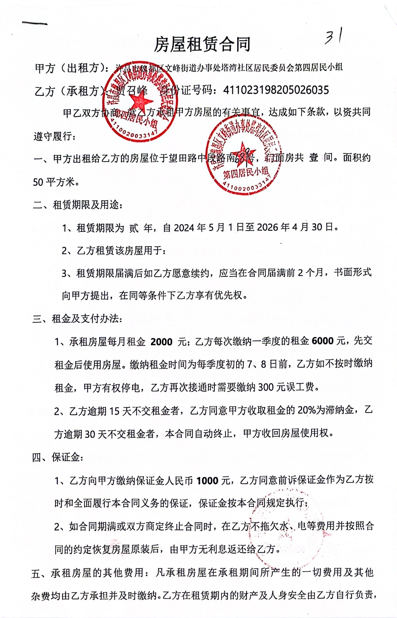 文峰办事处塔湾社区第五居民小组门面房及场院租赁协议