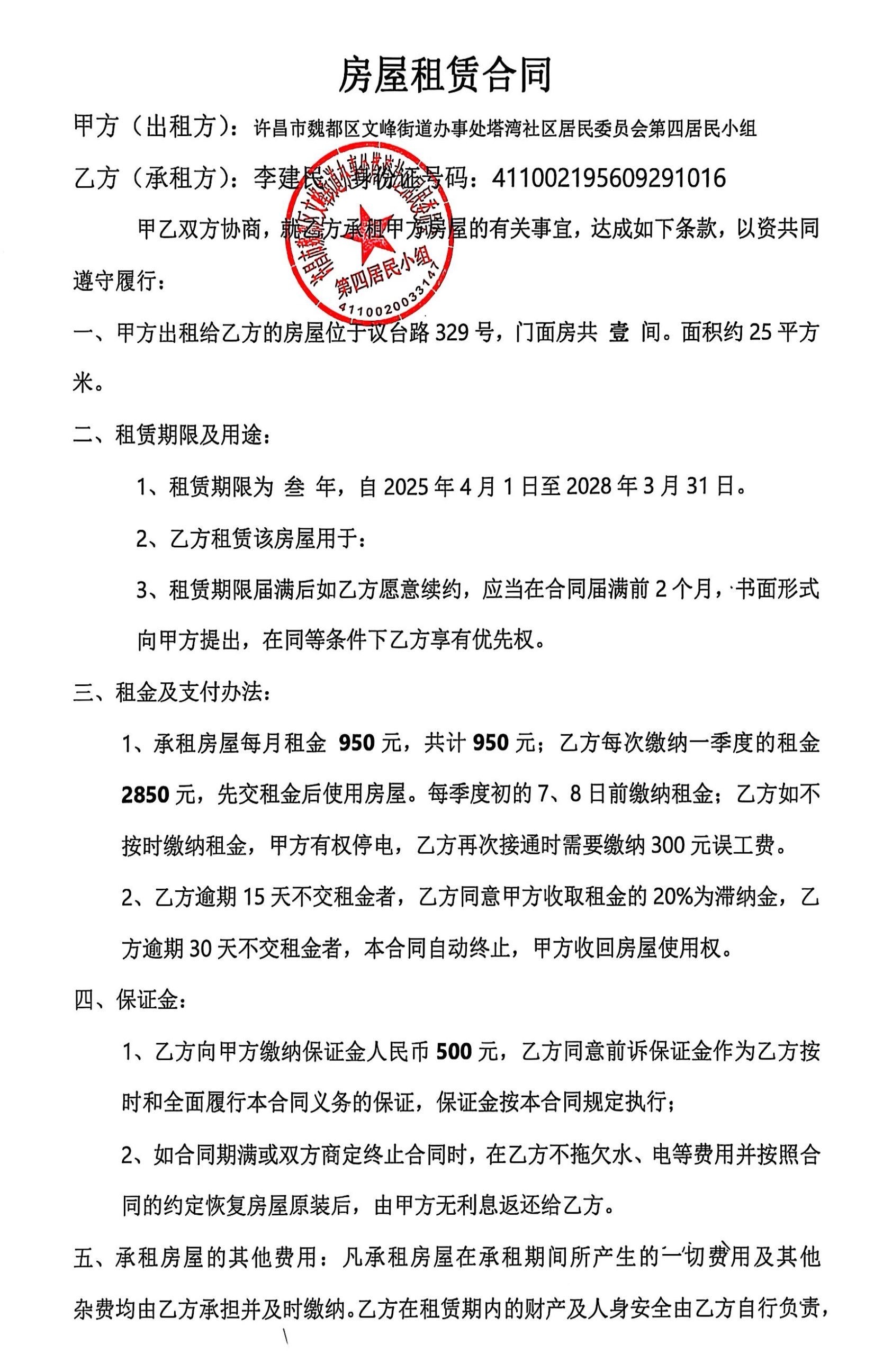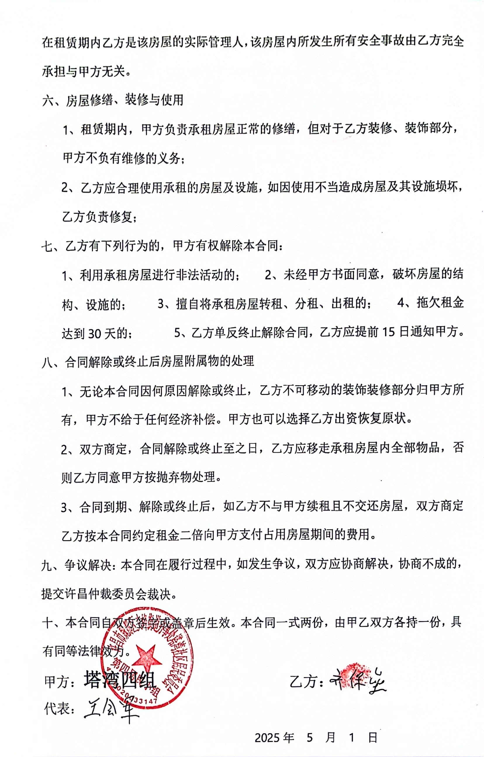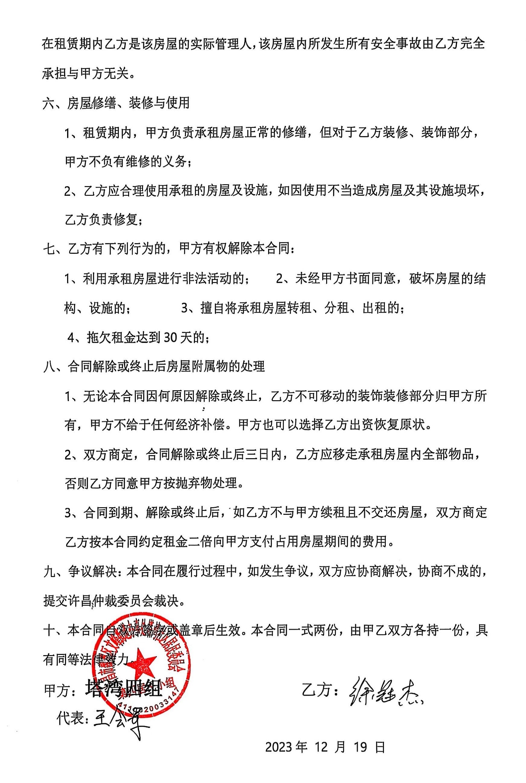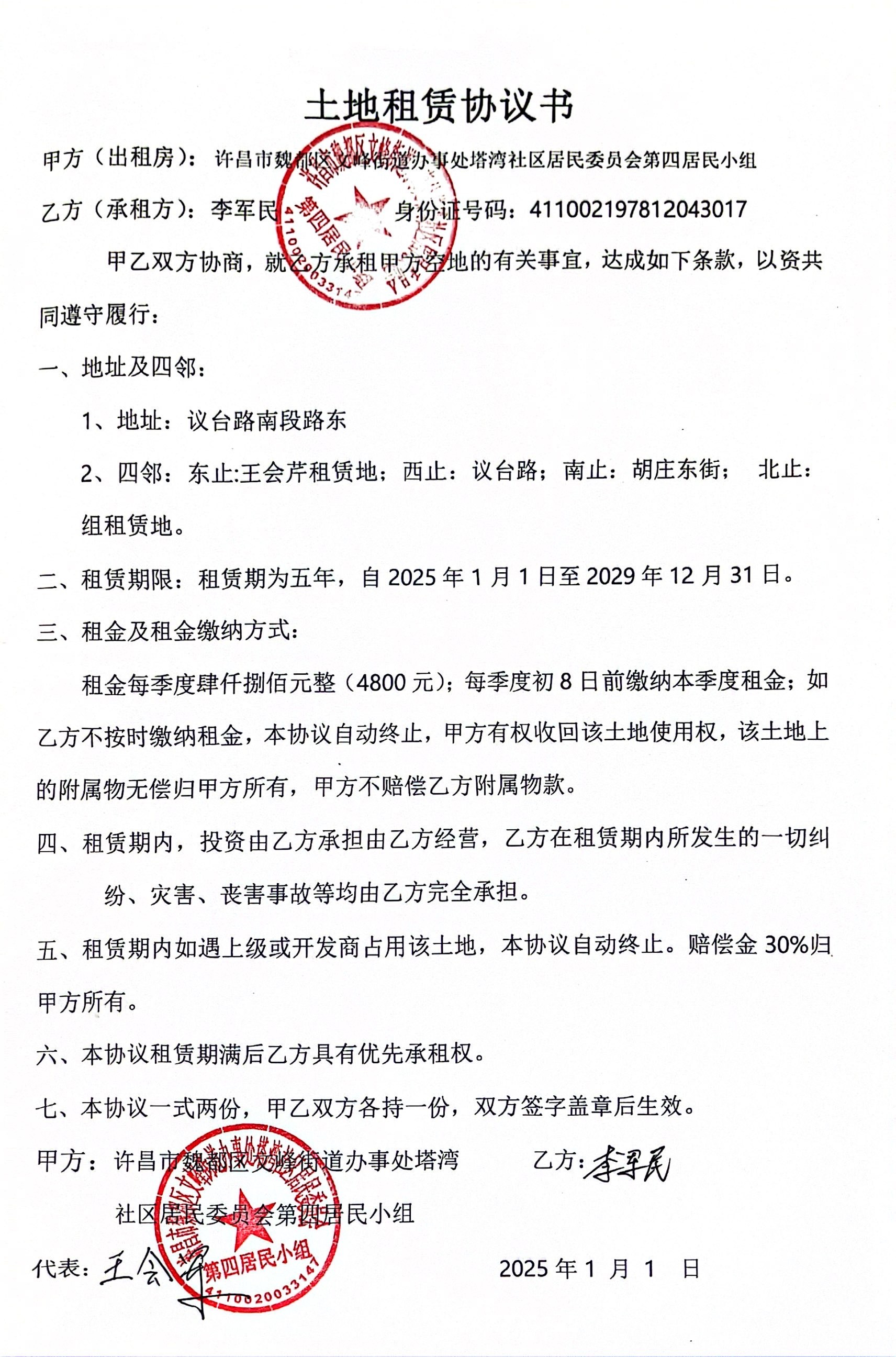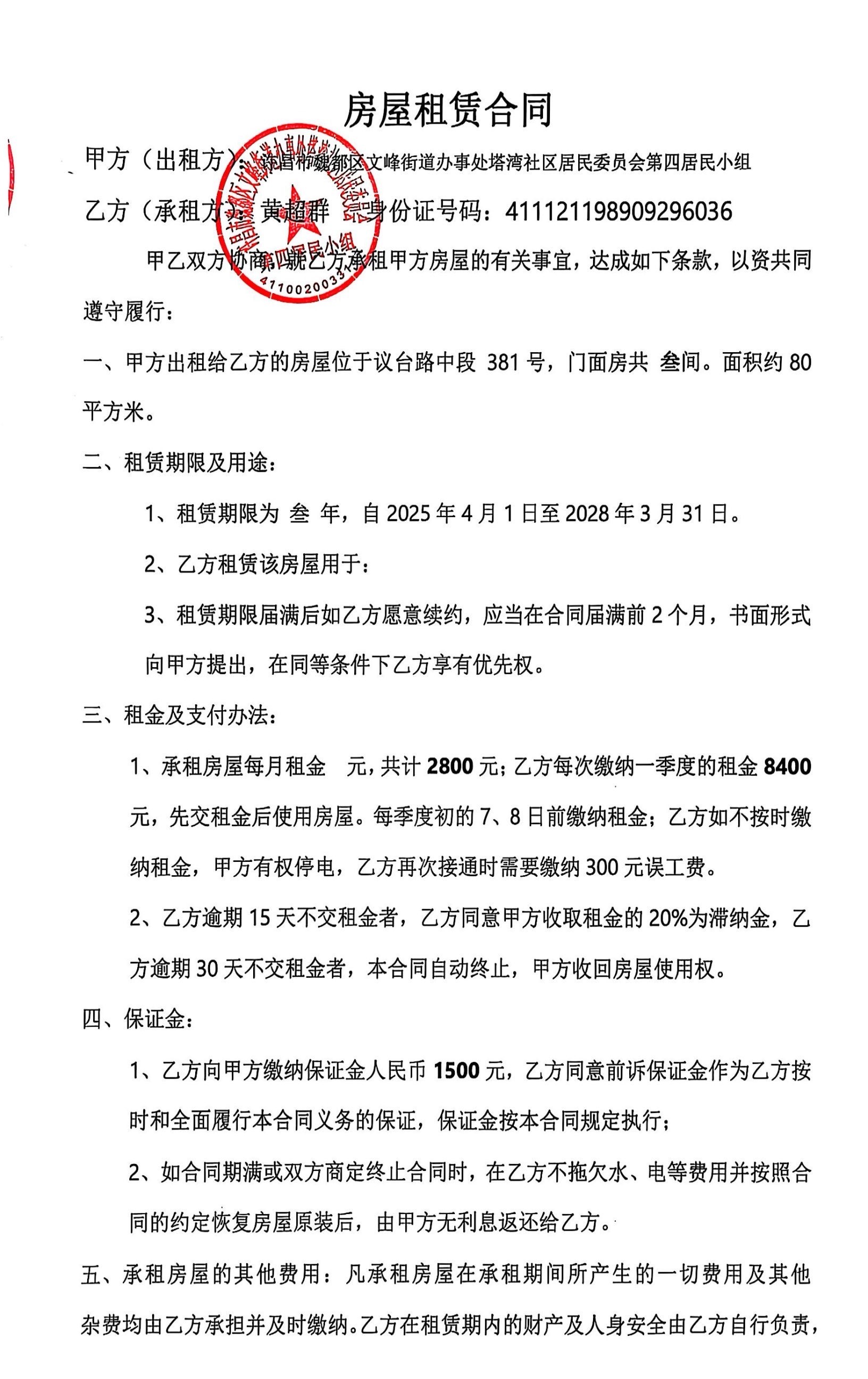 文峰办事处塔湾社区第五居民小组门面房及场院租赁协议