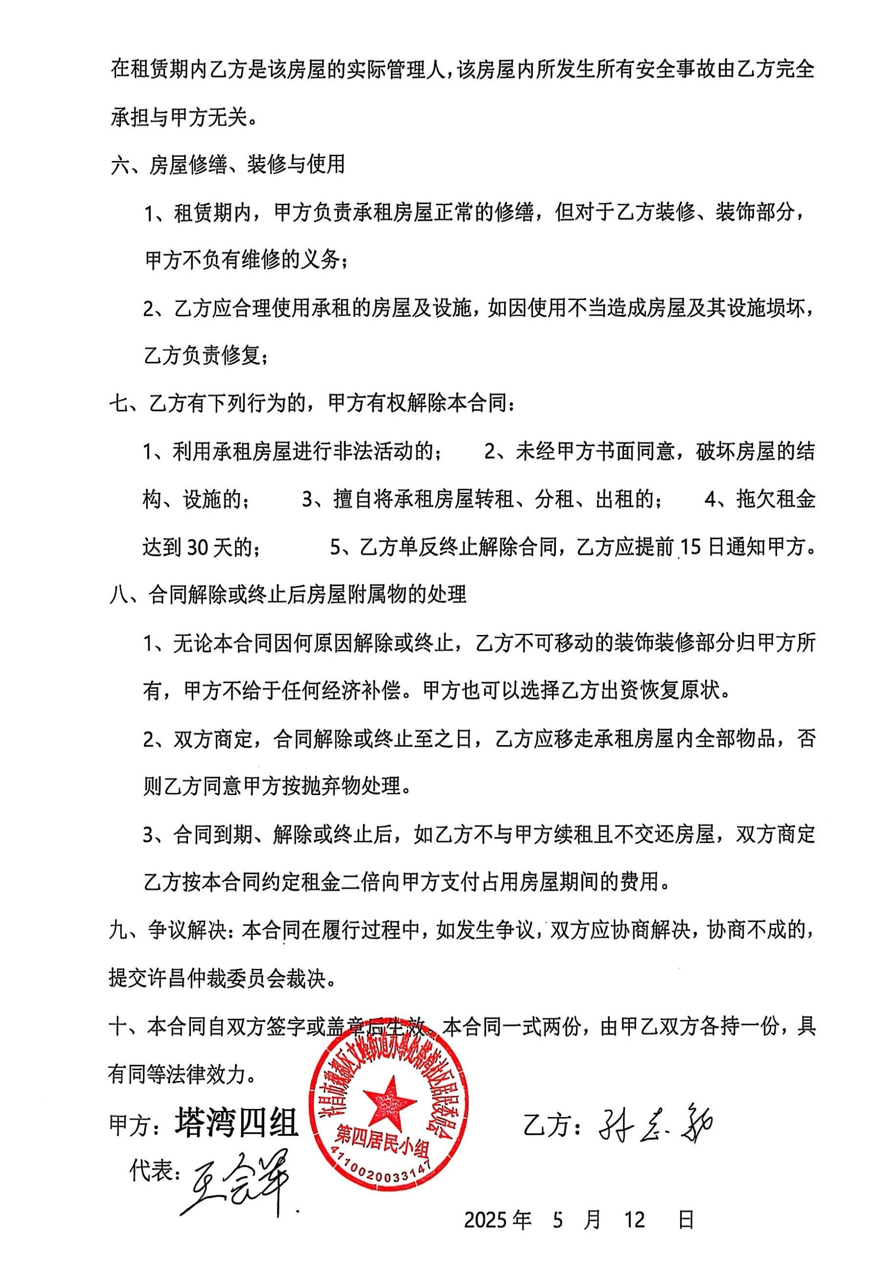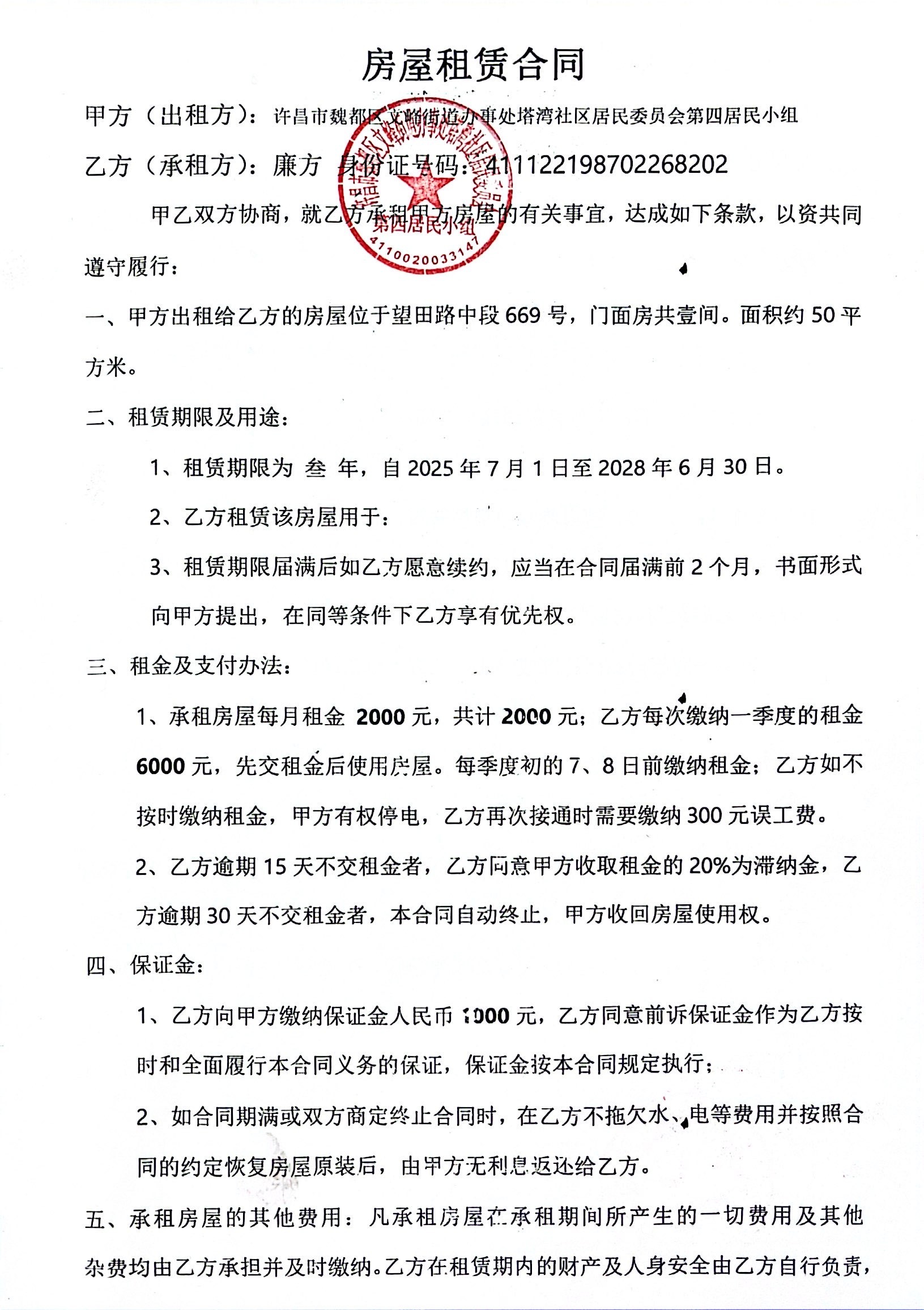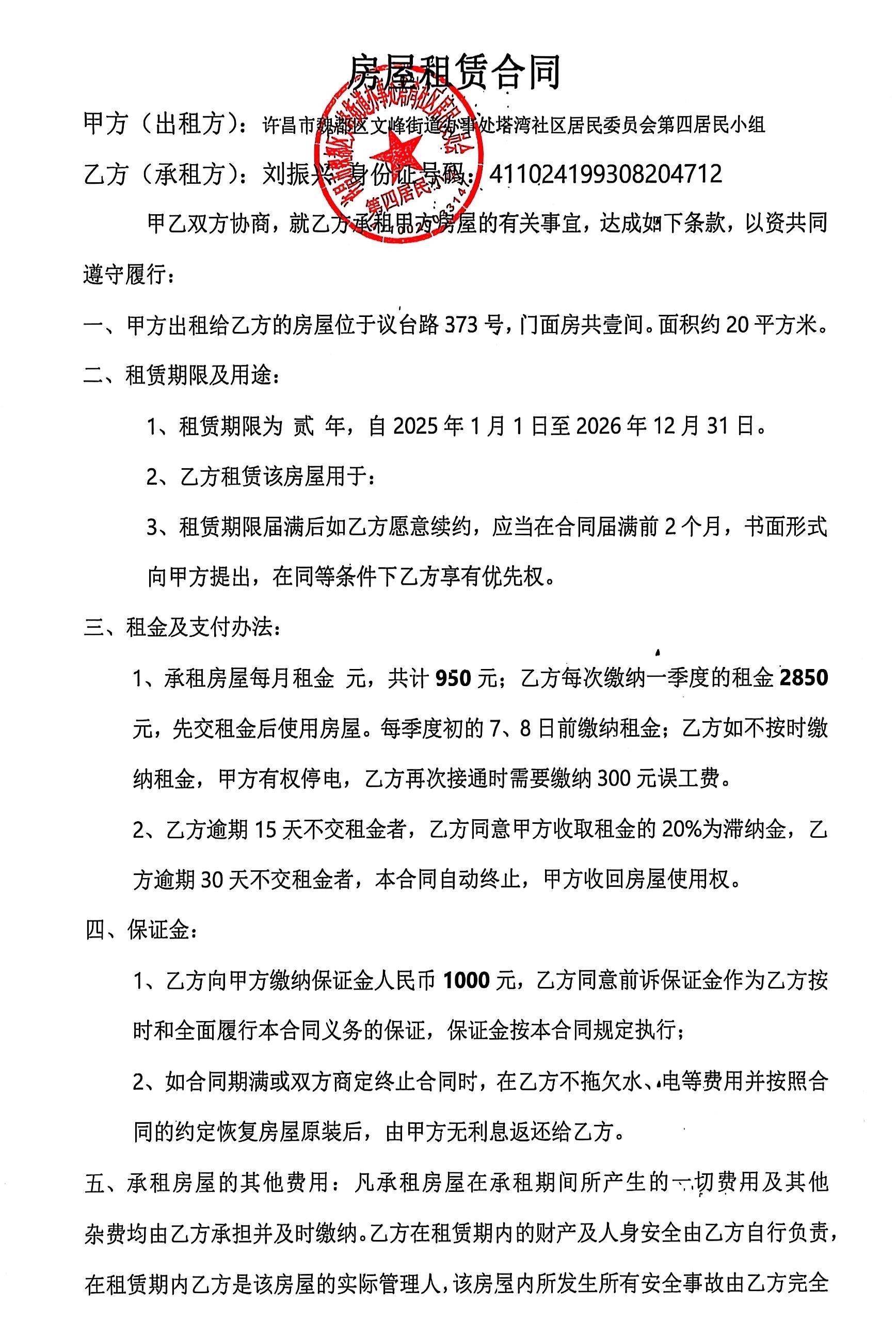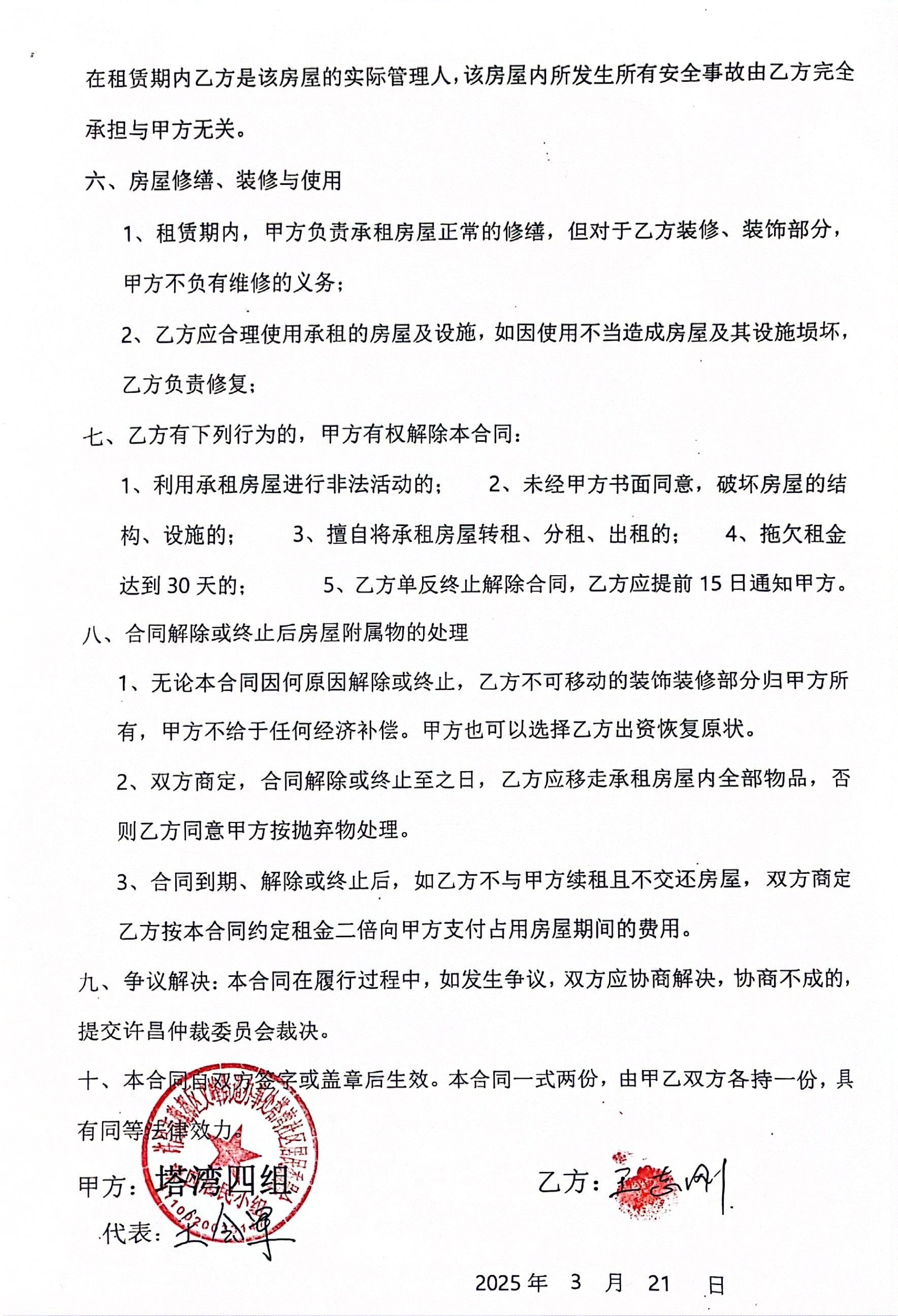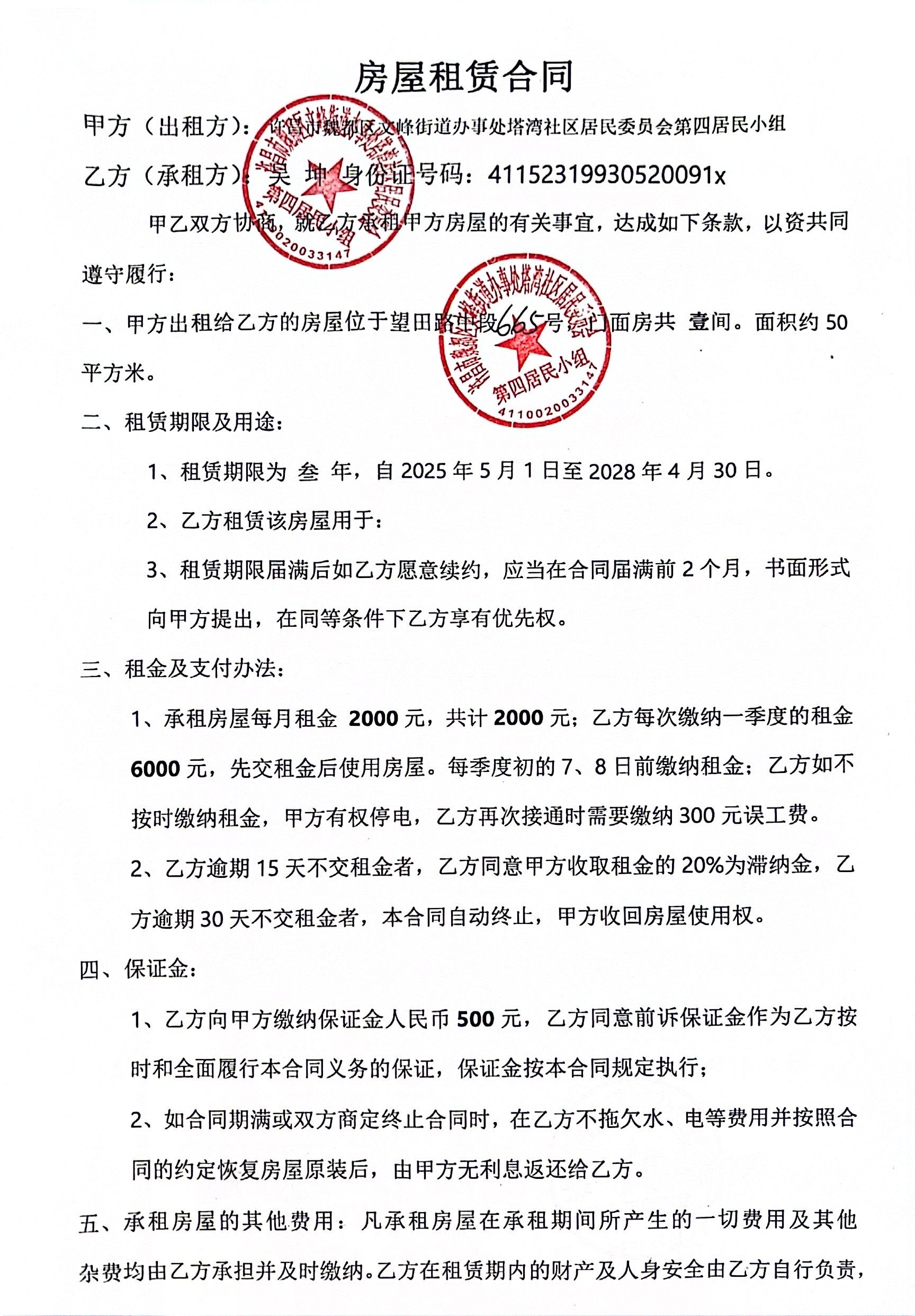 文峰办事处塔湾社区第五居民小组门面房及场院租赁协议