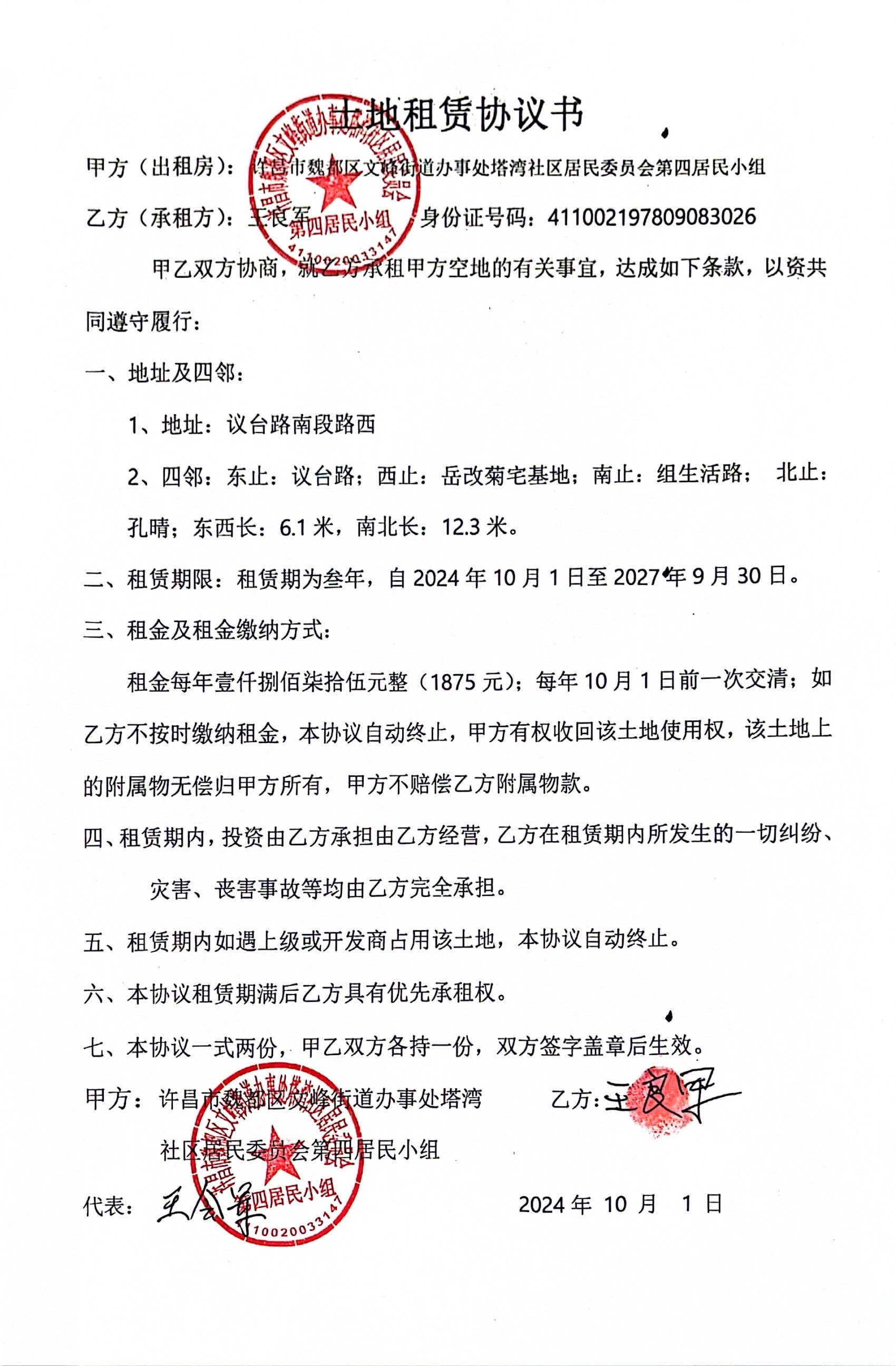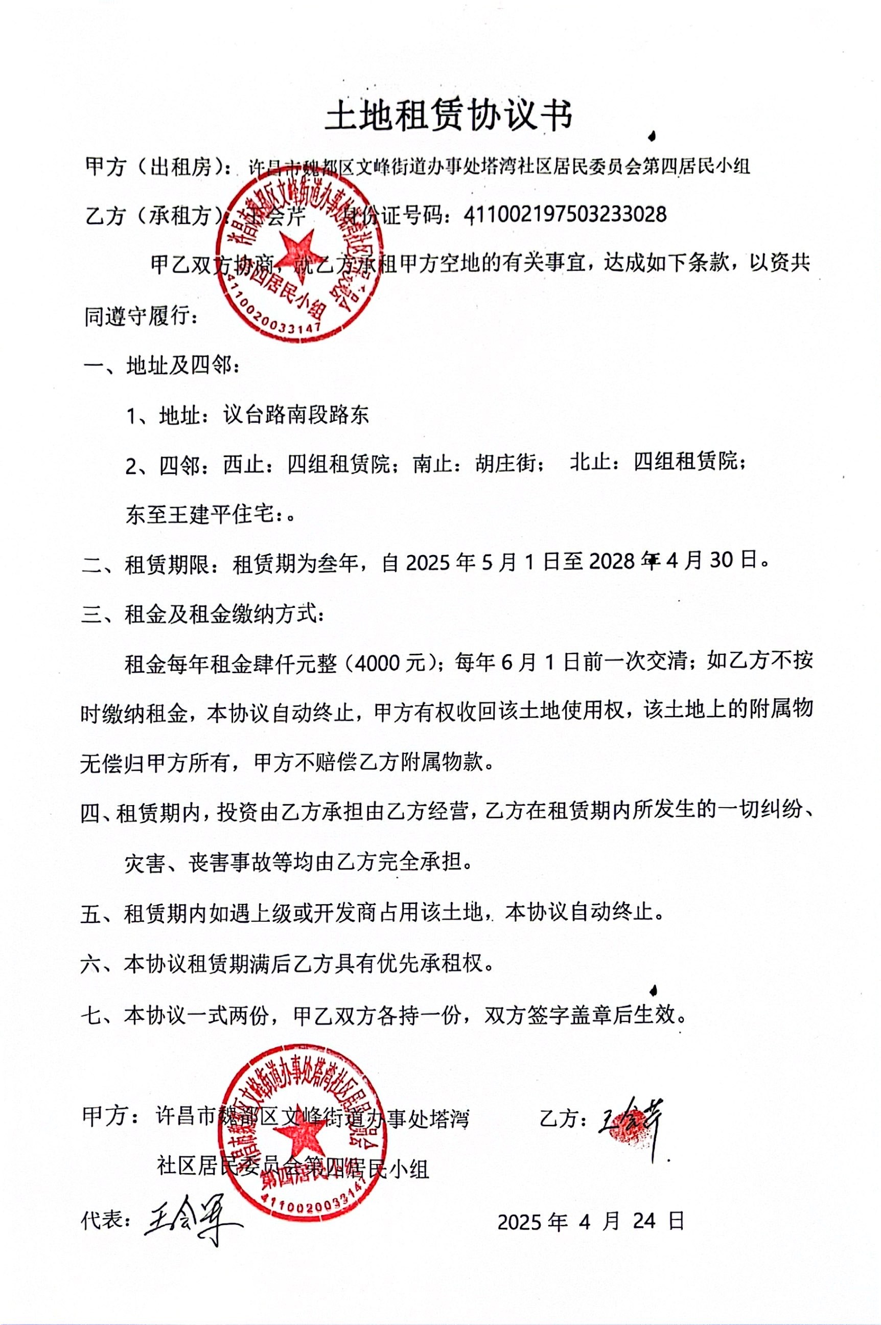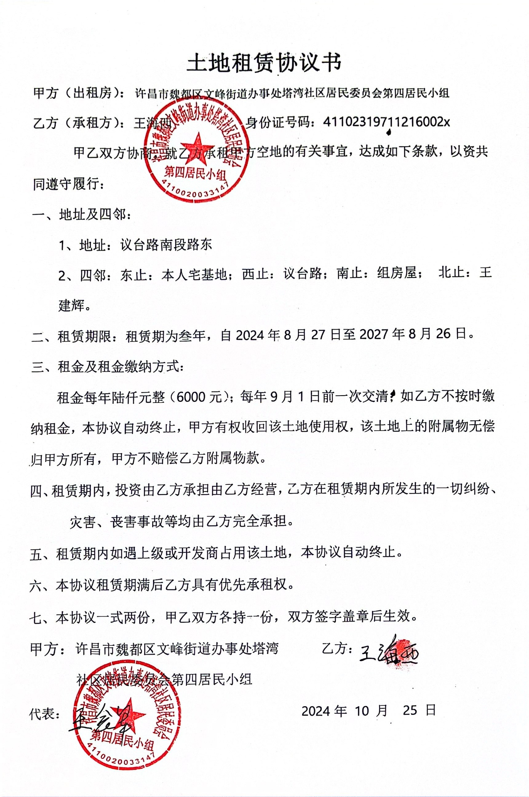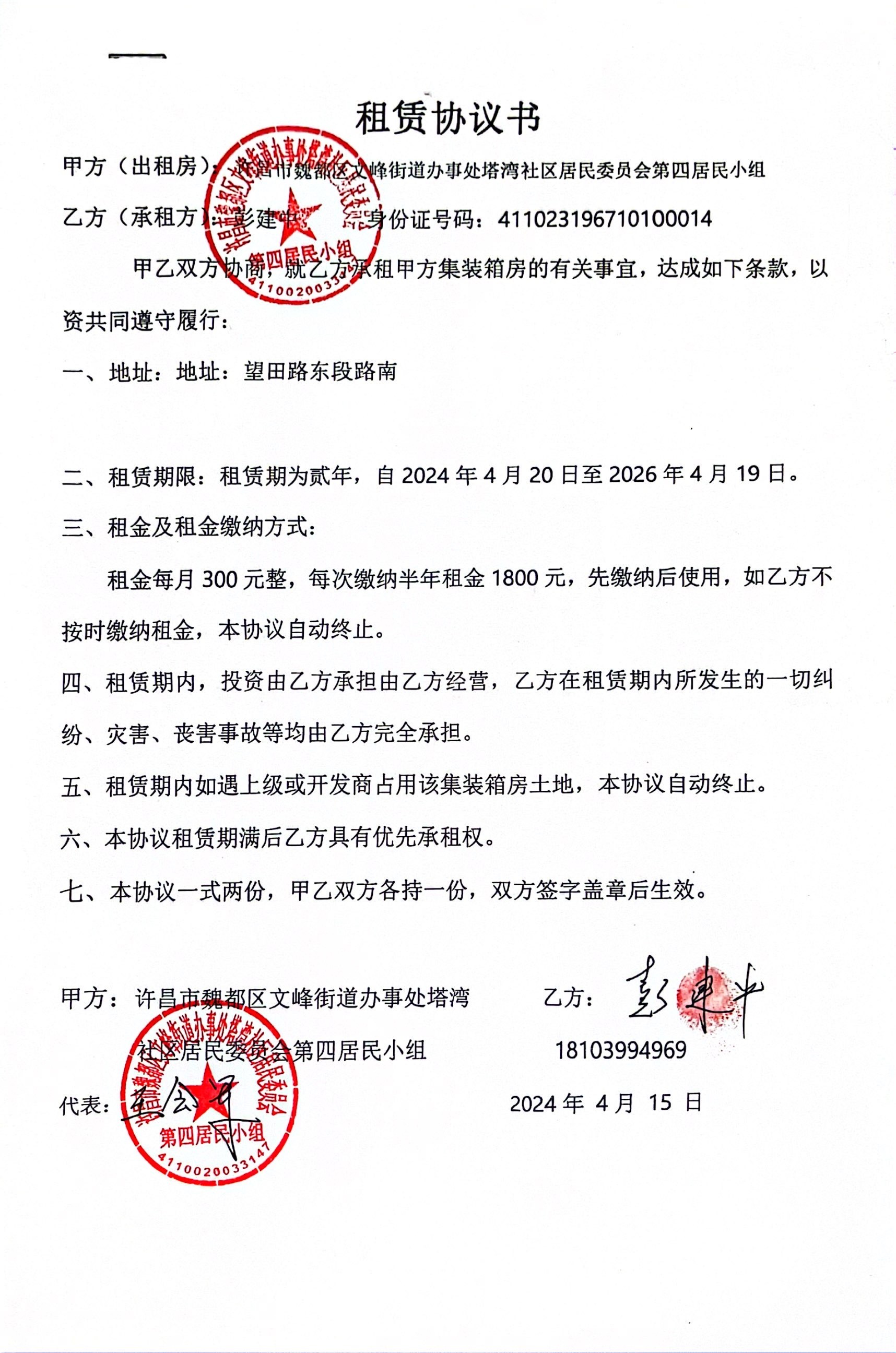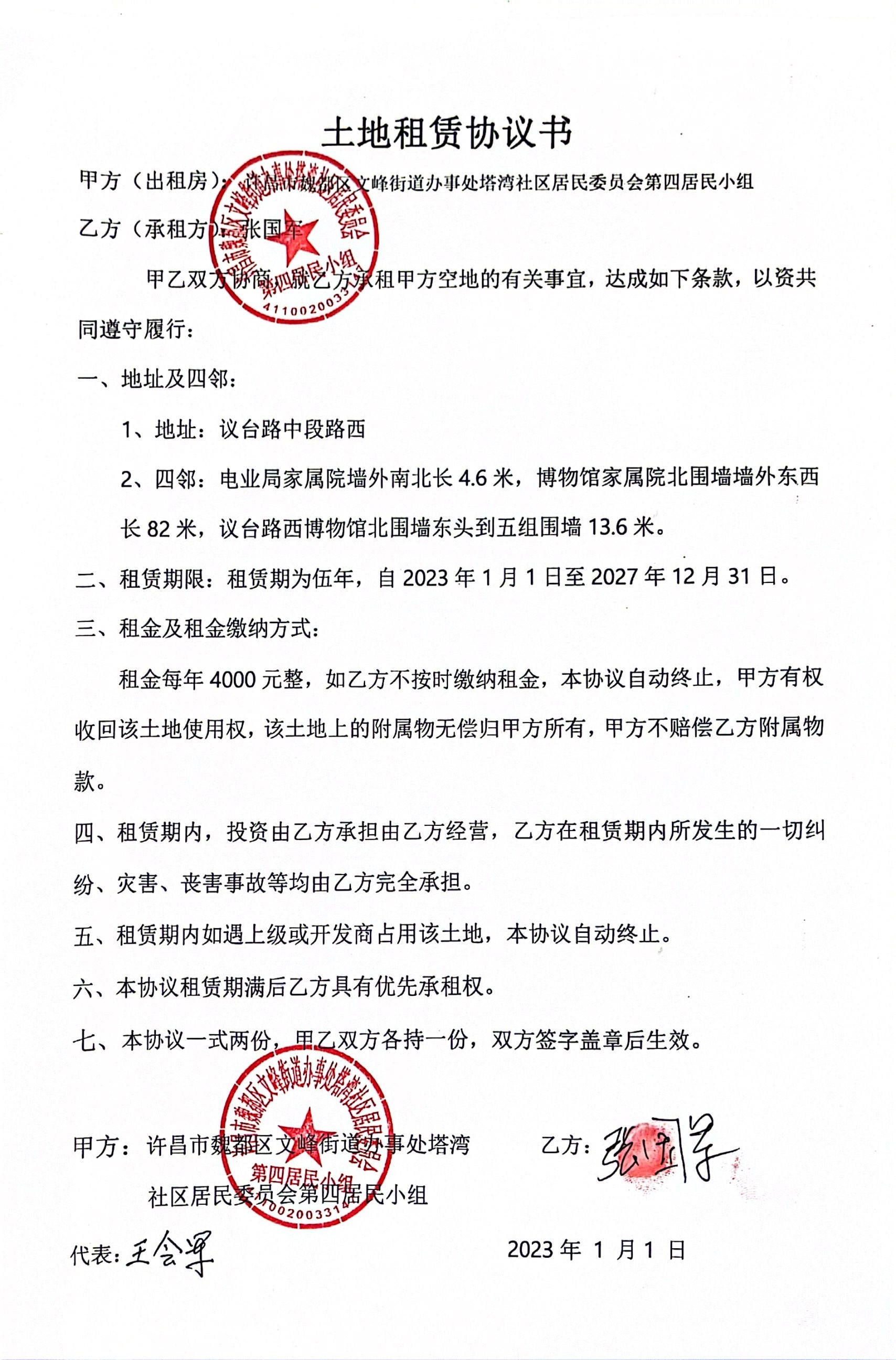 文峰办事处塔湾社区第四居民小组门面房及场院租赁协议