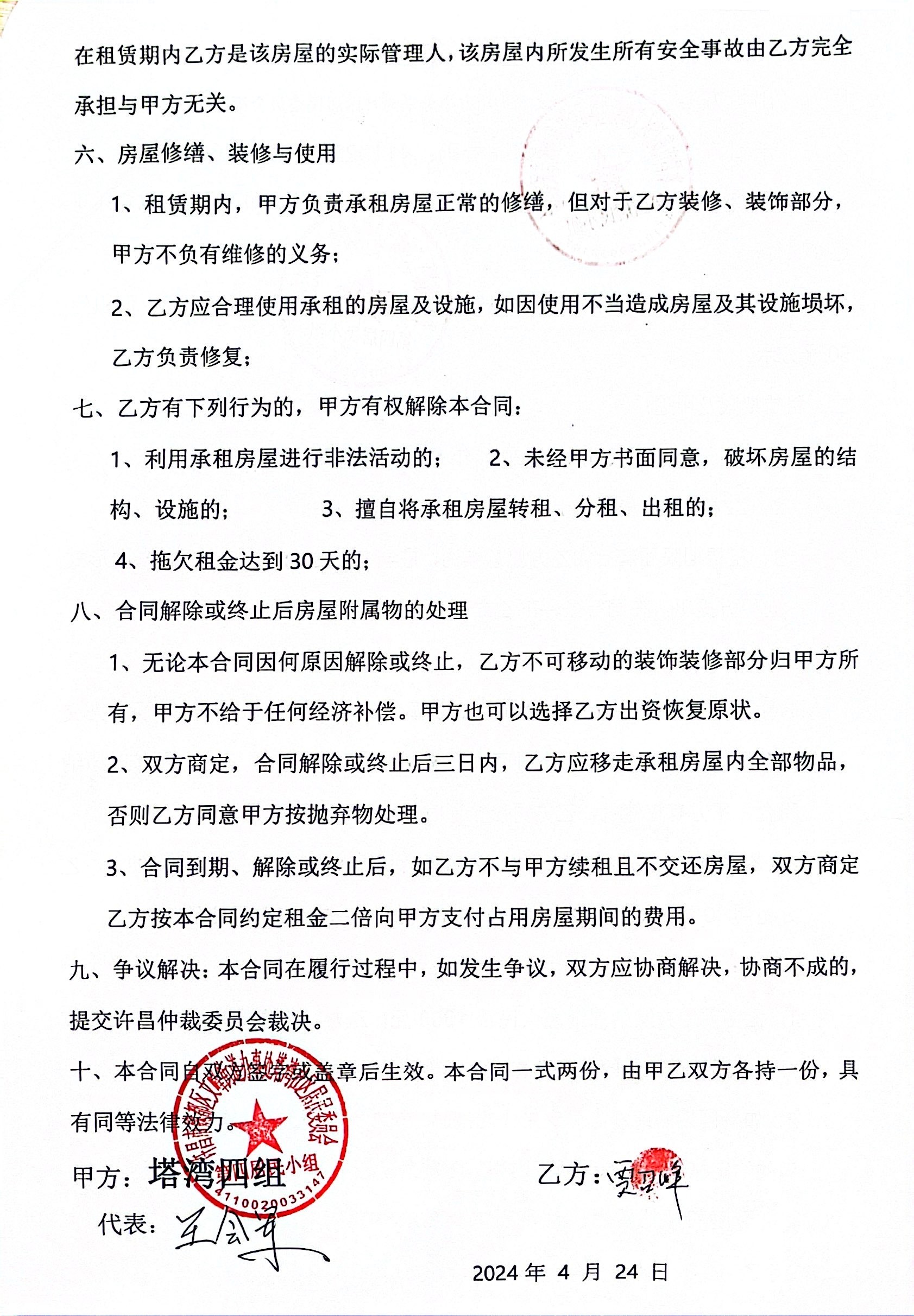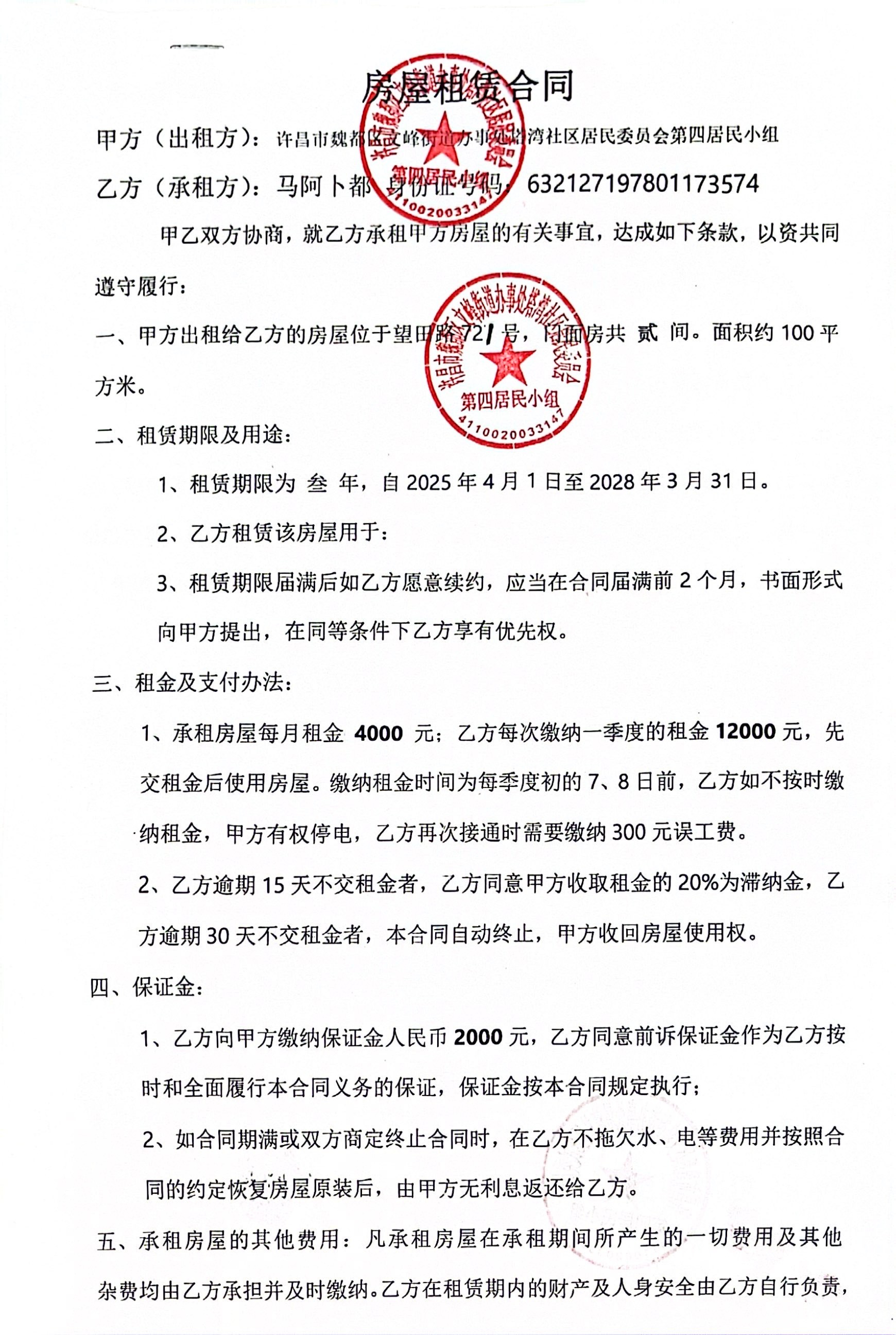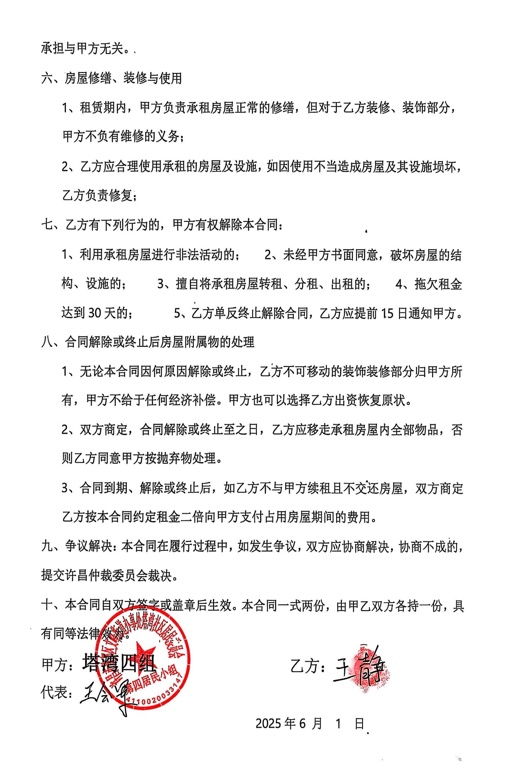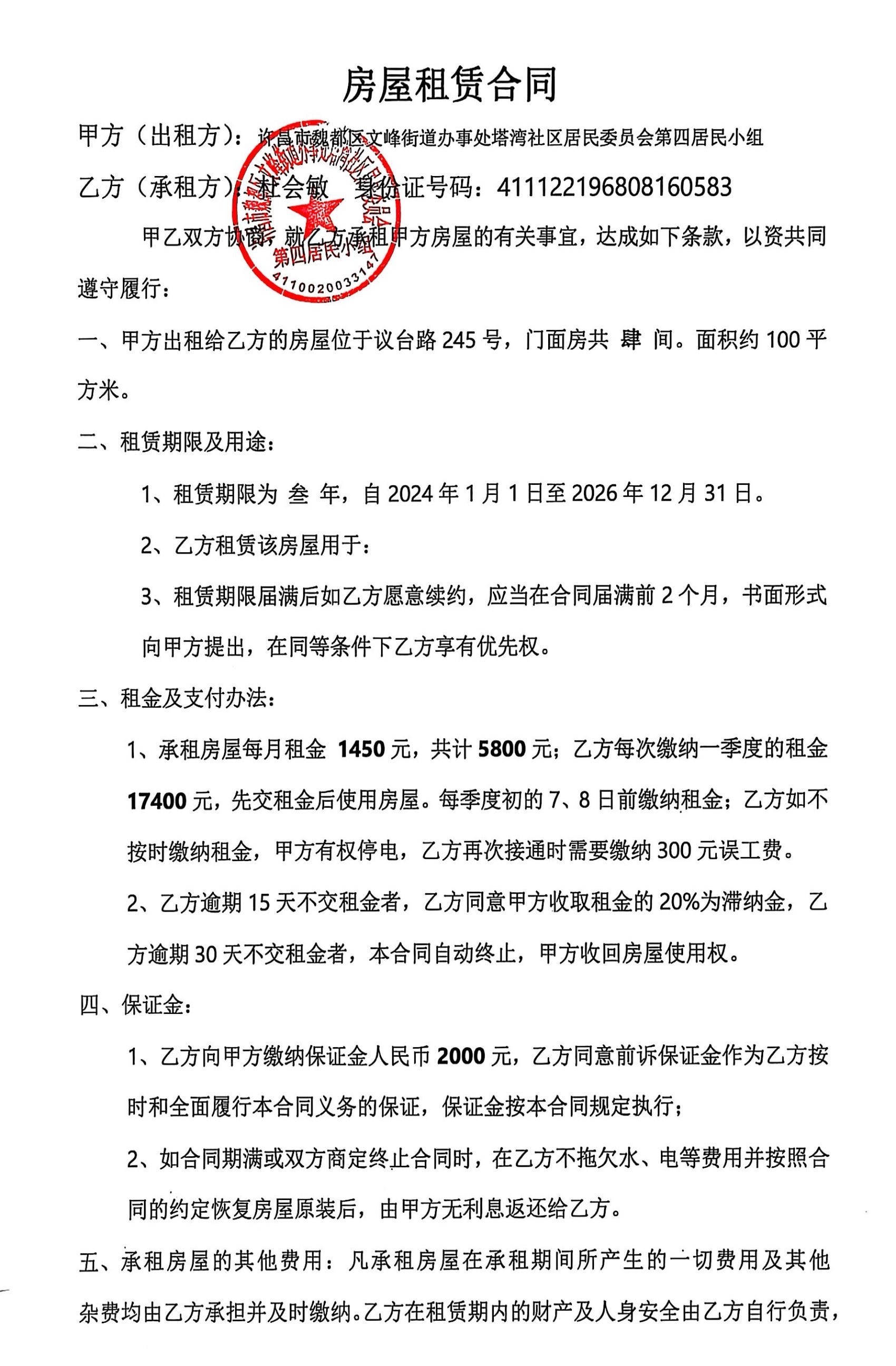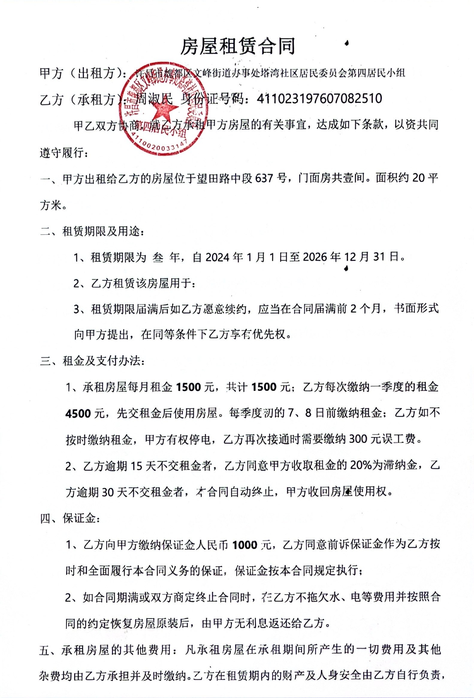 文峰办事处塔湾社区第四居民小组门面房及场院租赁协议