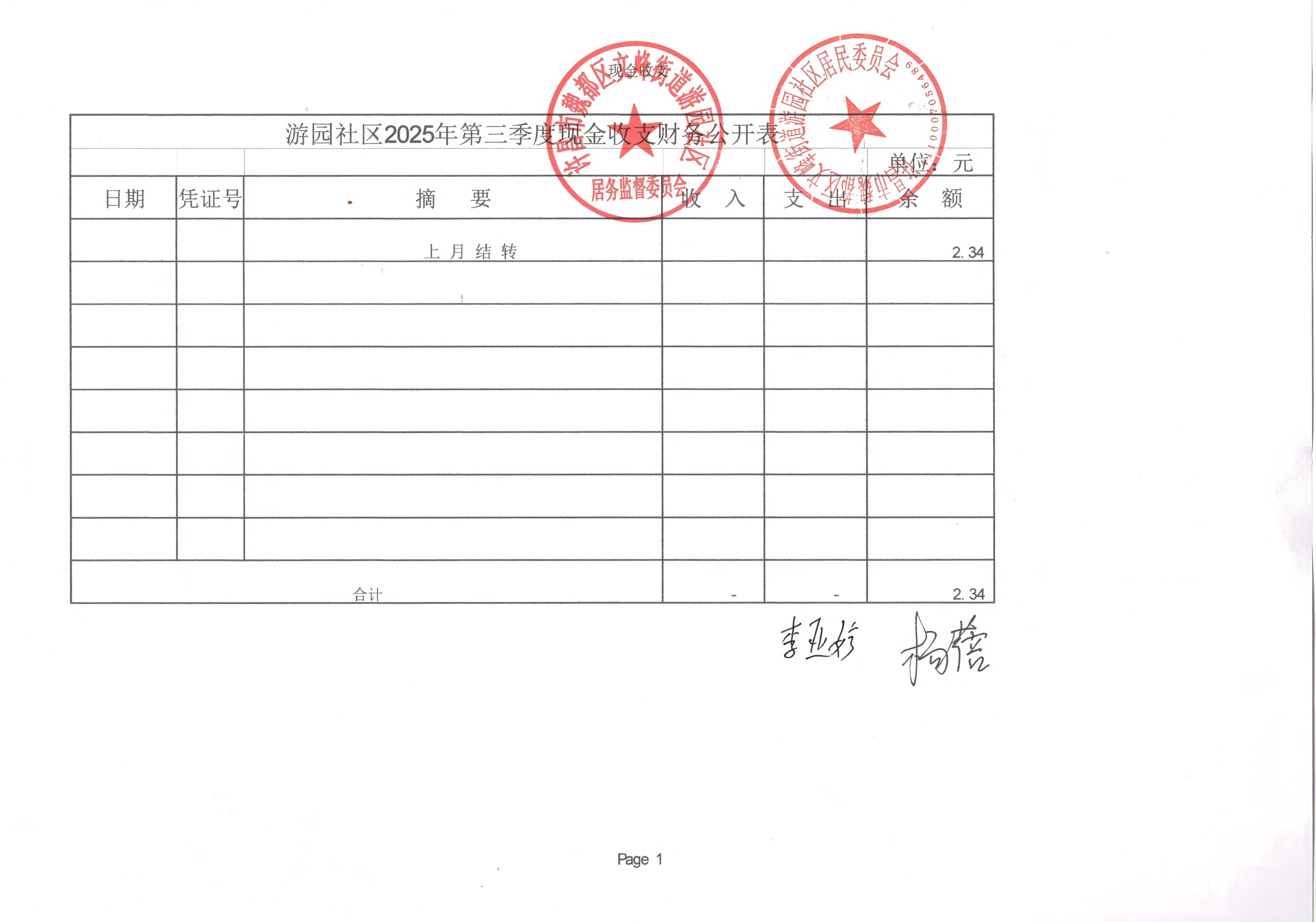 文峰办事处游园社区2025年第三季度现金、银行存款收支公开表