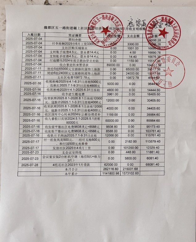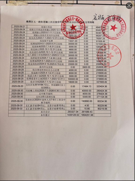 五一路办事处碾上社区2025年第三季度银行存款收支公开表