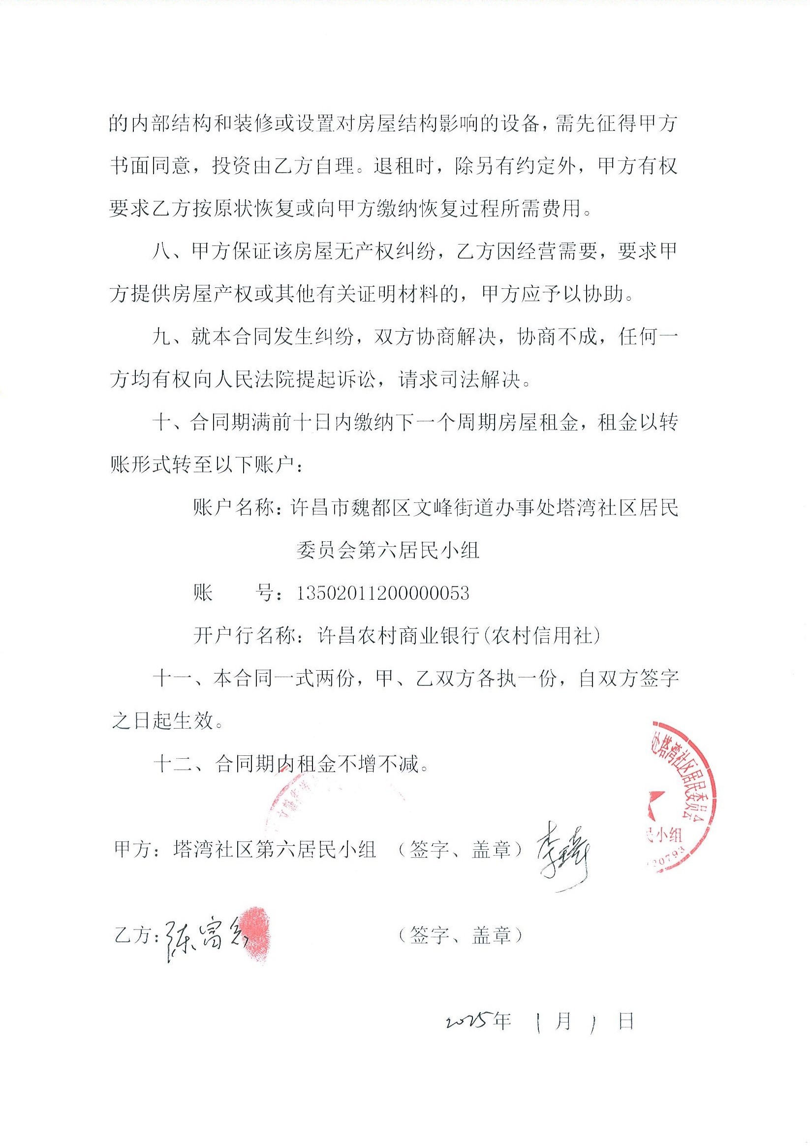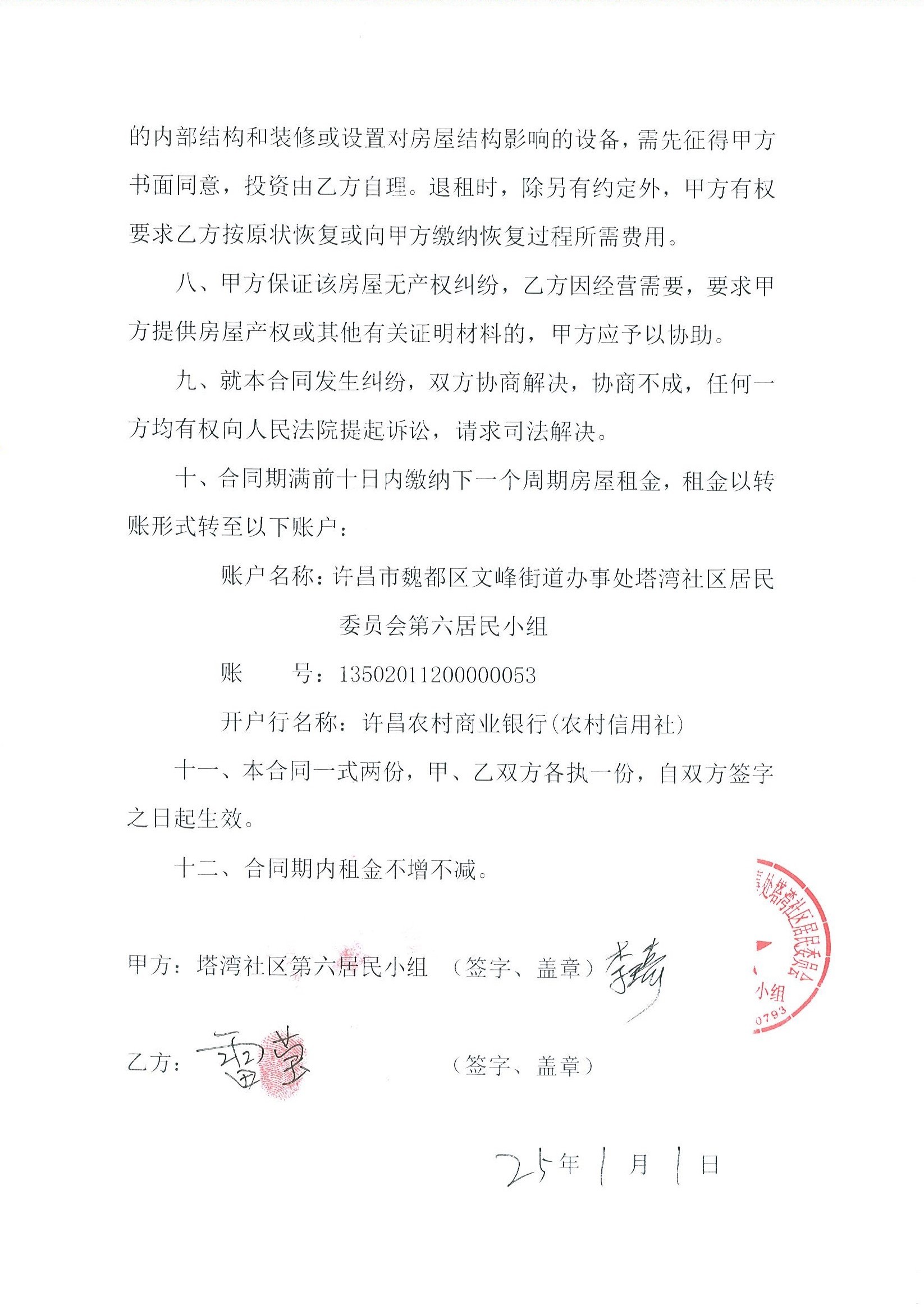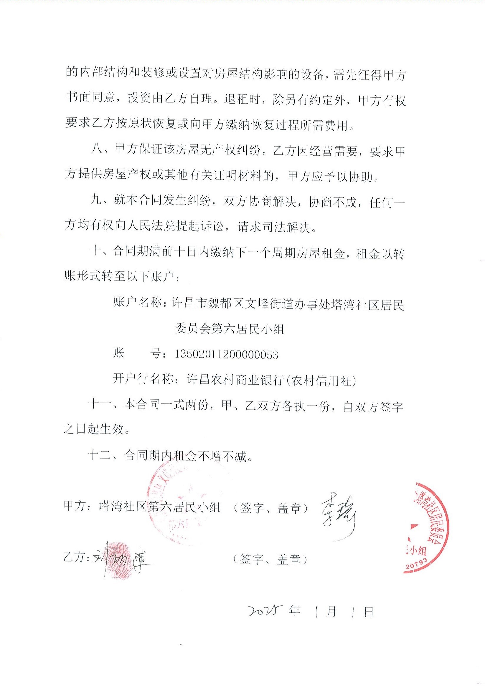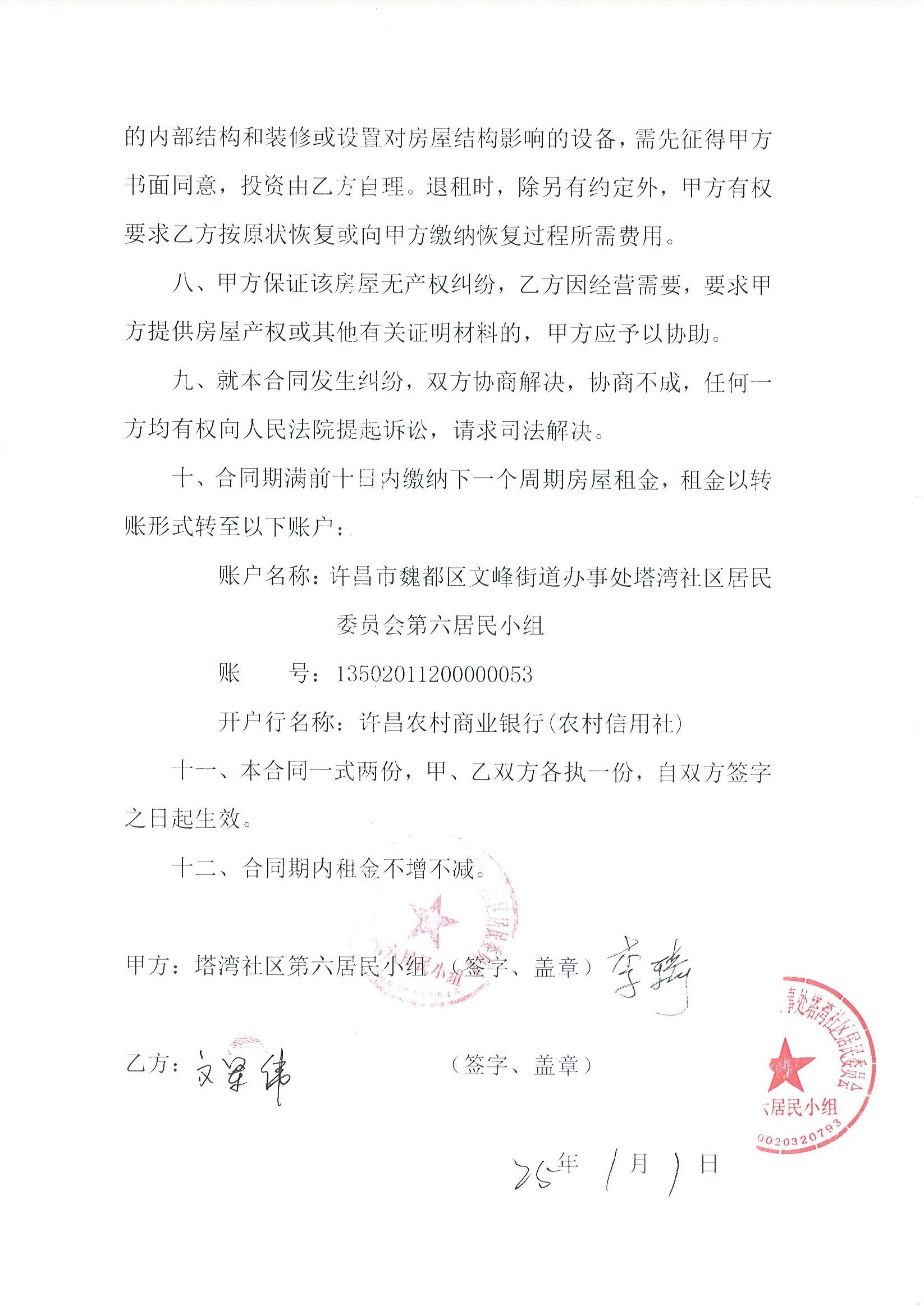 文峰办事处塔湾社区第七居民小组门面房及场院租赁协议