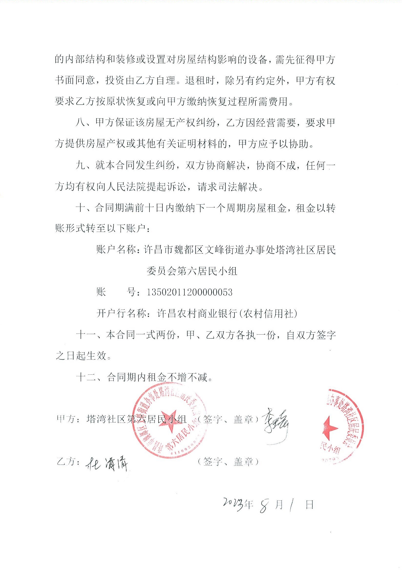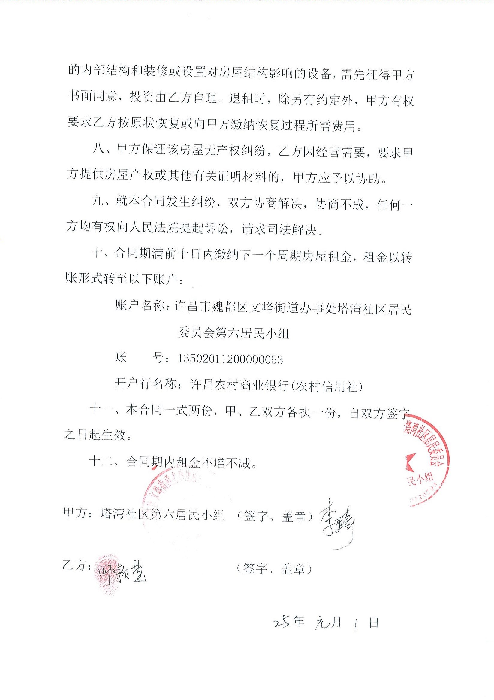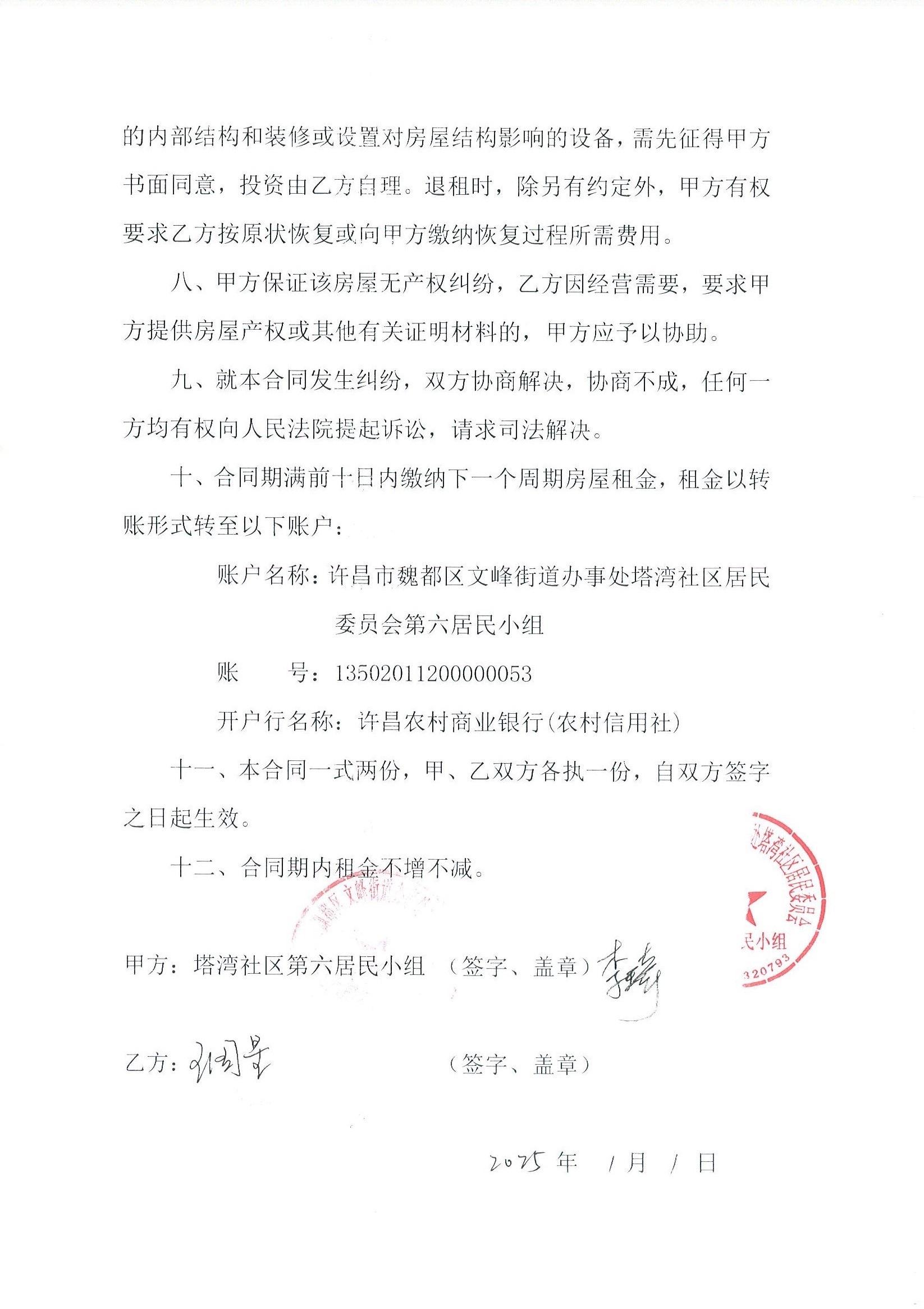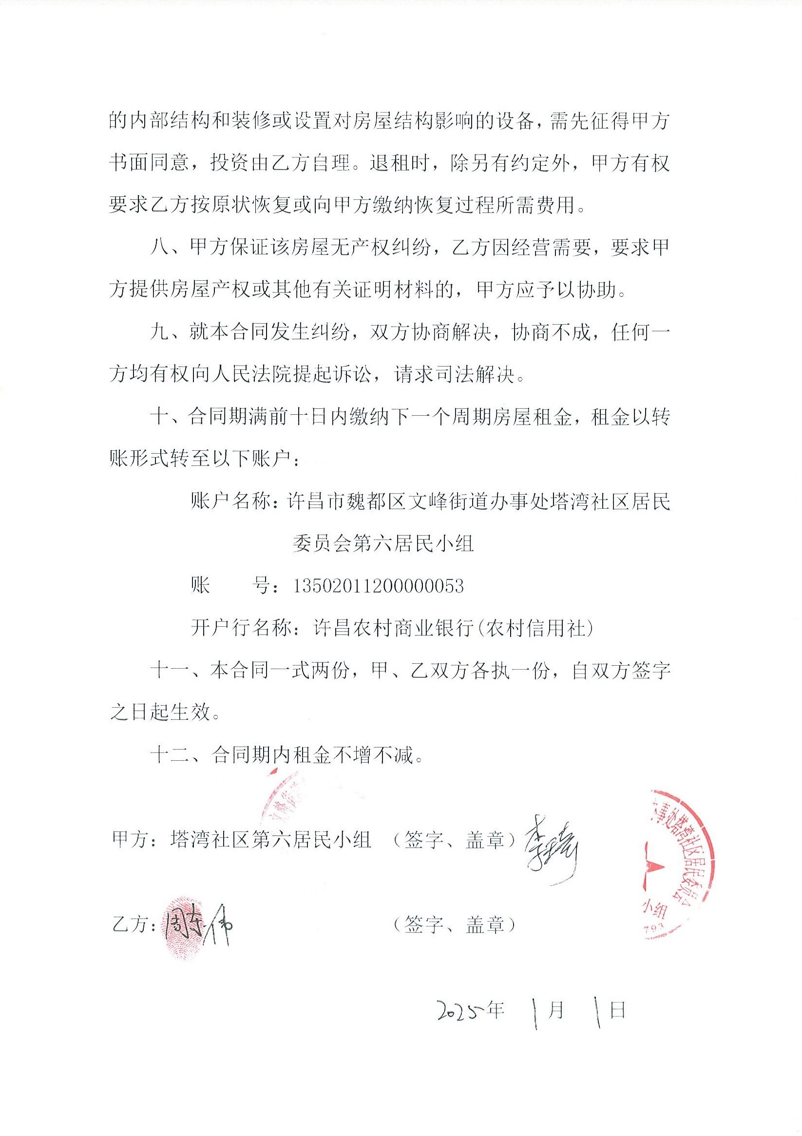 文峰办事处塔湾社区第七居民小组门面房及场院租赁协议