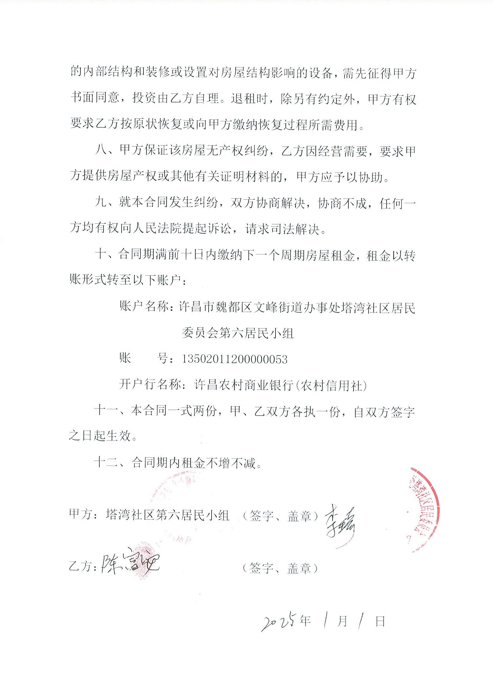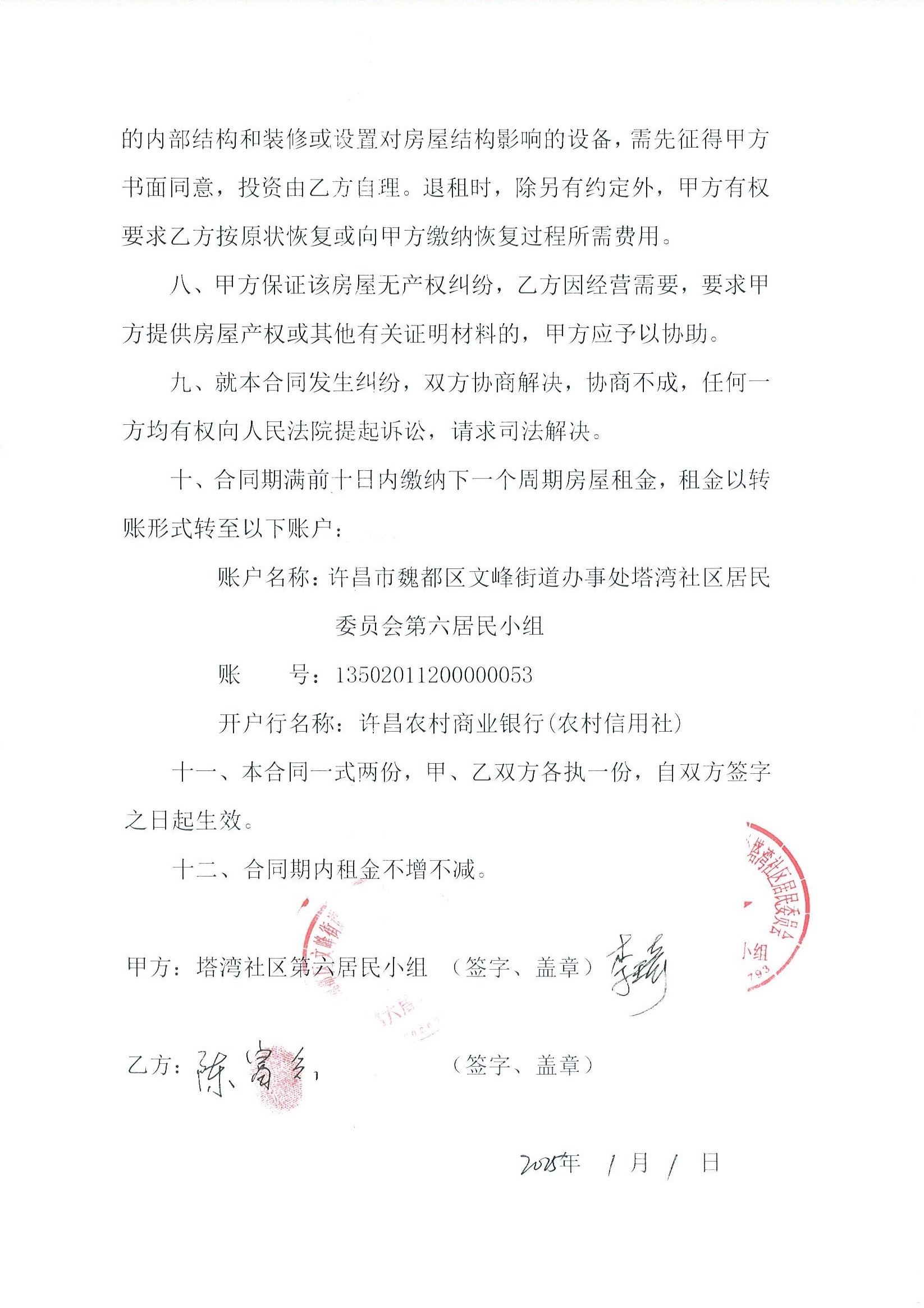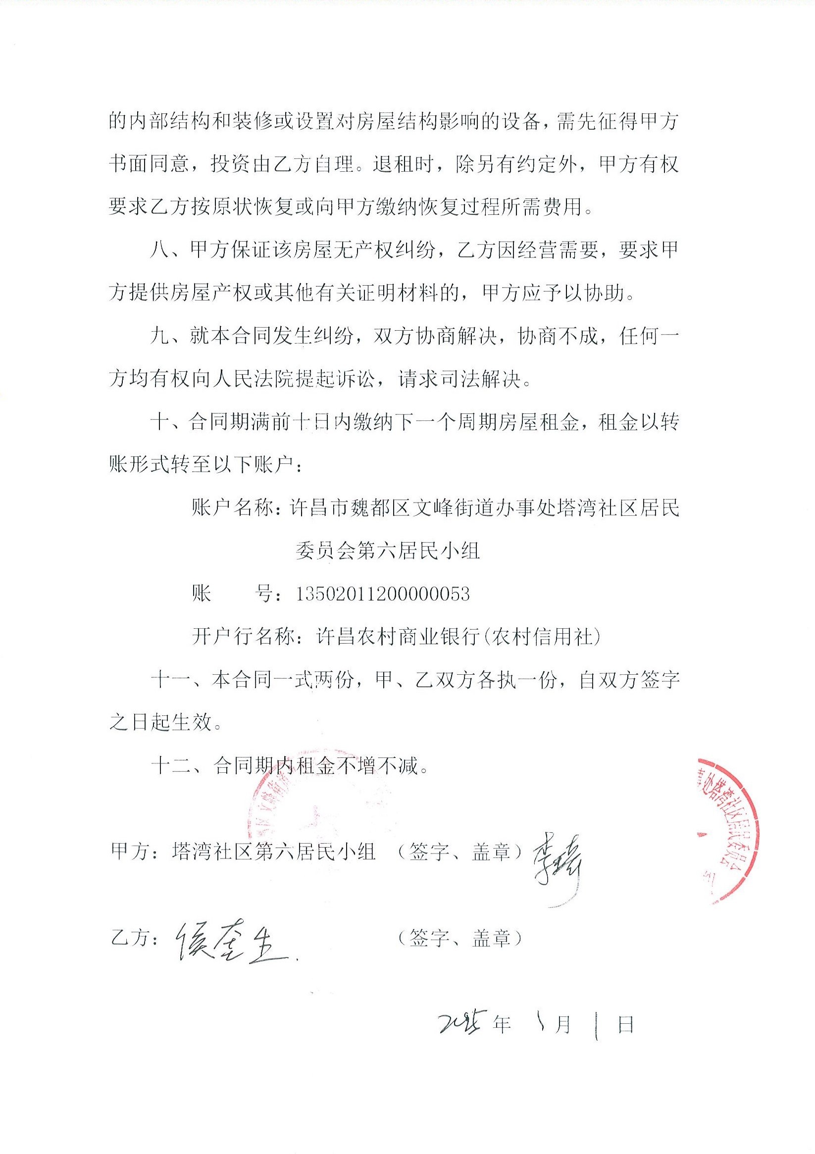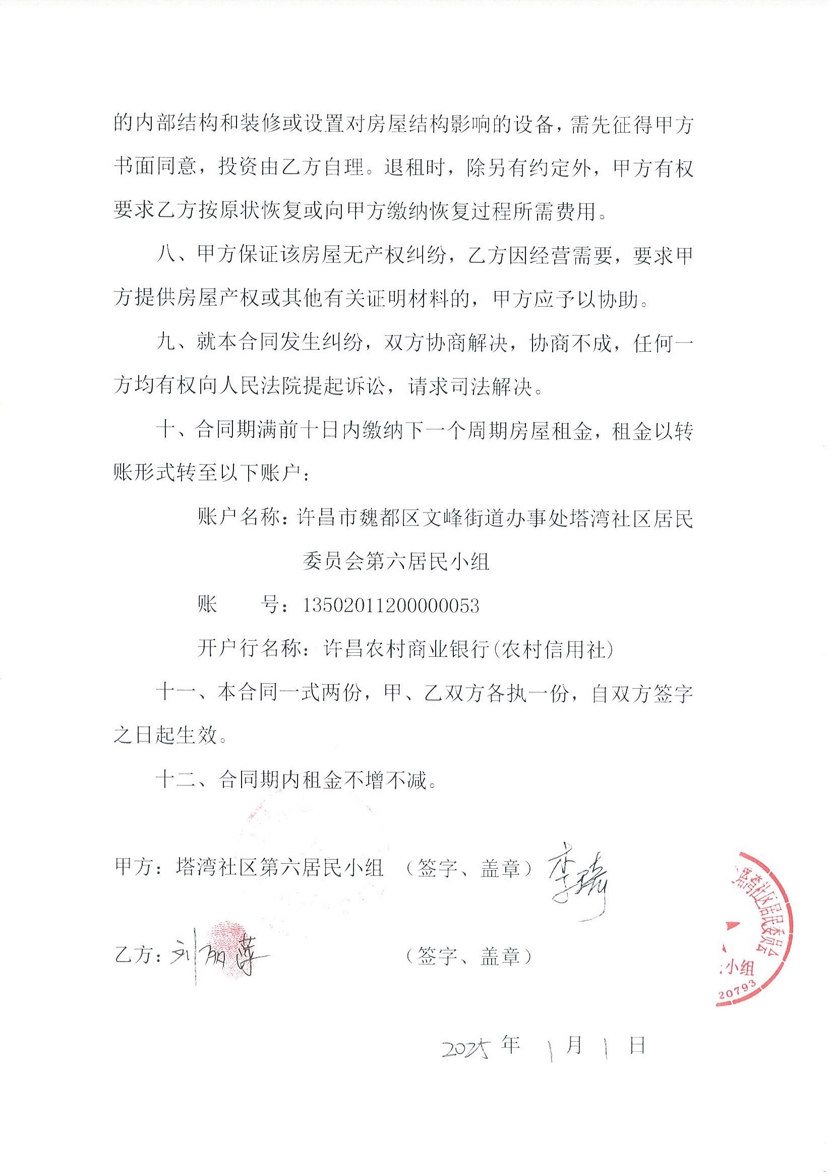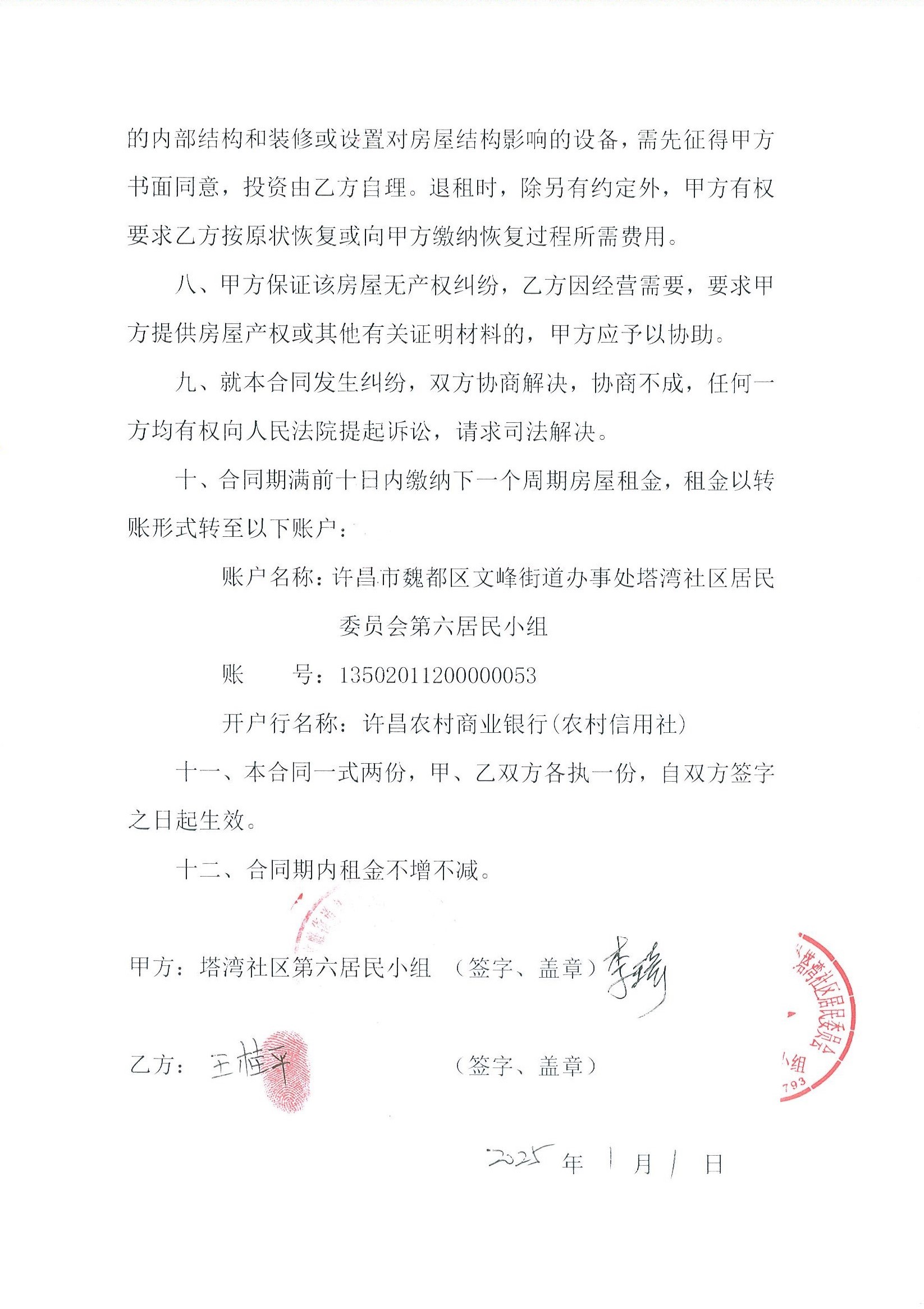 文峰办事处塔湾社区第七居民小组门面房及场院租赁协议