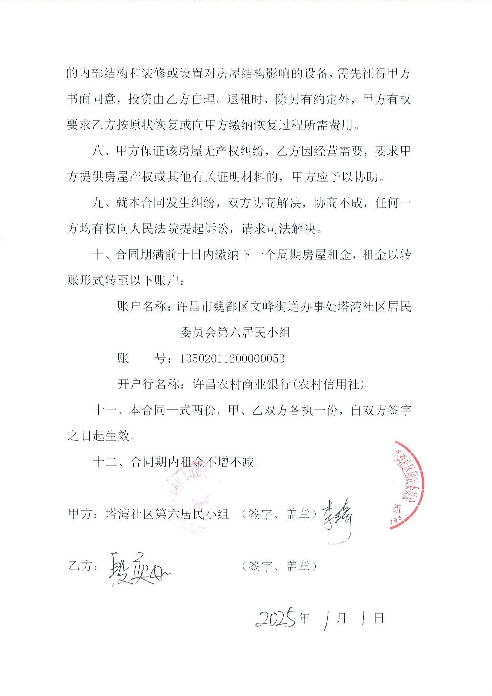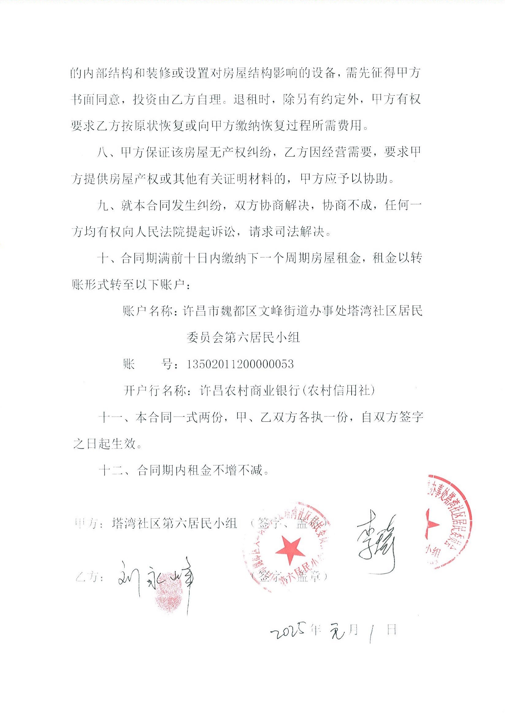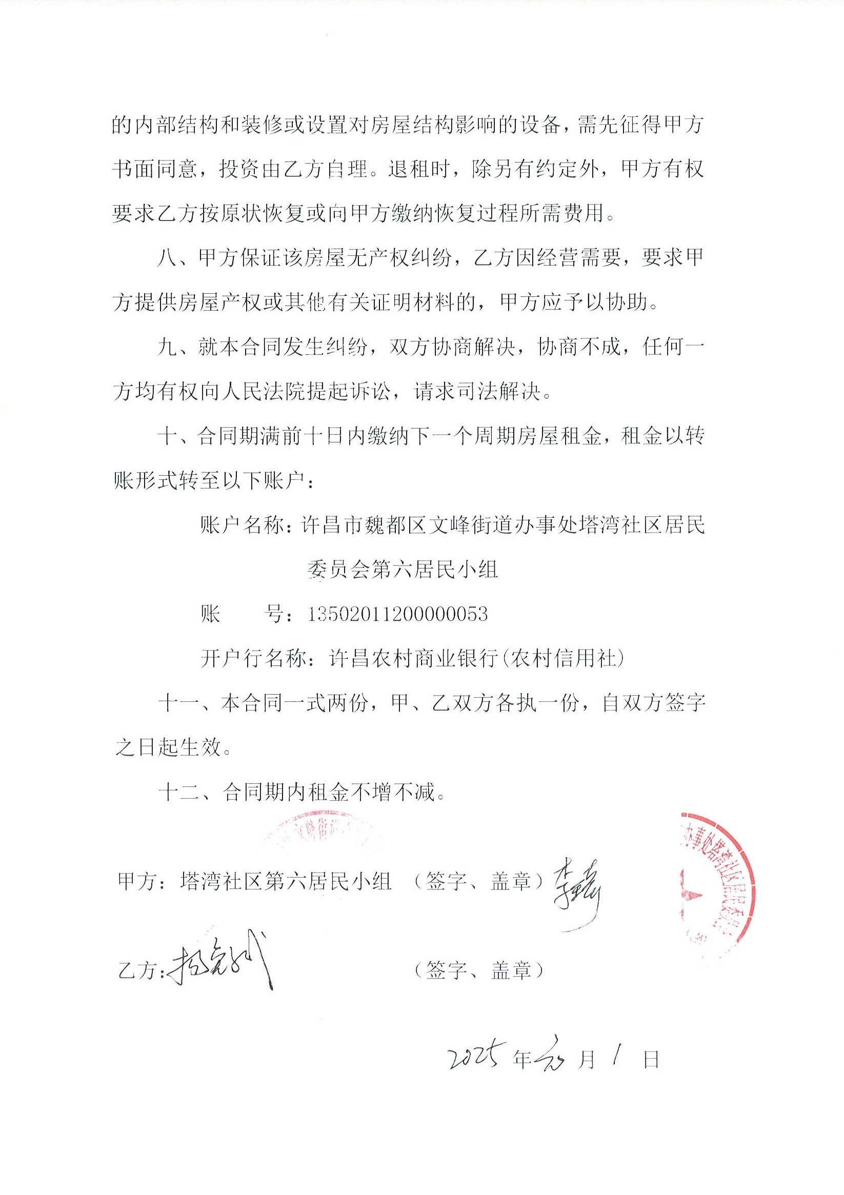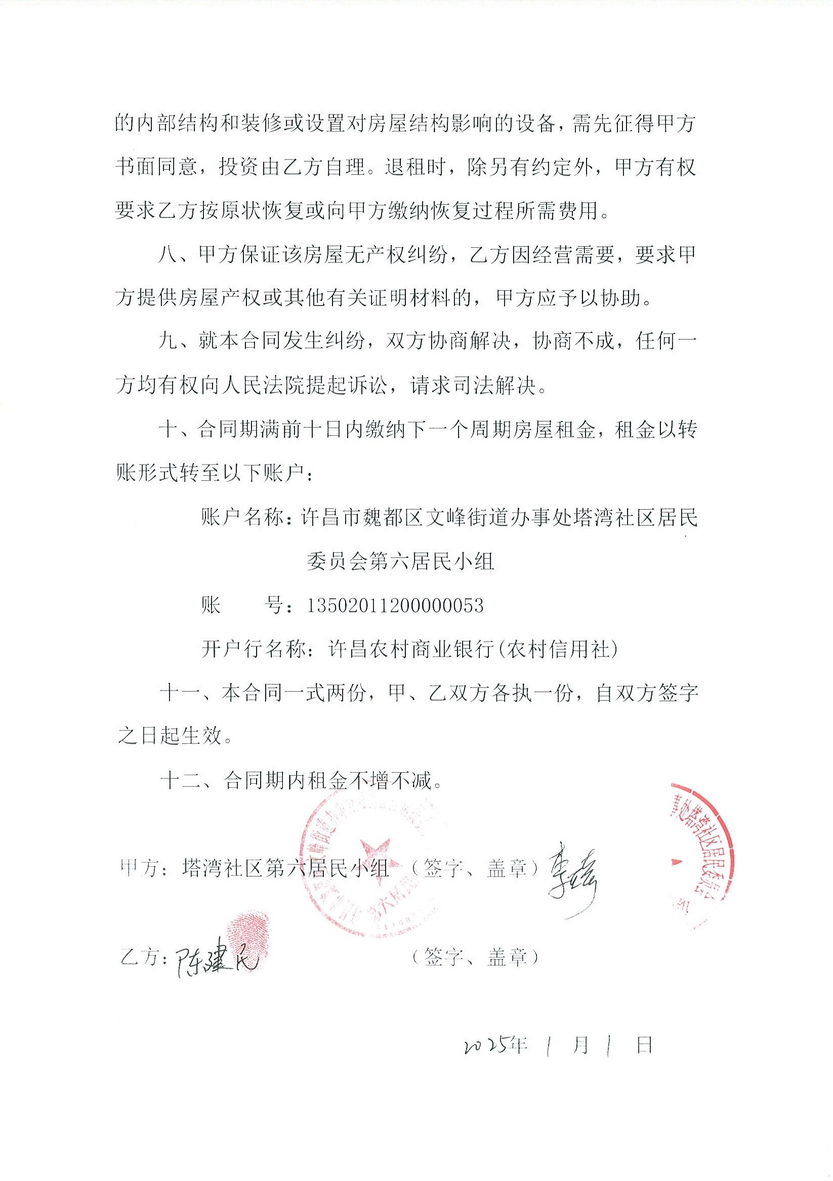 文峰办事处塔湾社区第七居民小组门面房及场院租赁协议