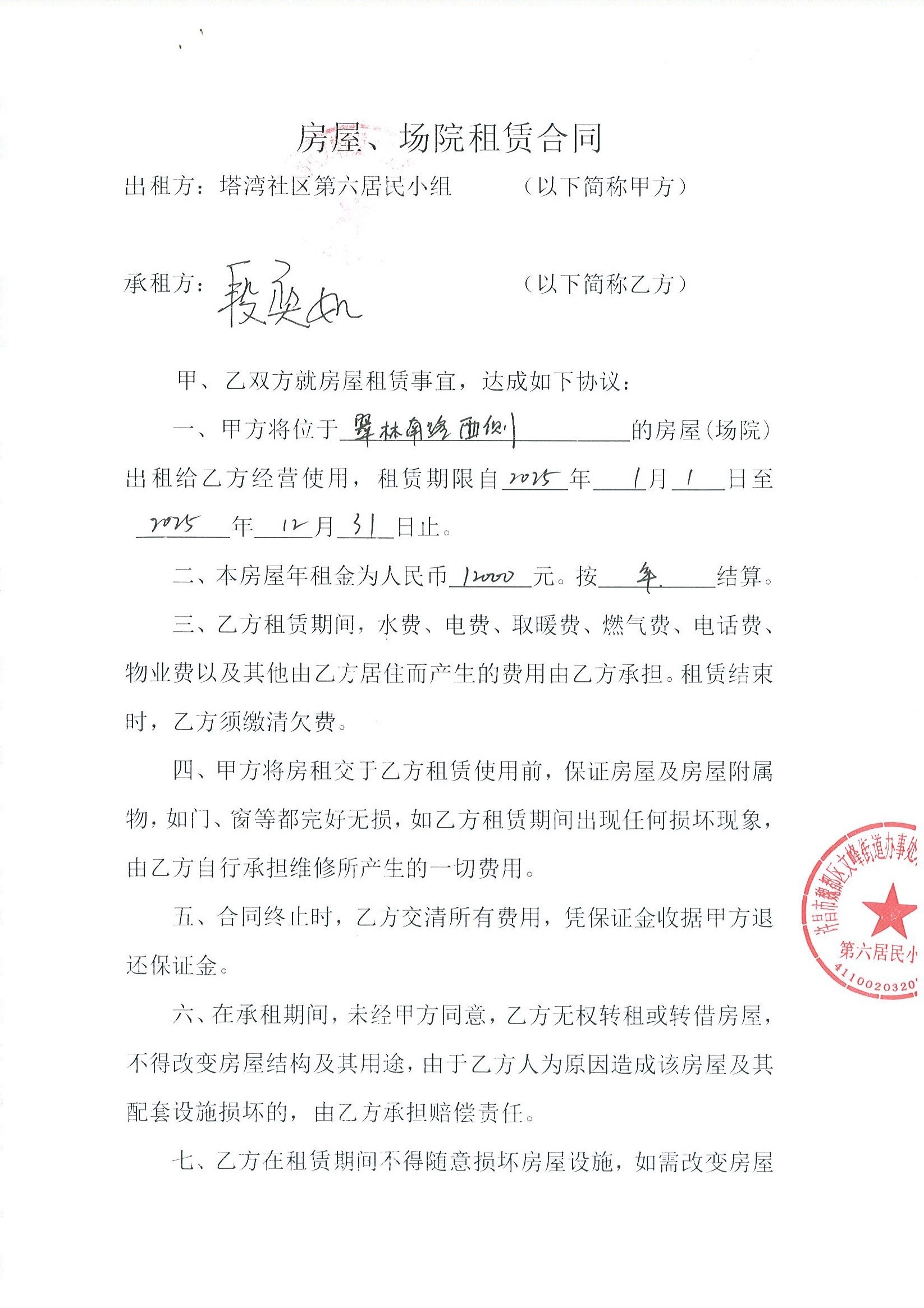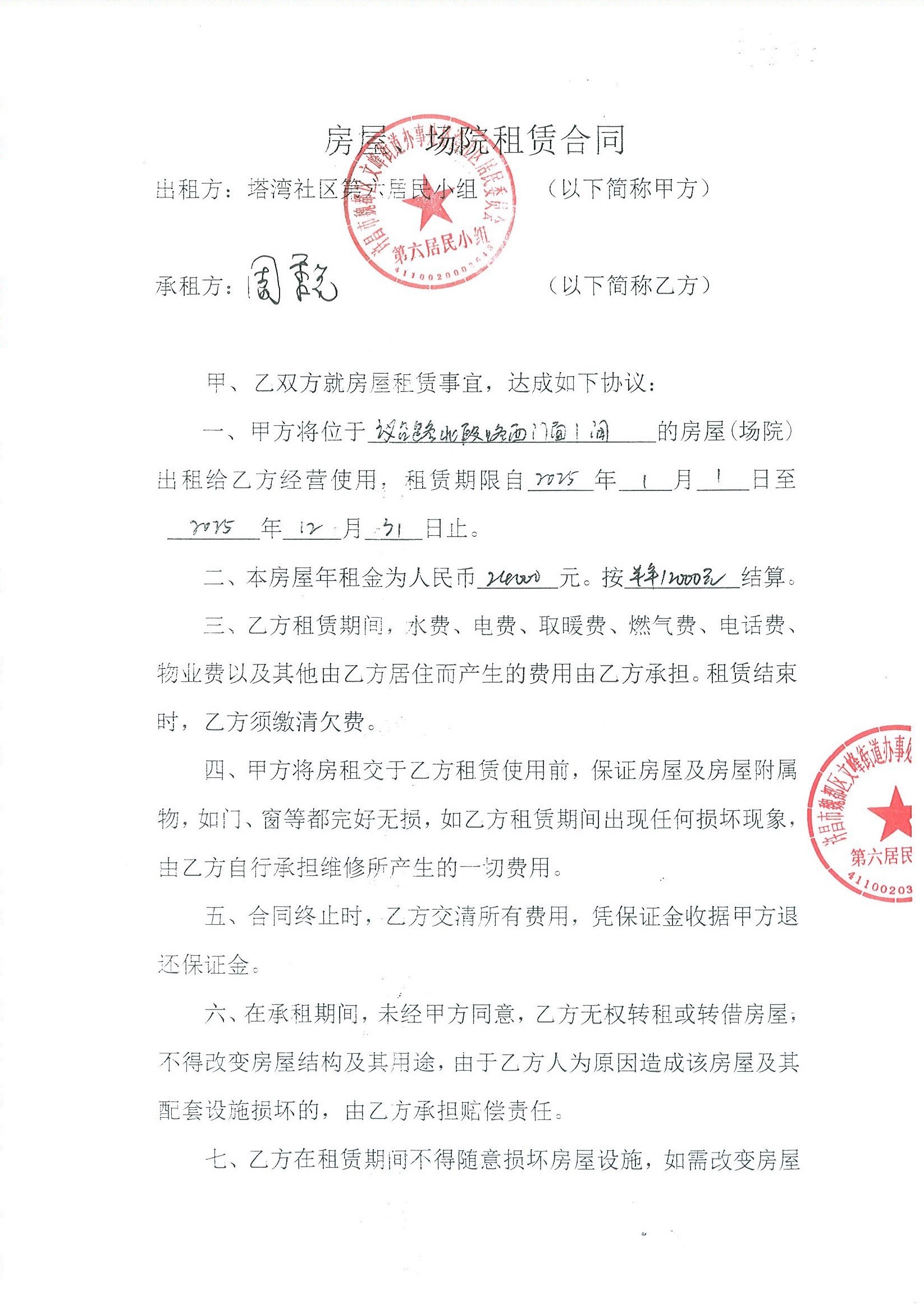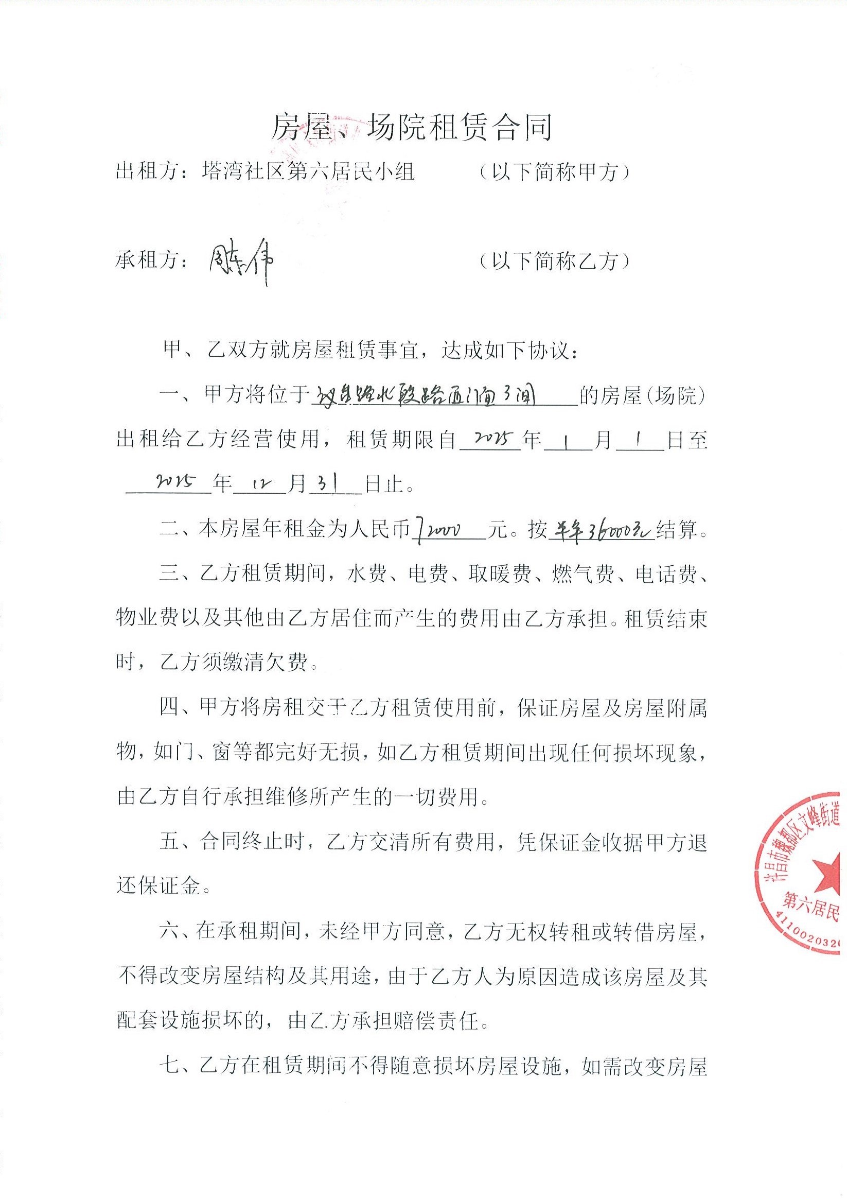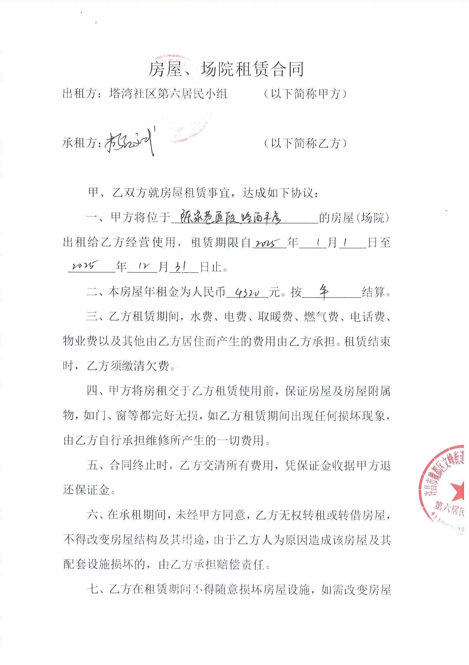 文峰办事处塔湾社区第六居民小组门面房及场院租赁协议