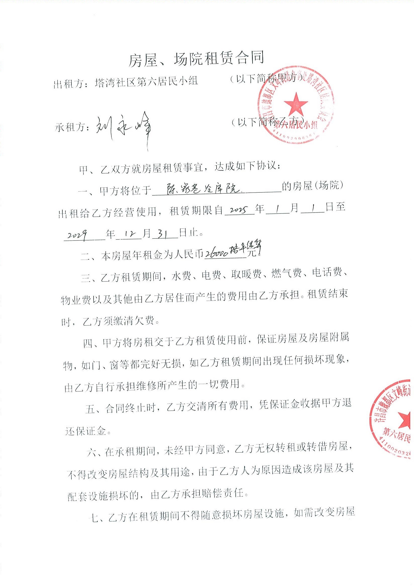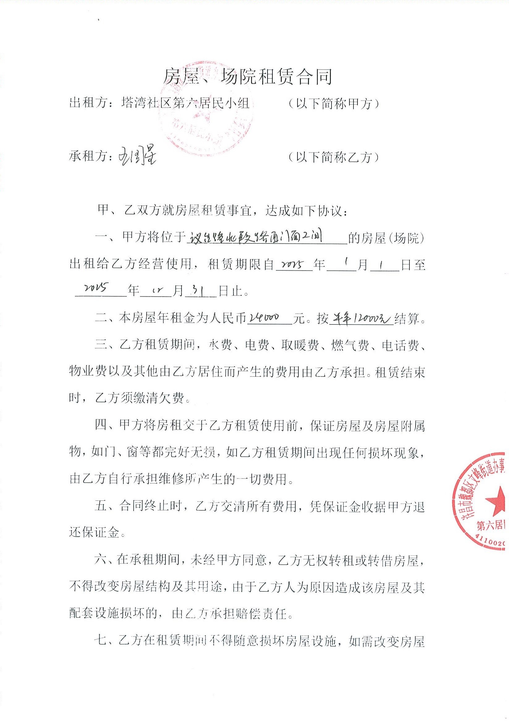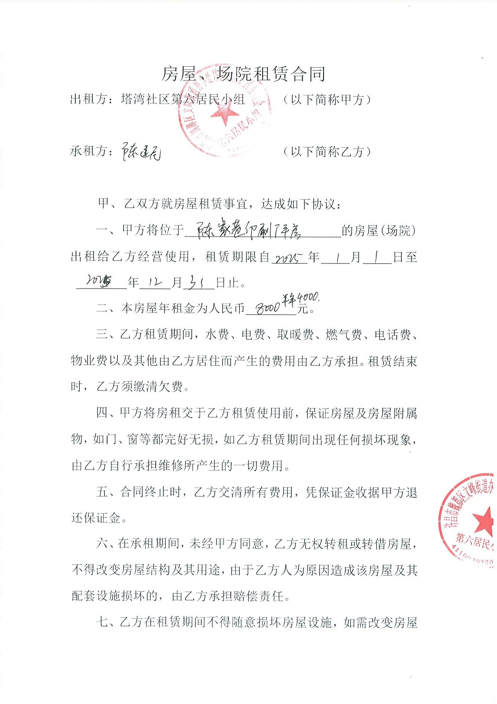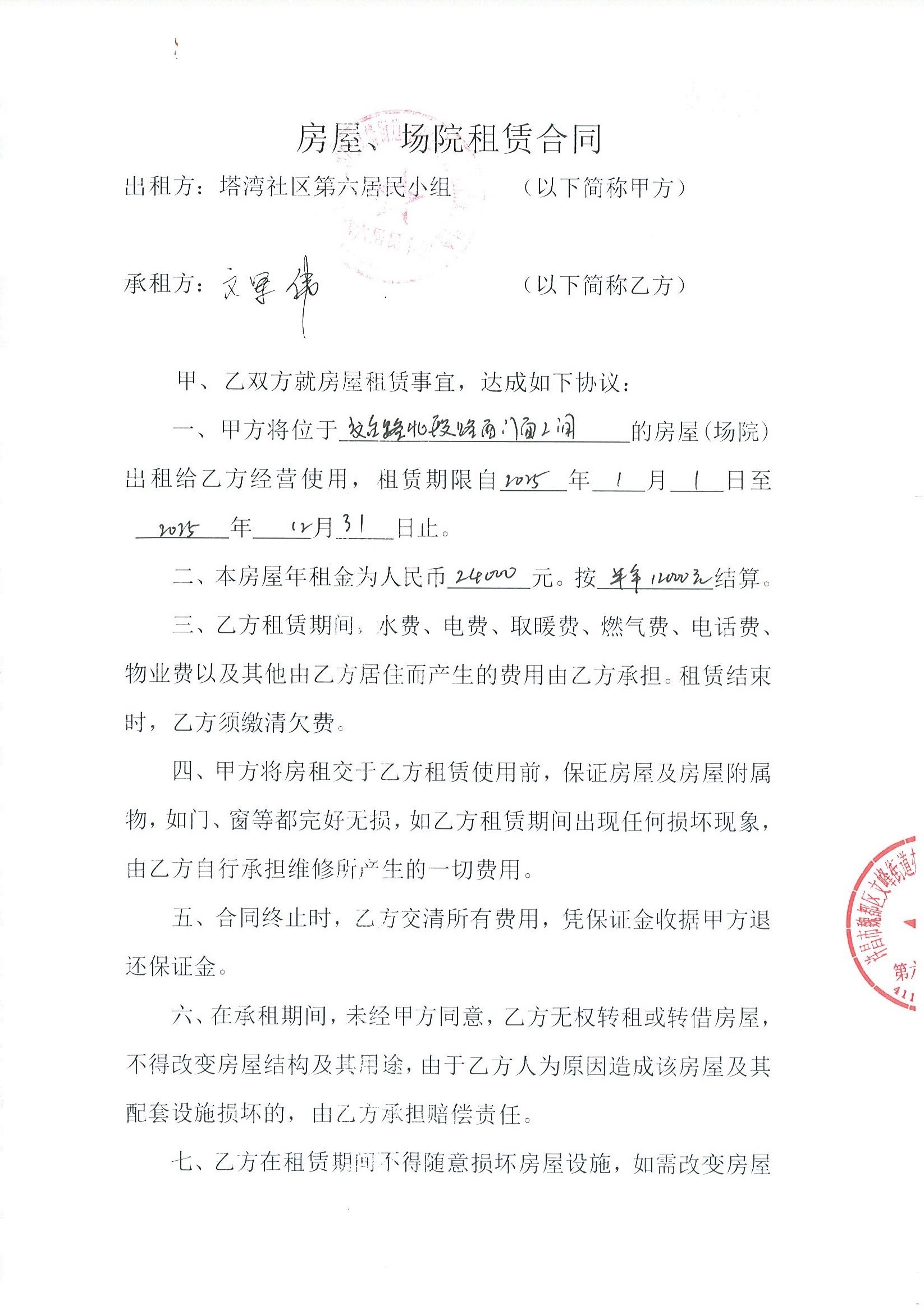 文峰办事处塔湾社区第六居民小组门面房及场院租赁协议