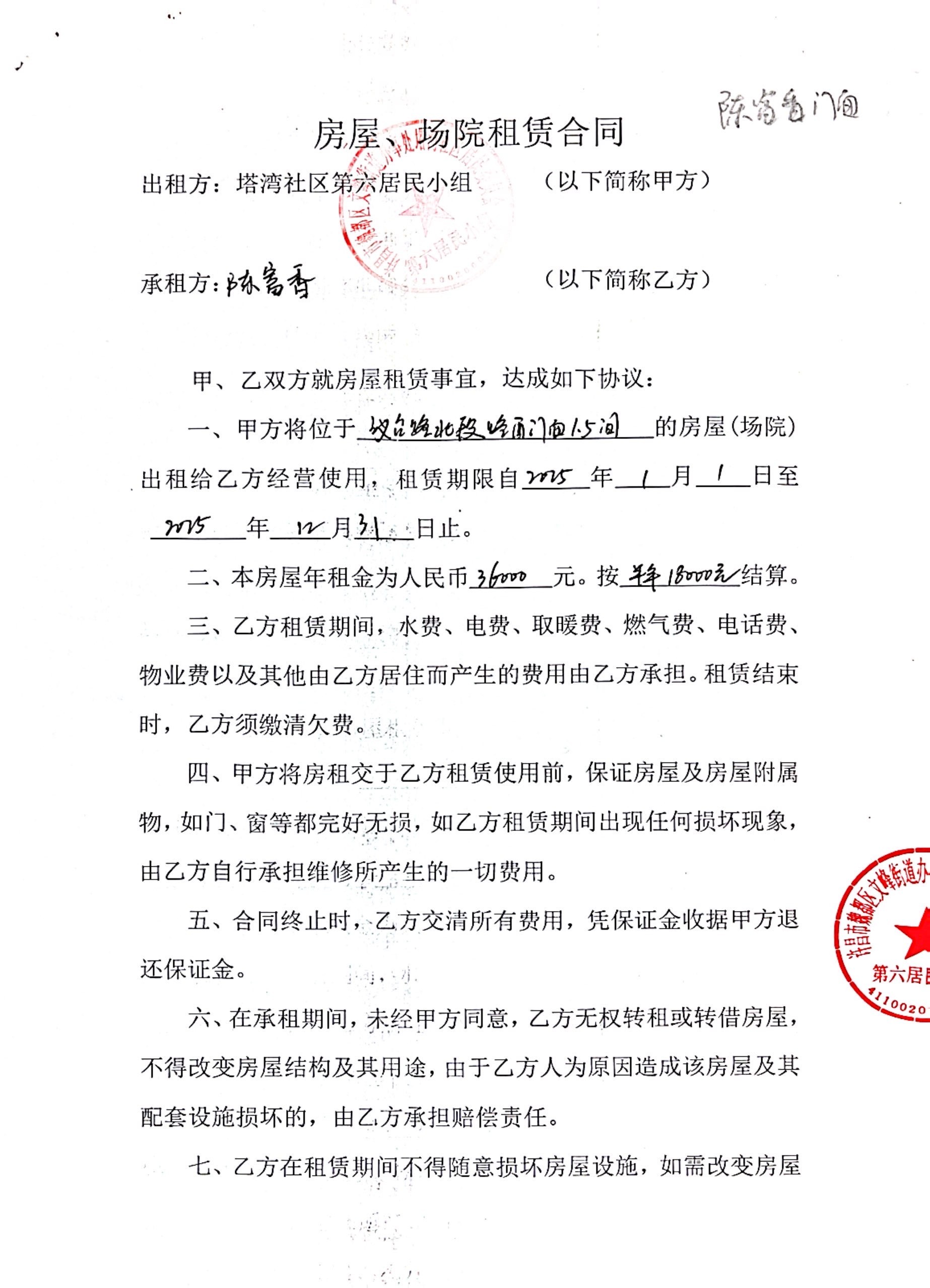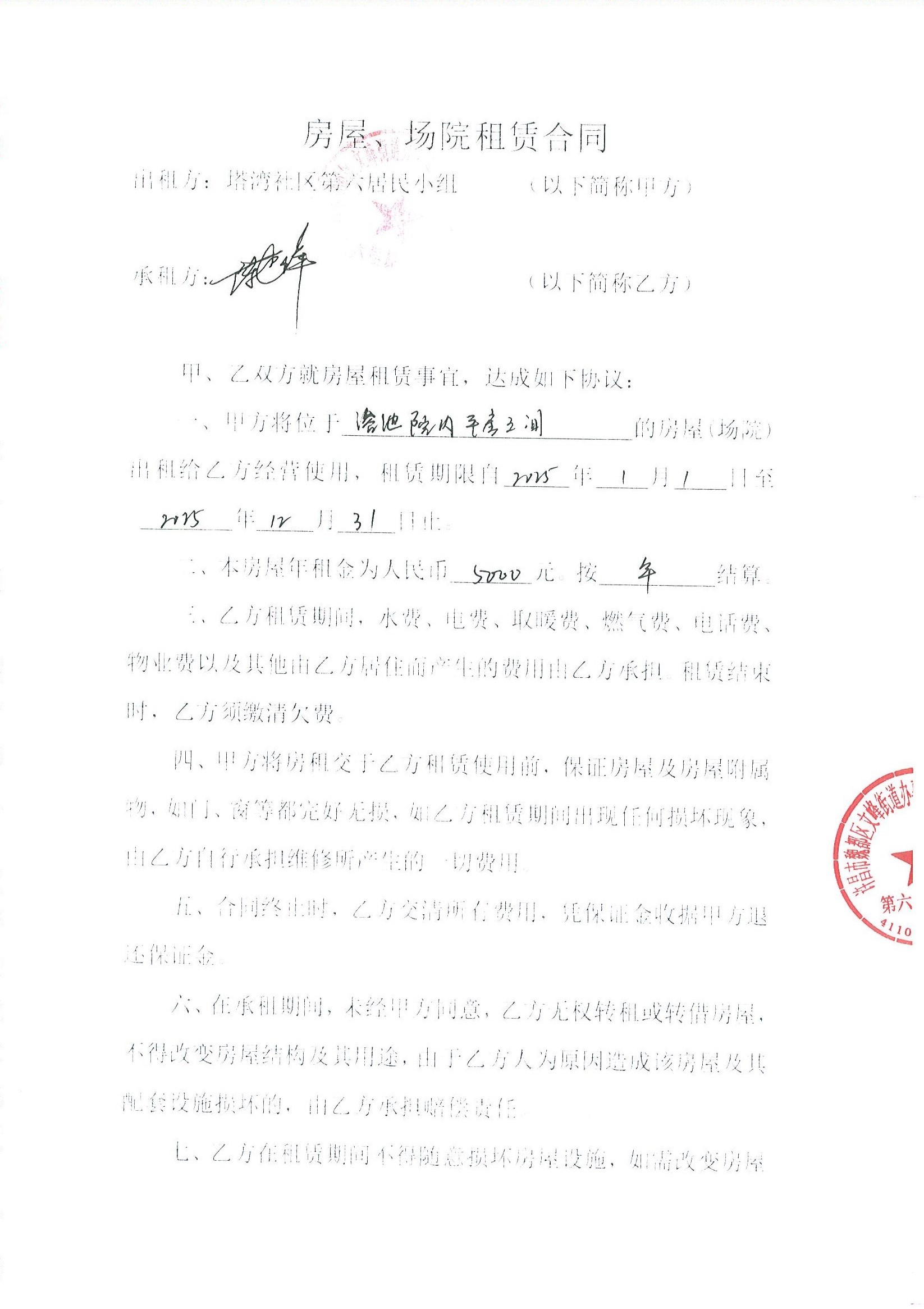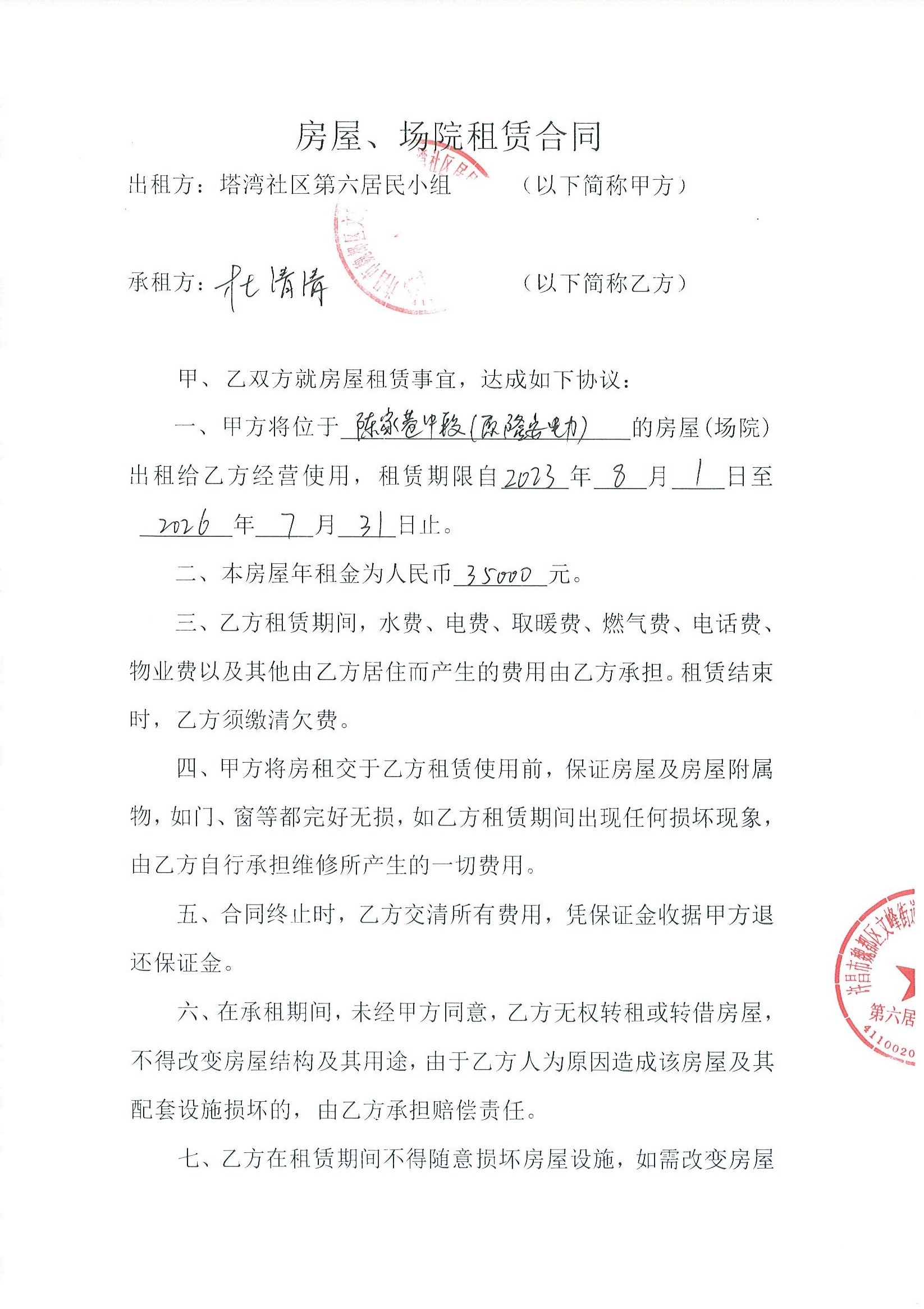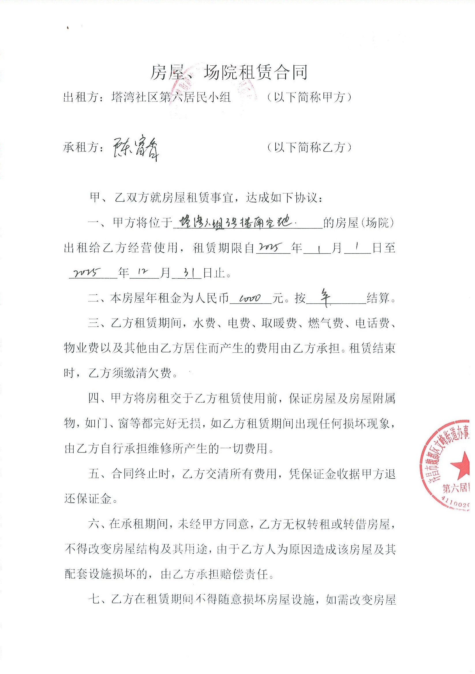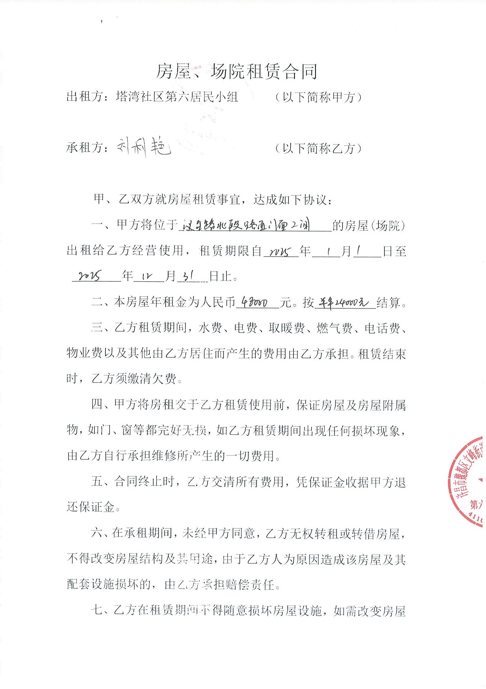 文峰办事处塔湾社区第六居民小组门面房及场院租赁协议