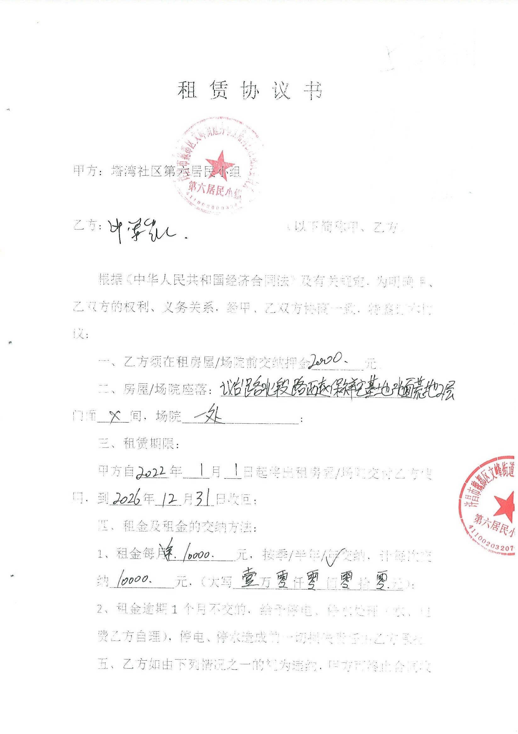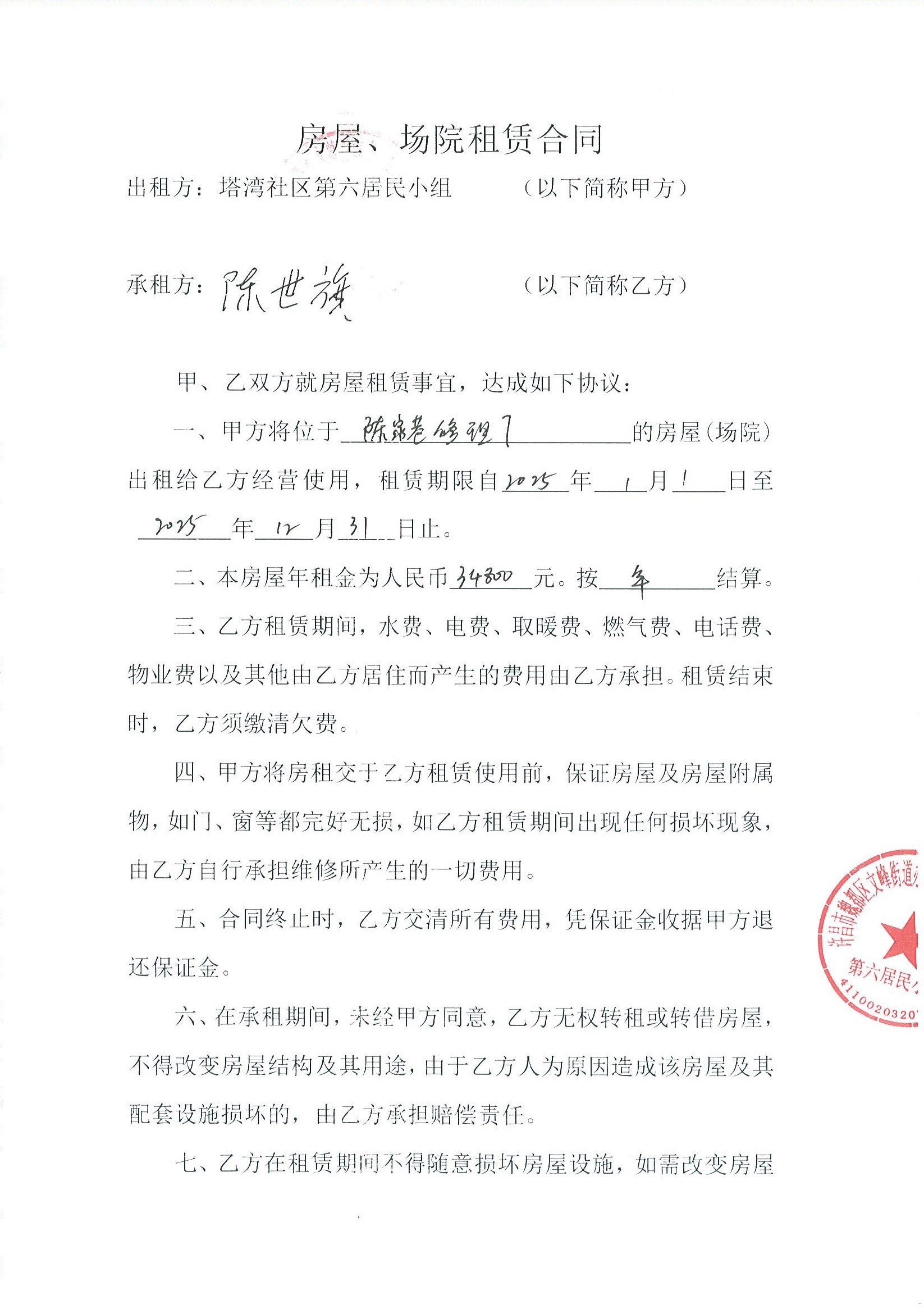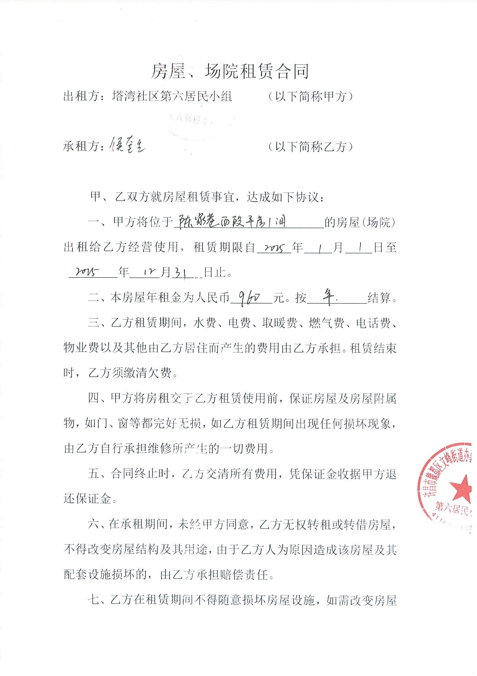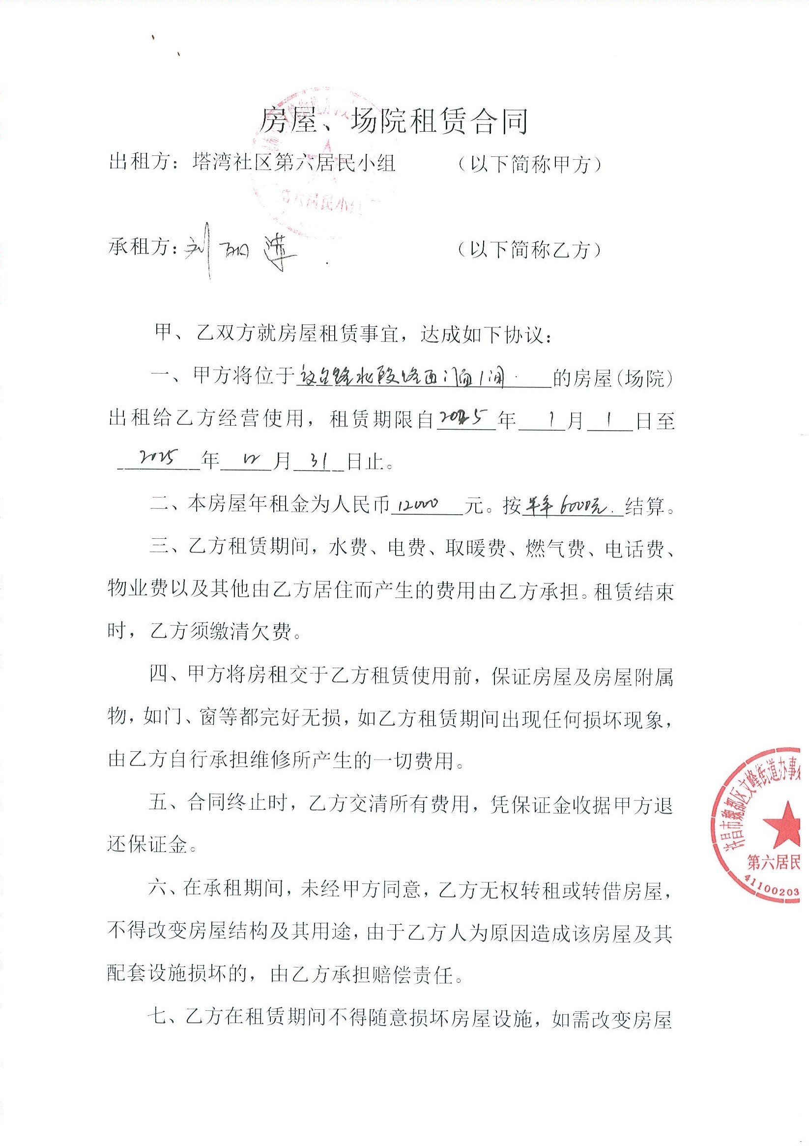 文峰办事处塔湾社区第六居民小组门面房及场院租赁协议