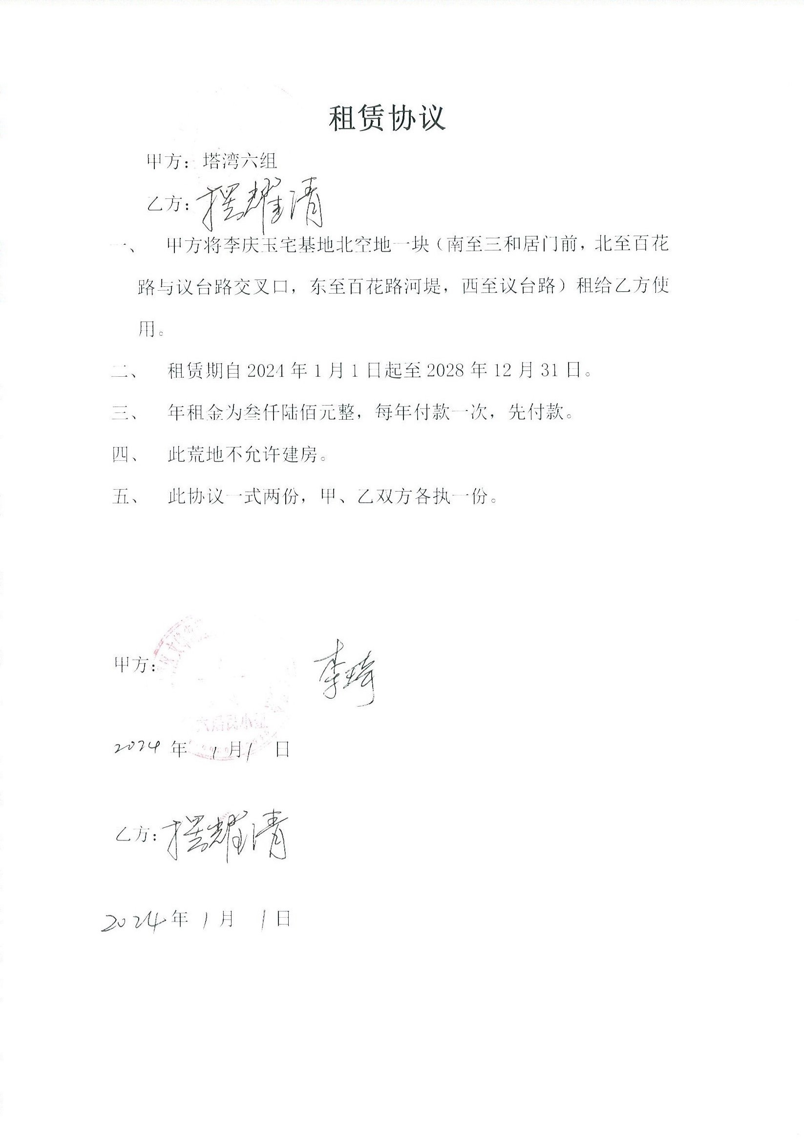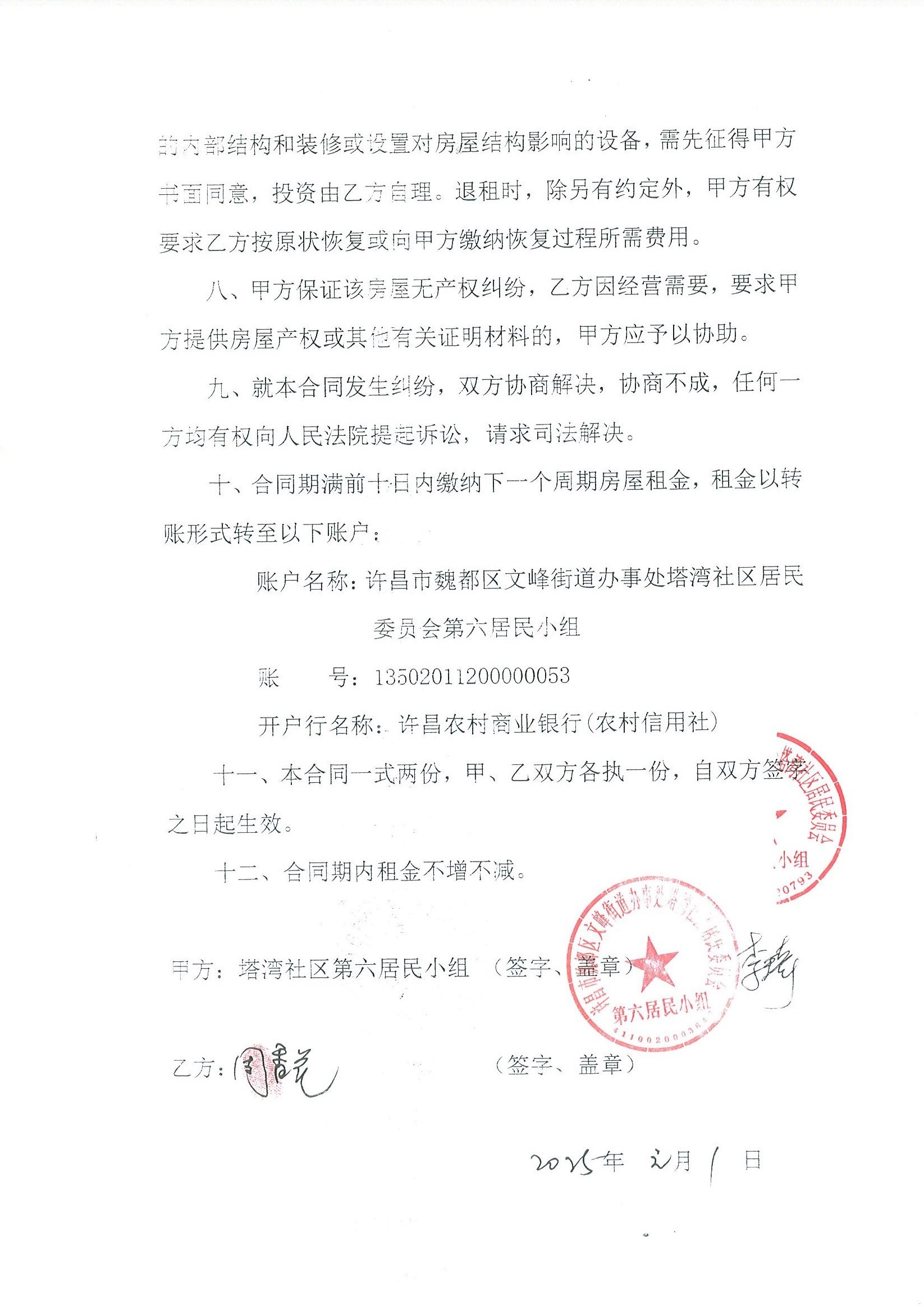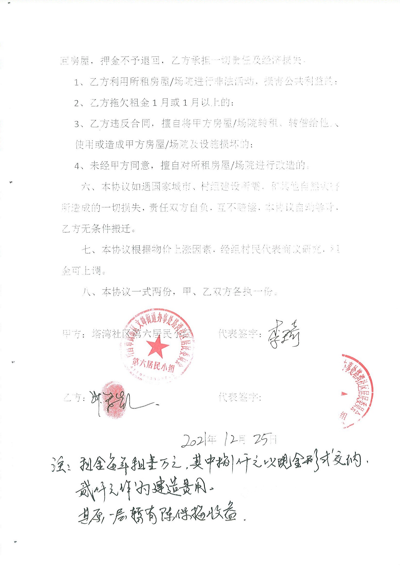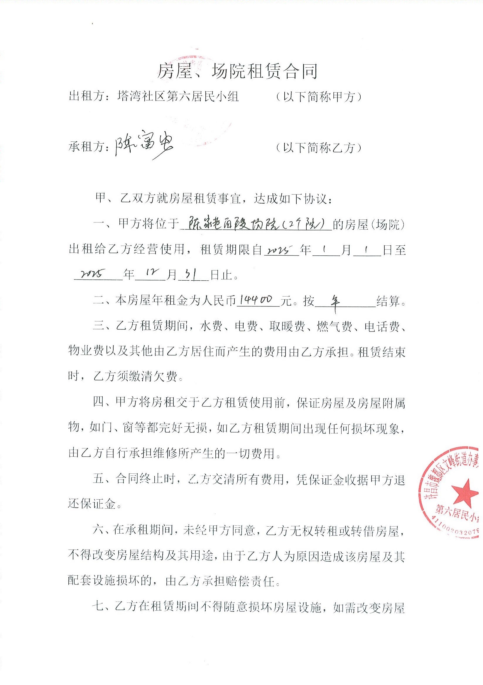 文峰办事处塔湾社区第六居民小组门面房及场院租赁协议