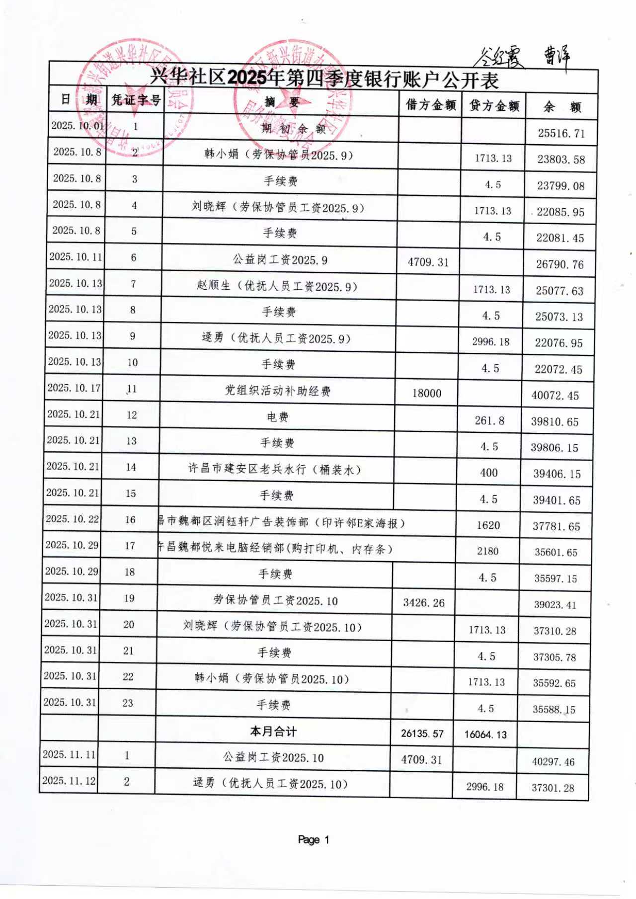 新兴办事处兴华社区2025年第四季度银行存款收支公开表