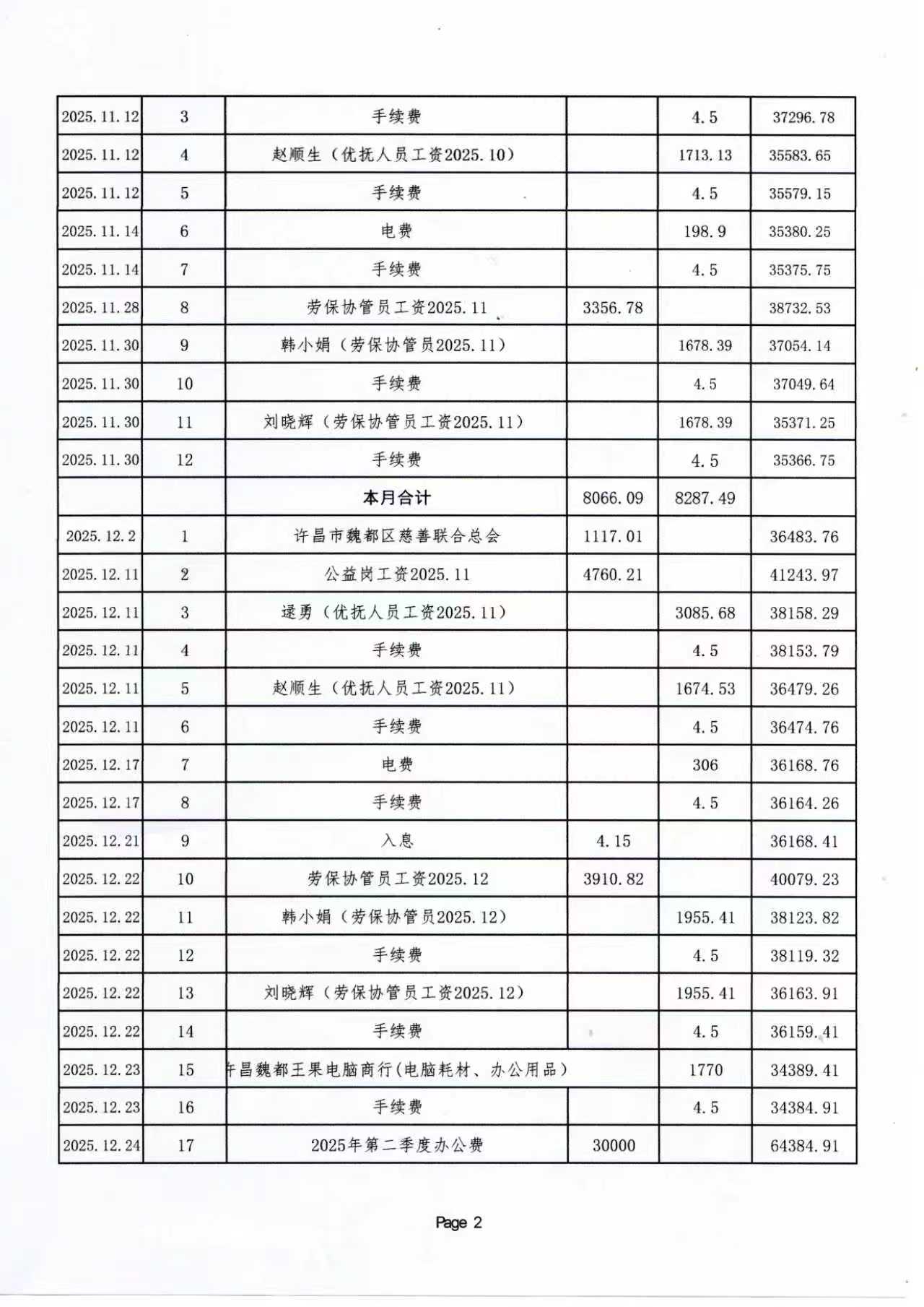 魏北办事处郭楼社区第三季度财务公开
