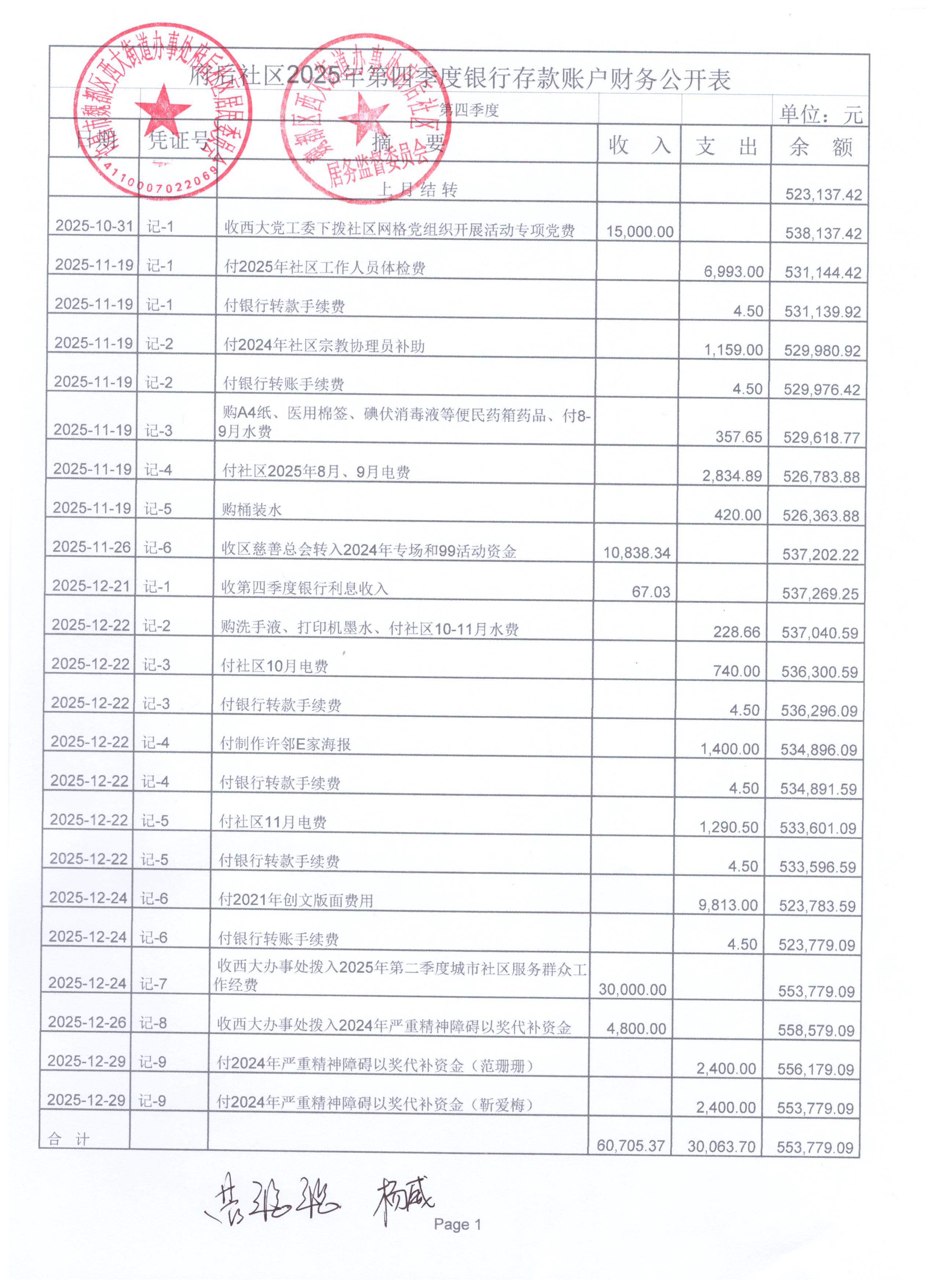 西大街道办事处府后社区2025年第四季度银行存款收支公开表