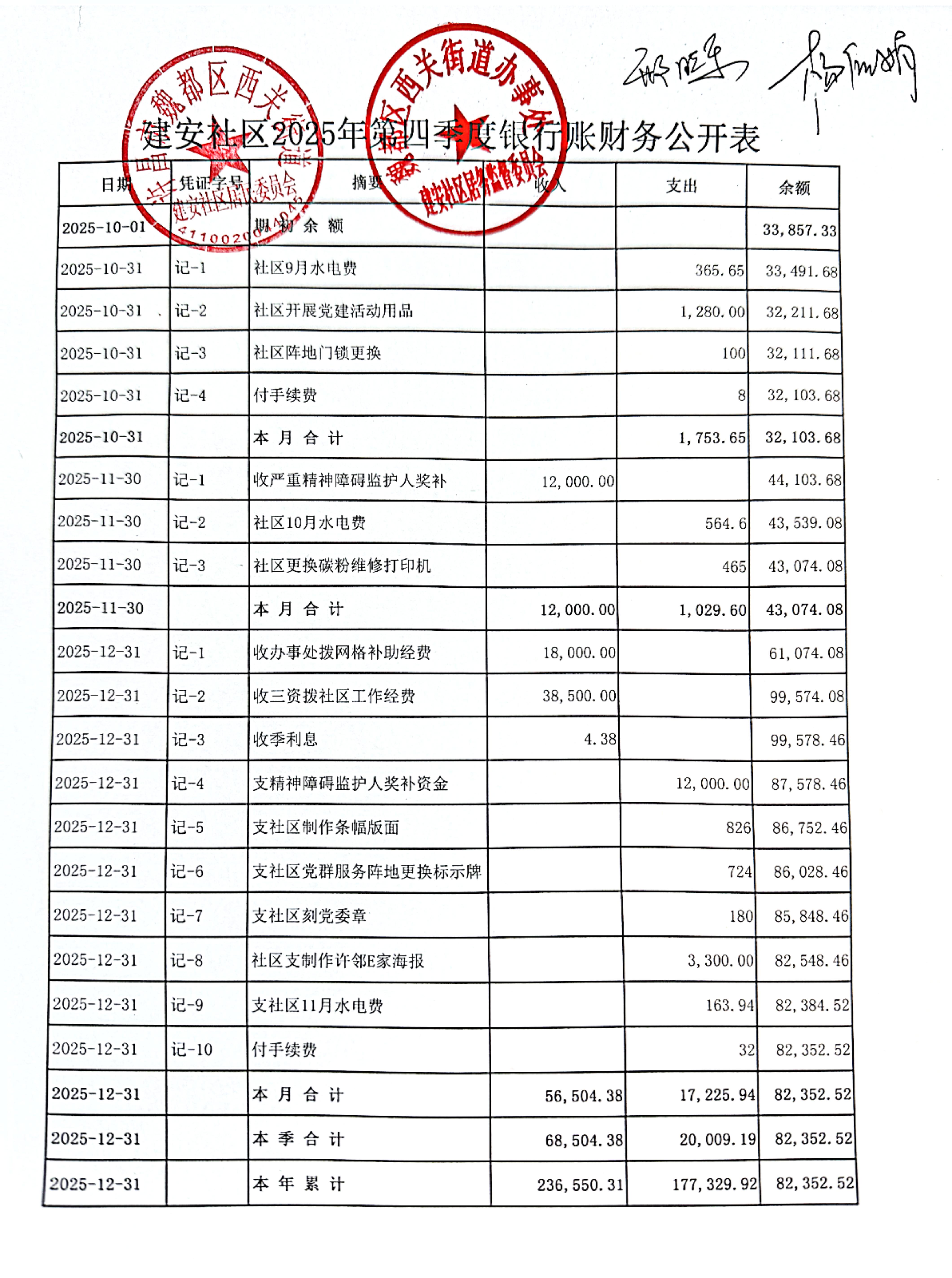 西关街道办事处建安社区2025年第四季度银行存款收支公开表