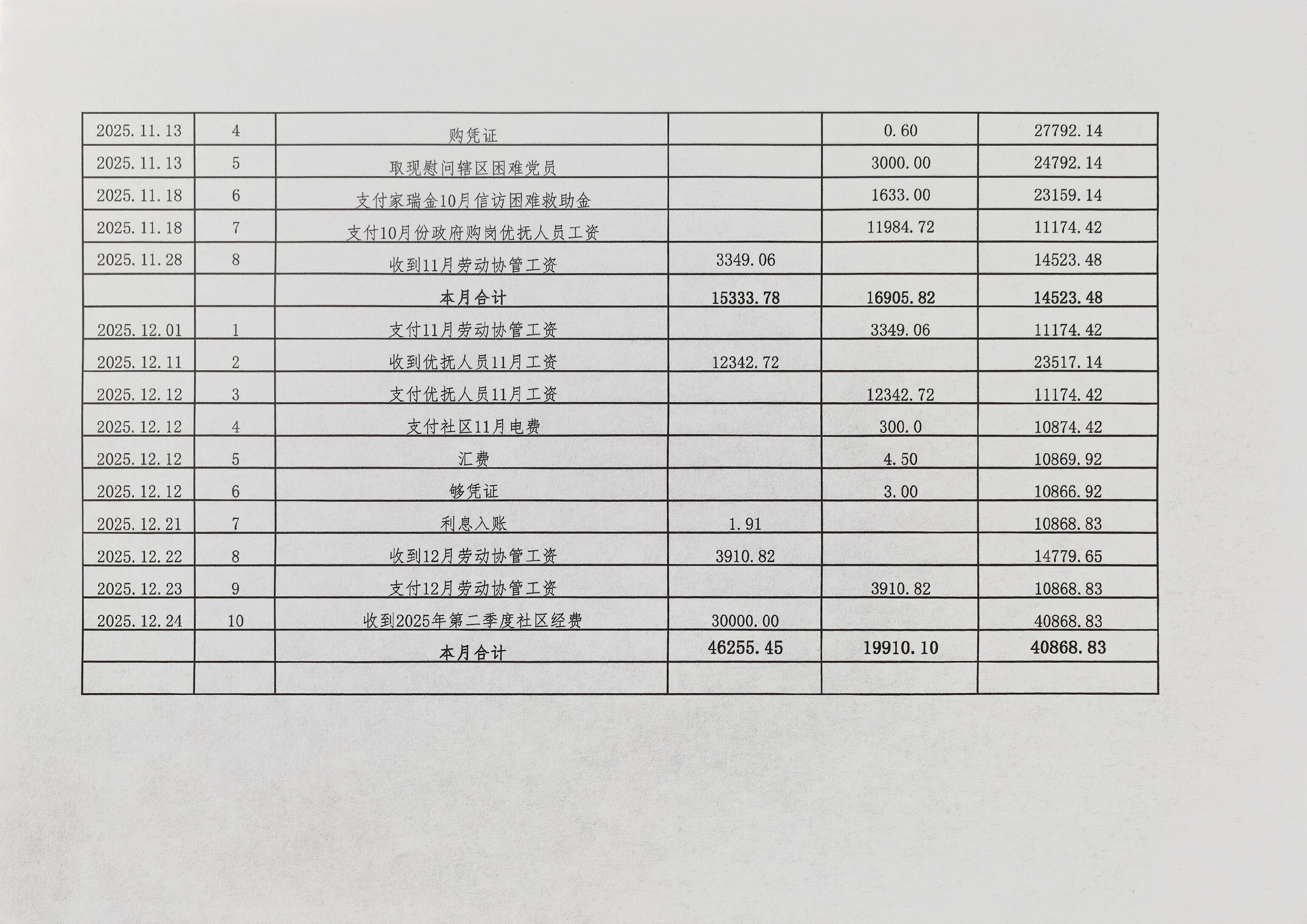 新兴办事处祥泰社区2025年第四季度银行存款收支公开表