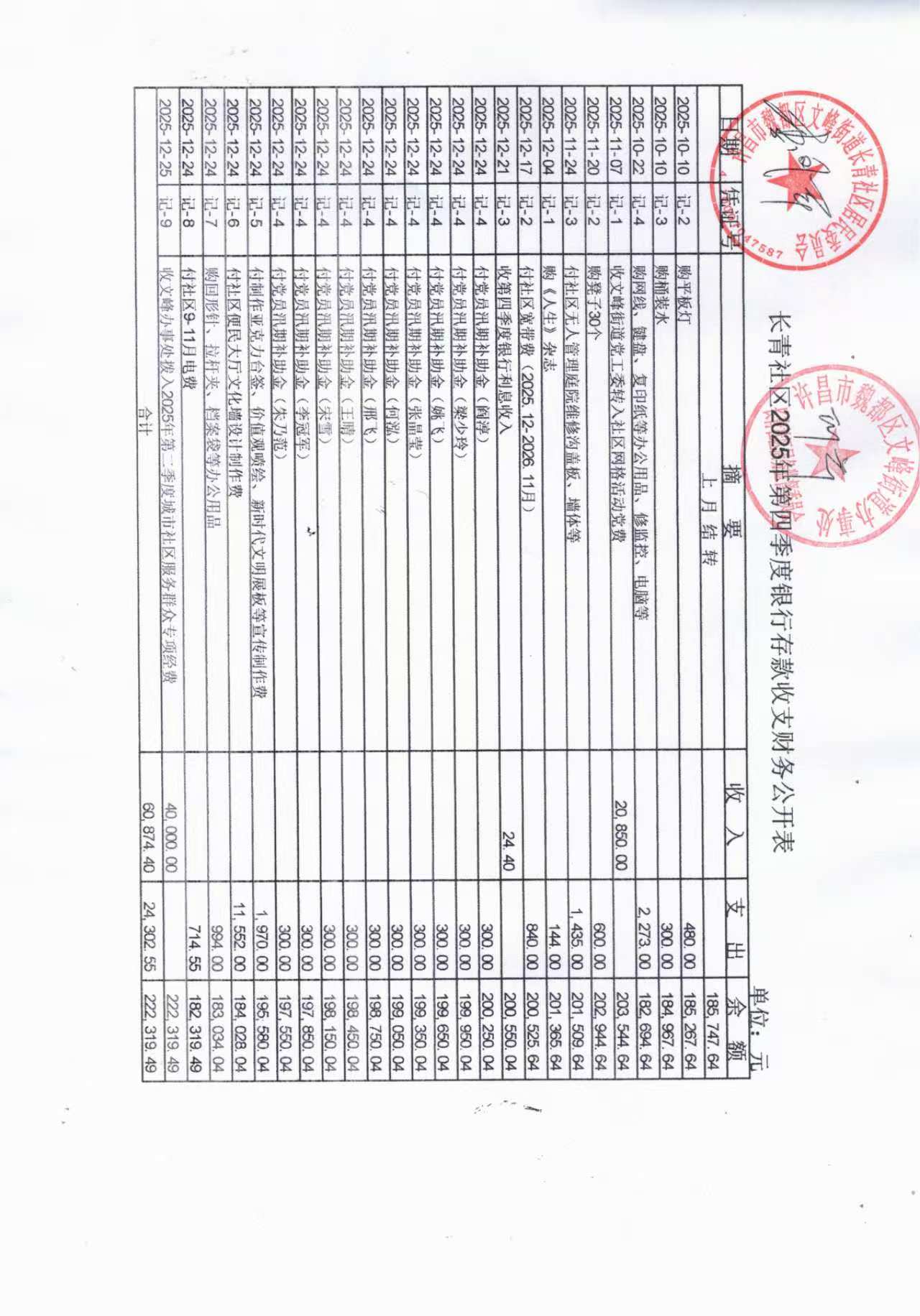 文峰办事处长青社区2025年第四季度银行存款收支公开表