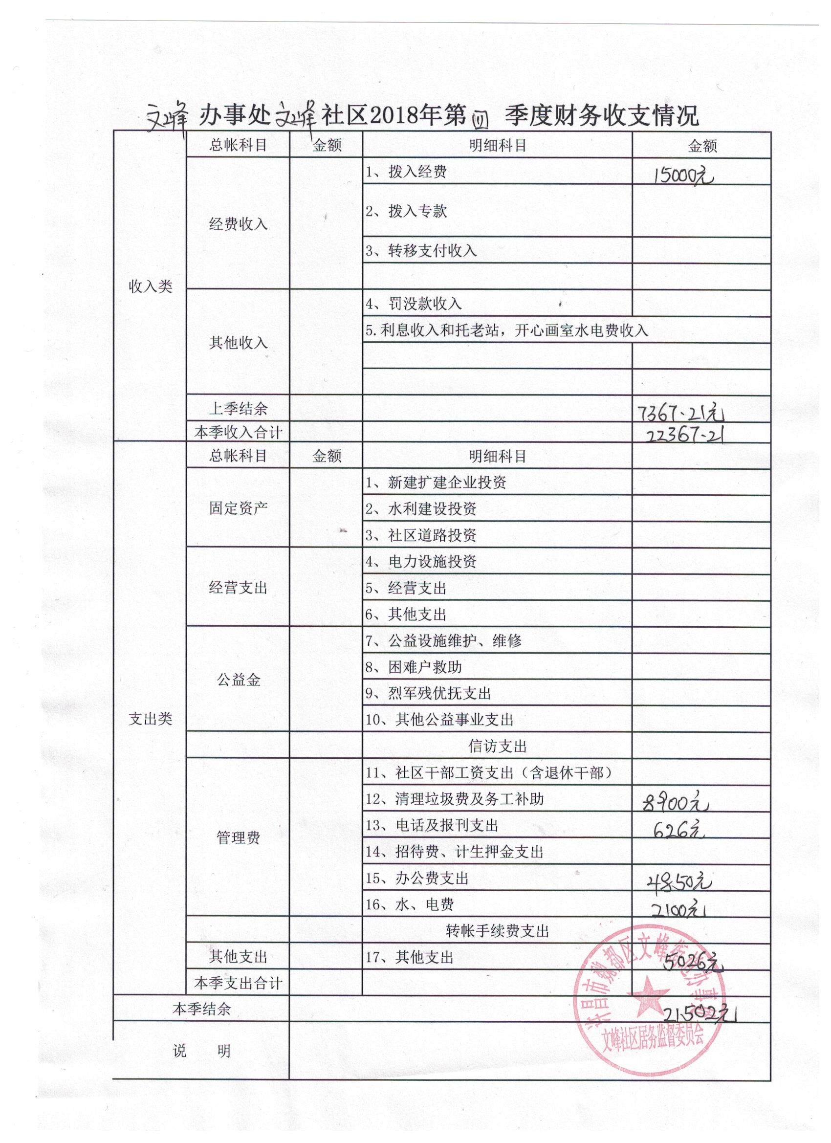 文峰办事处文峰社区2018年第四季度财务公开表