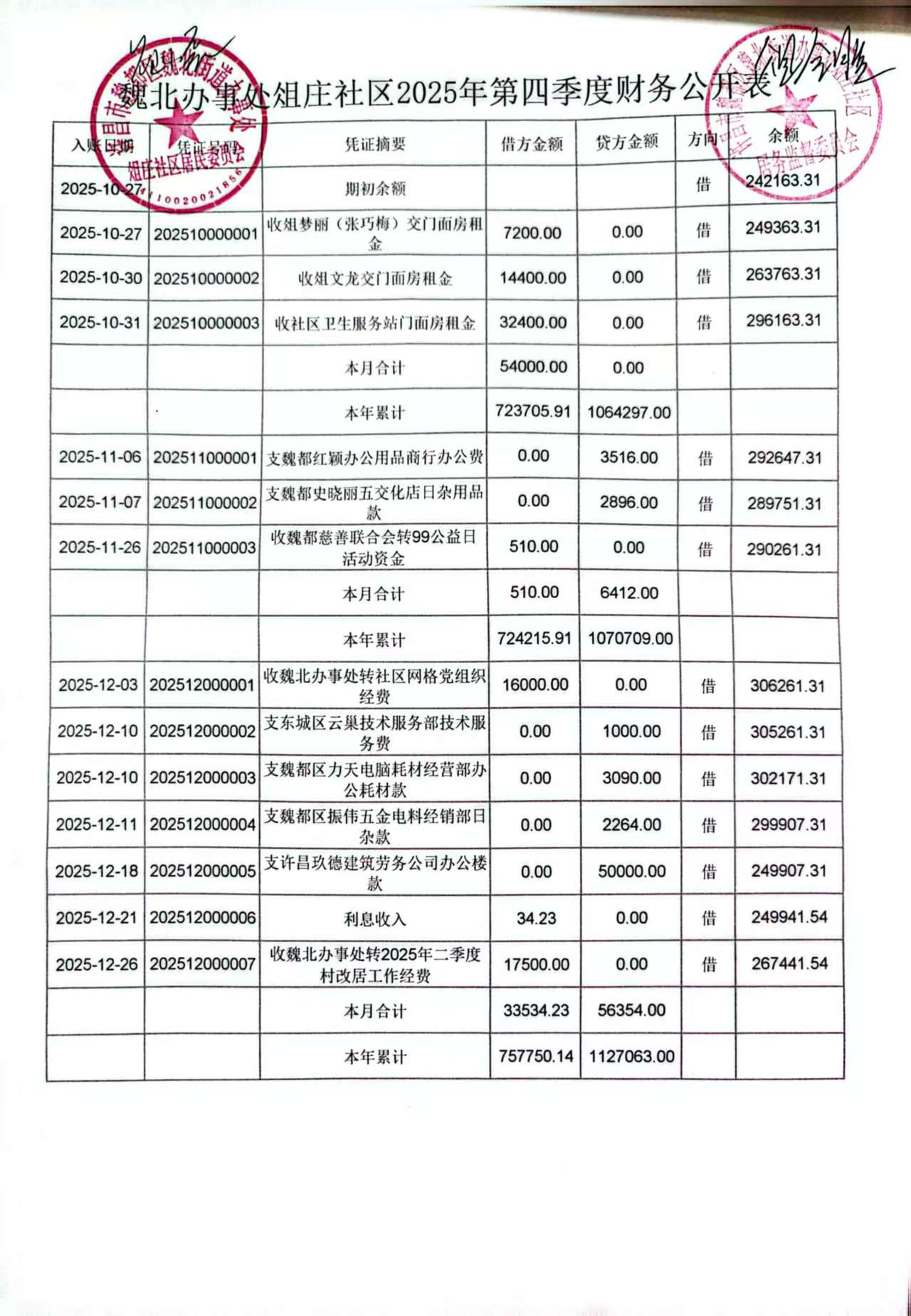 魏北街道办事处俎庄社区2025年第四季度银行存款收支公开表