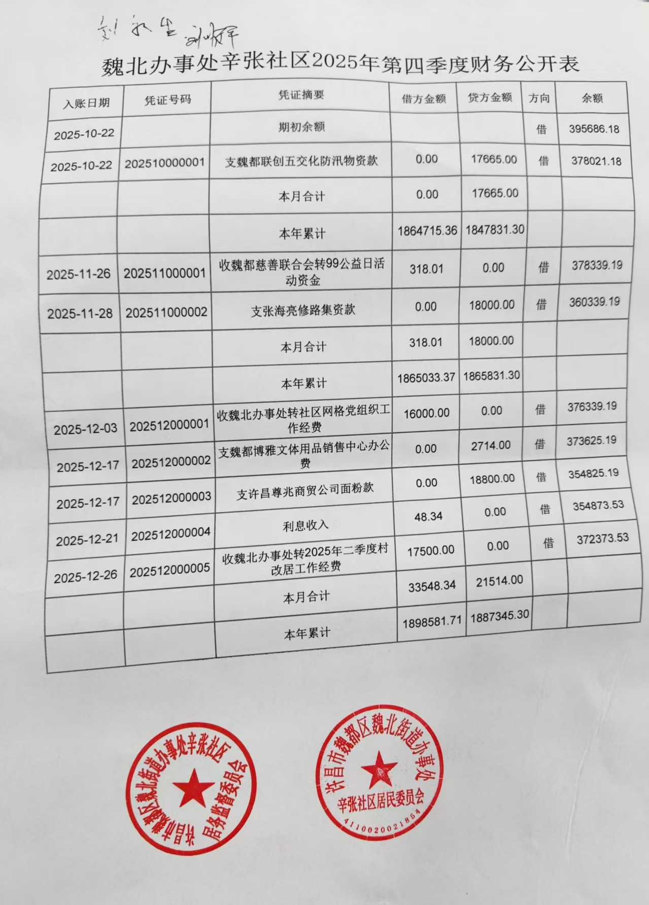 魏北街道办事处辛张社区2025年第四季度银行存款收支公开表