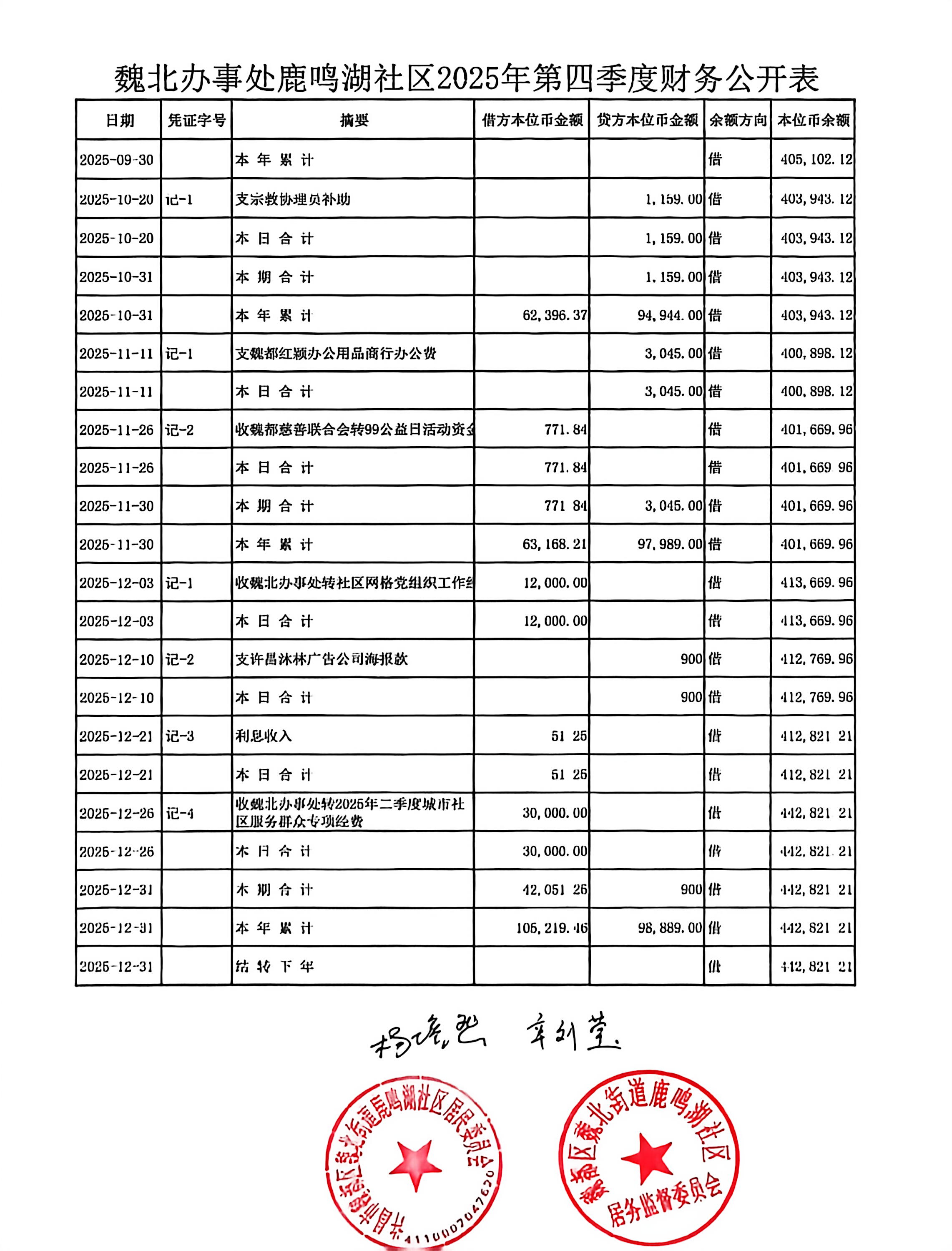 魏北街道办事处鹿鸣湖社区2025年第四季度银行存款收支公开表