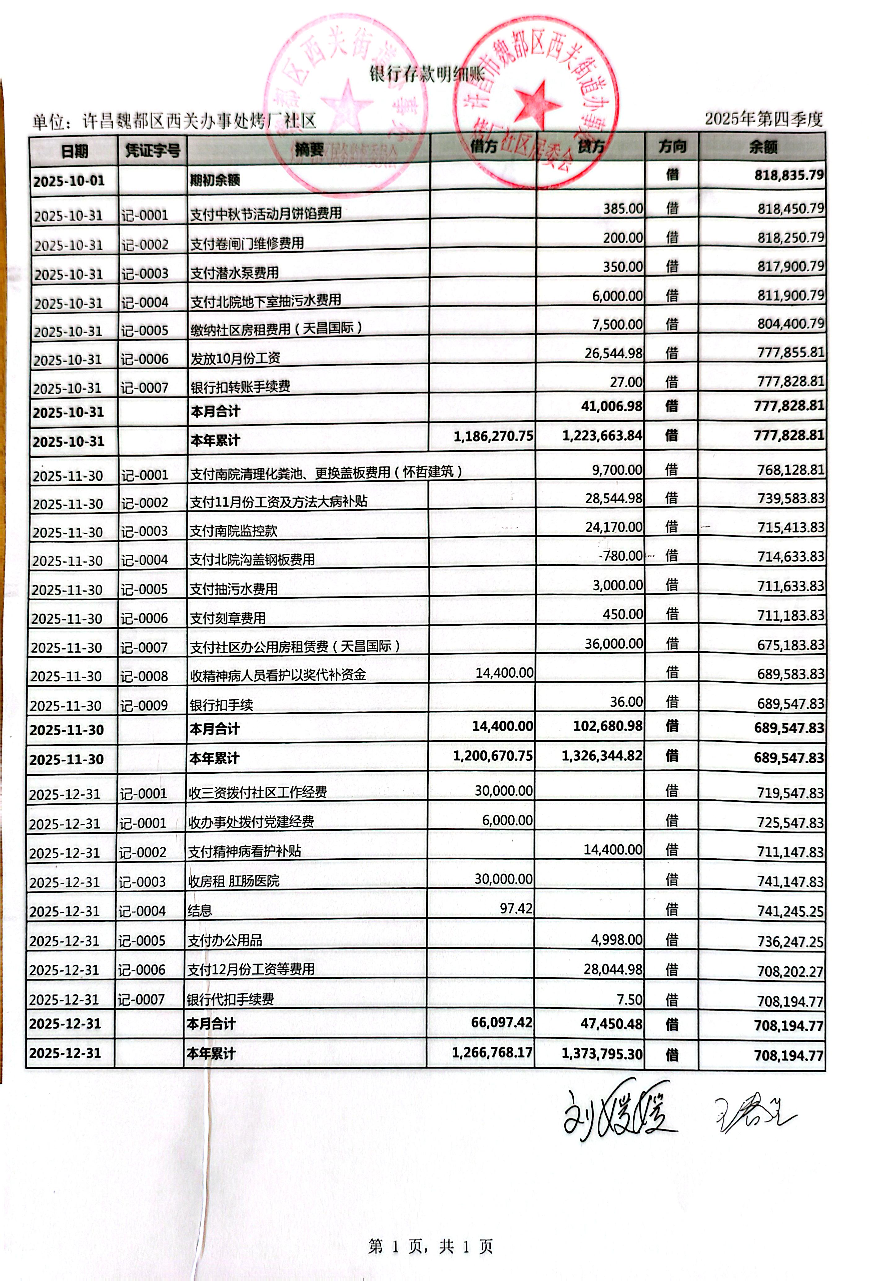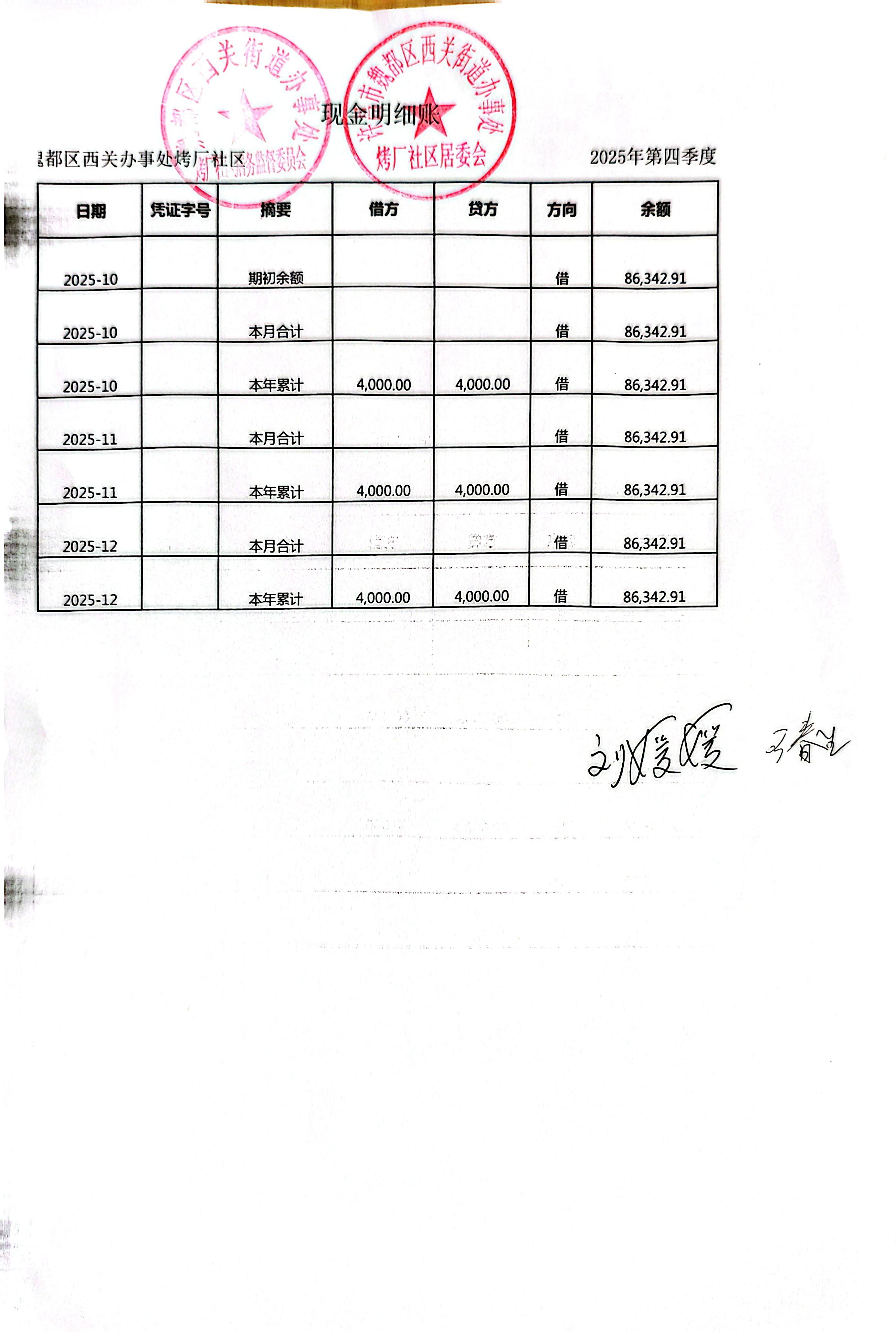西关街道办事处烤厂社区2025年第四季度现金账、银行存款收支公开表
