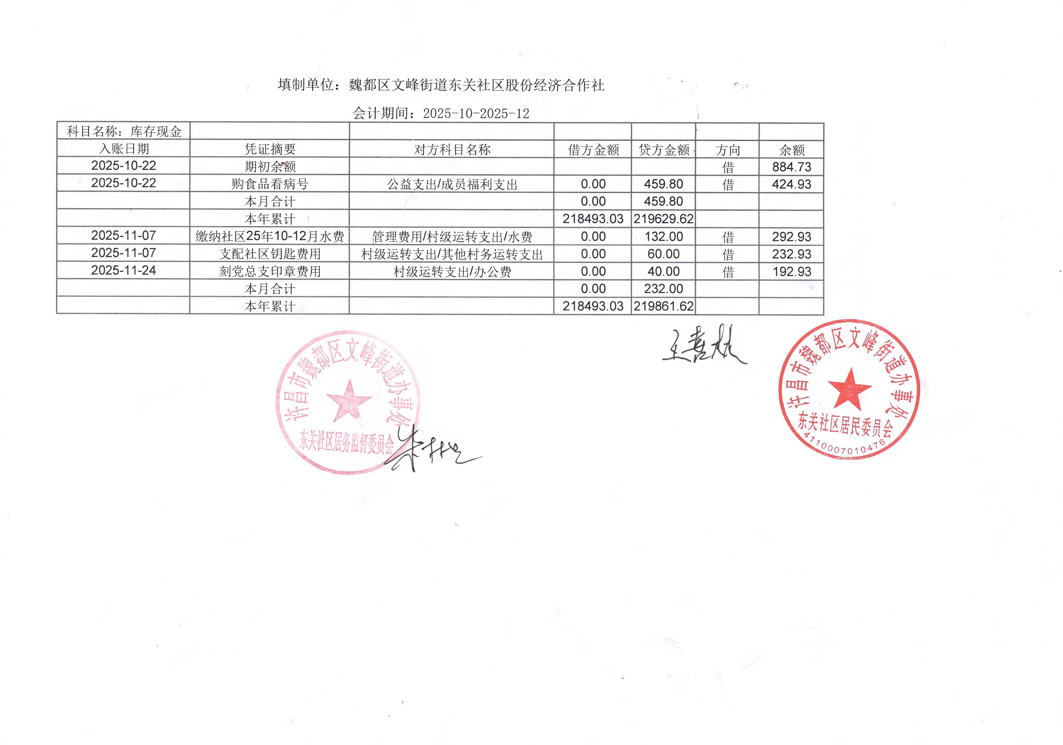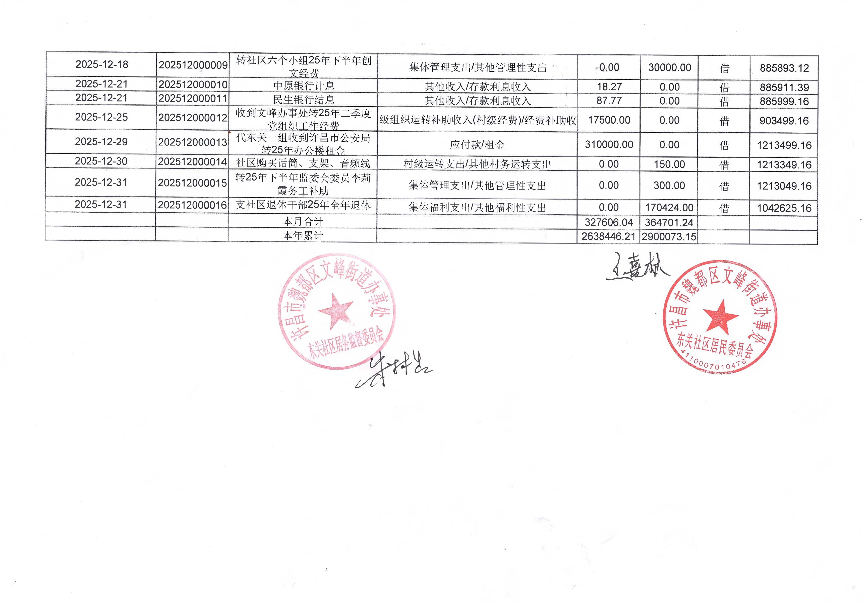 文峰办事处东关社区2025年第四季度现金、银行存款收支公开表