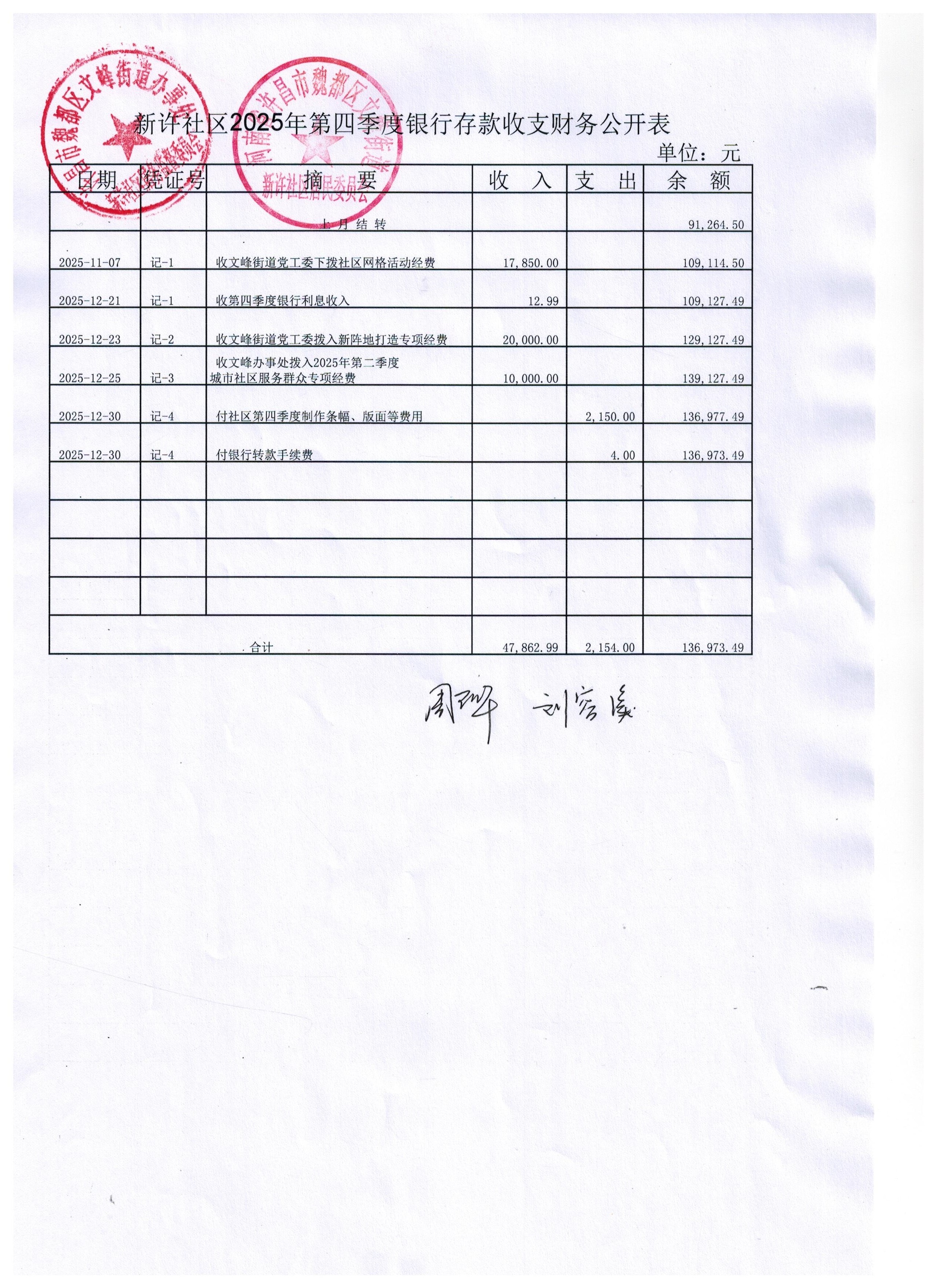 文峰办事处新许社区2025年第四季度银行存款收支公开表