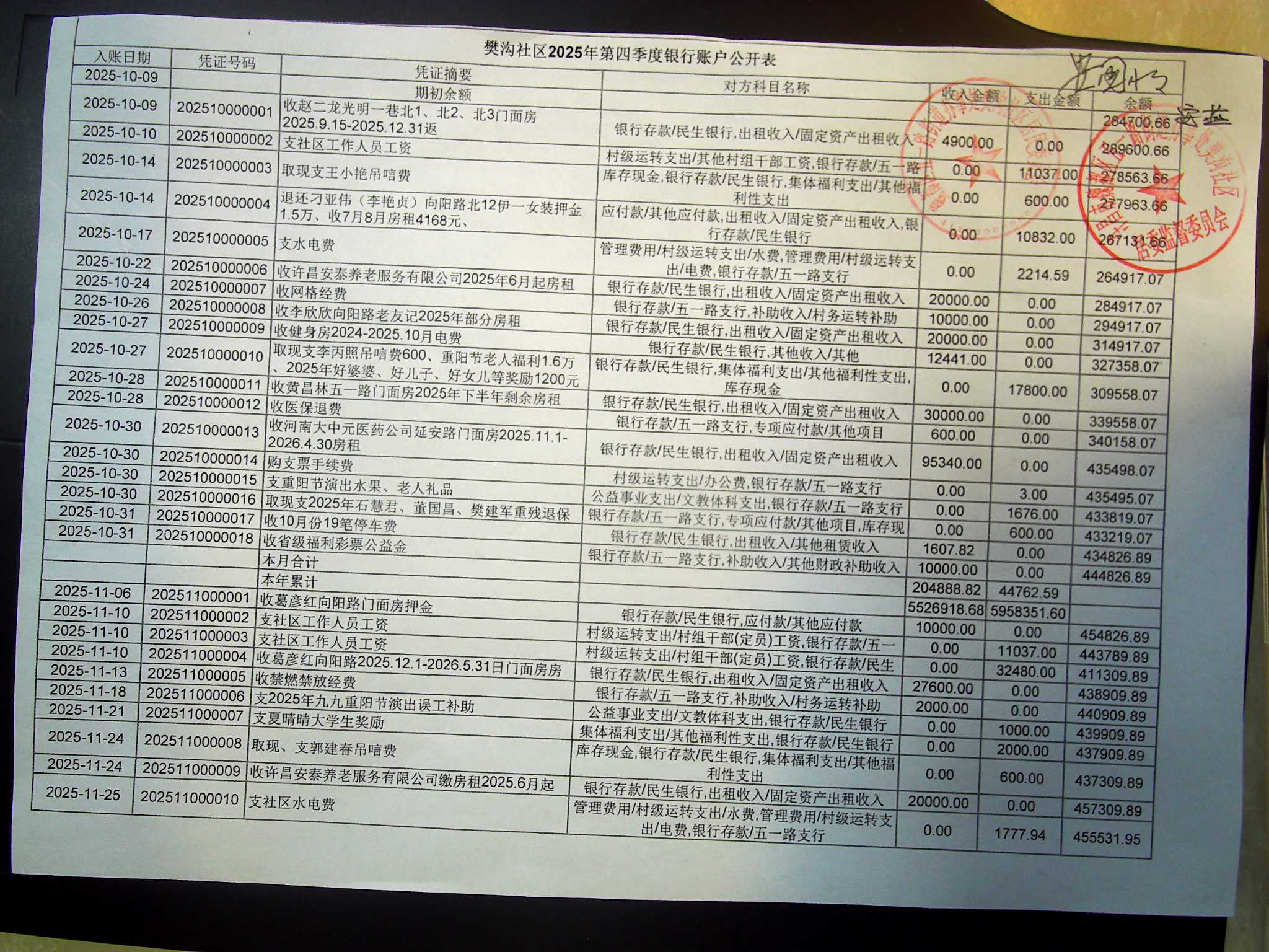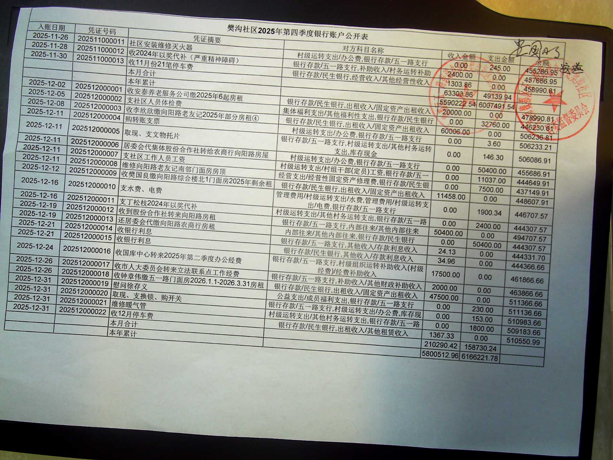 五一路街道办事处樊沟社区2025年第四季度银行存款收支公开表