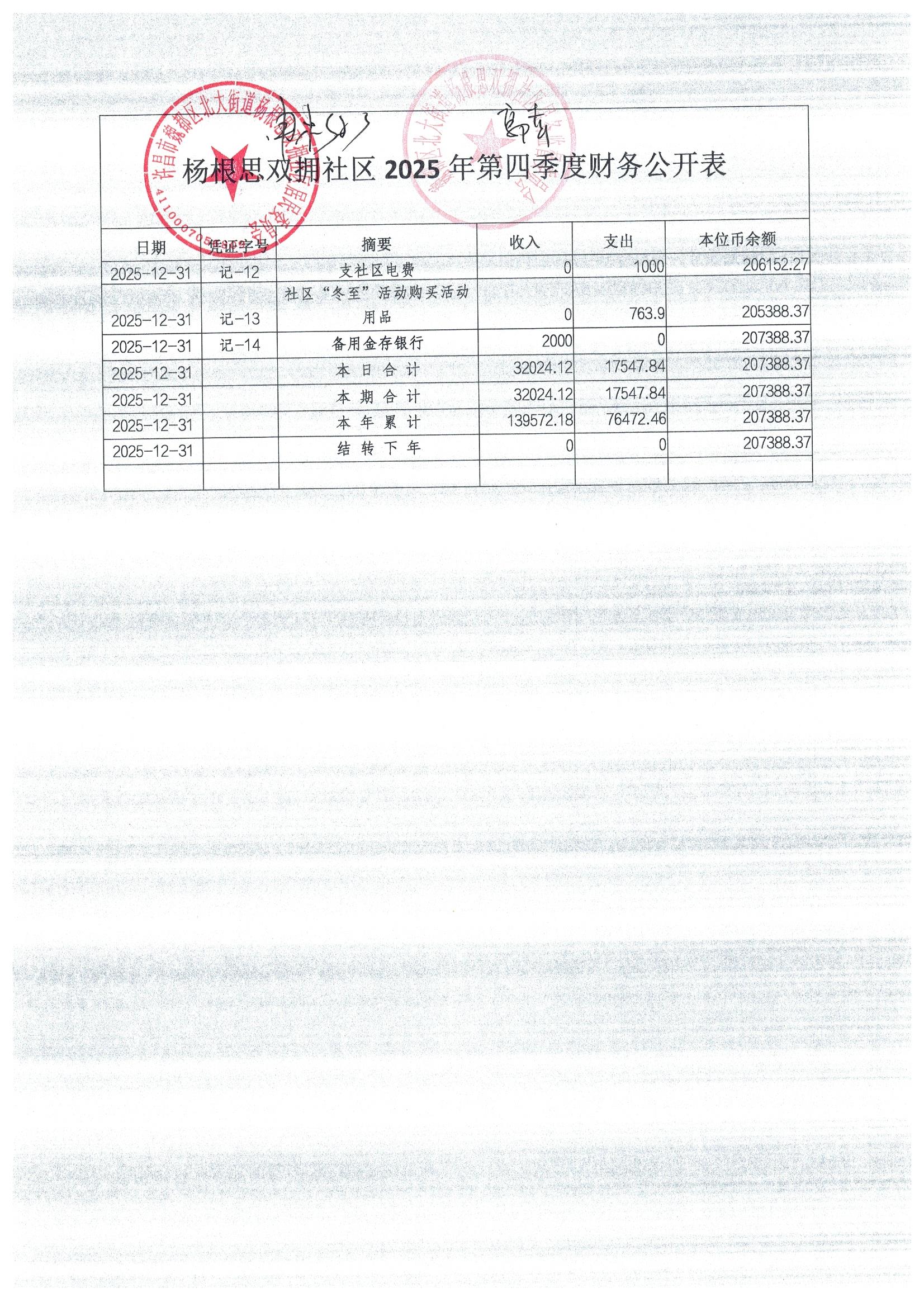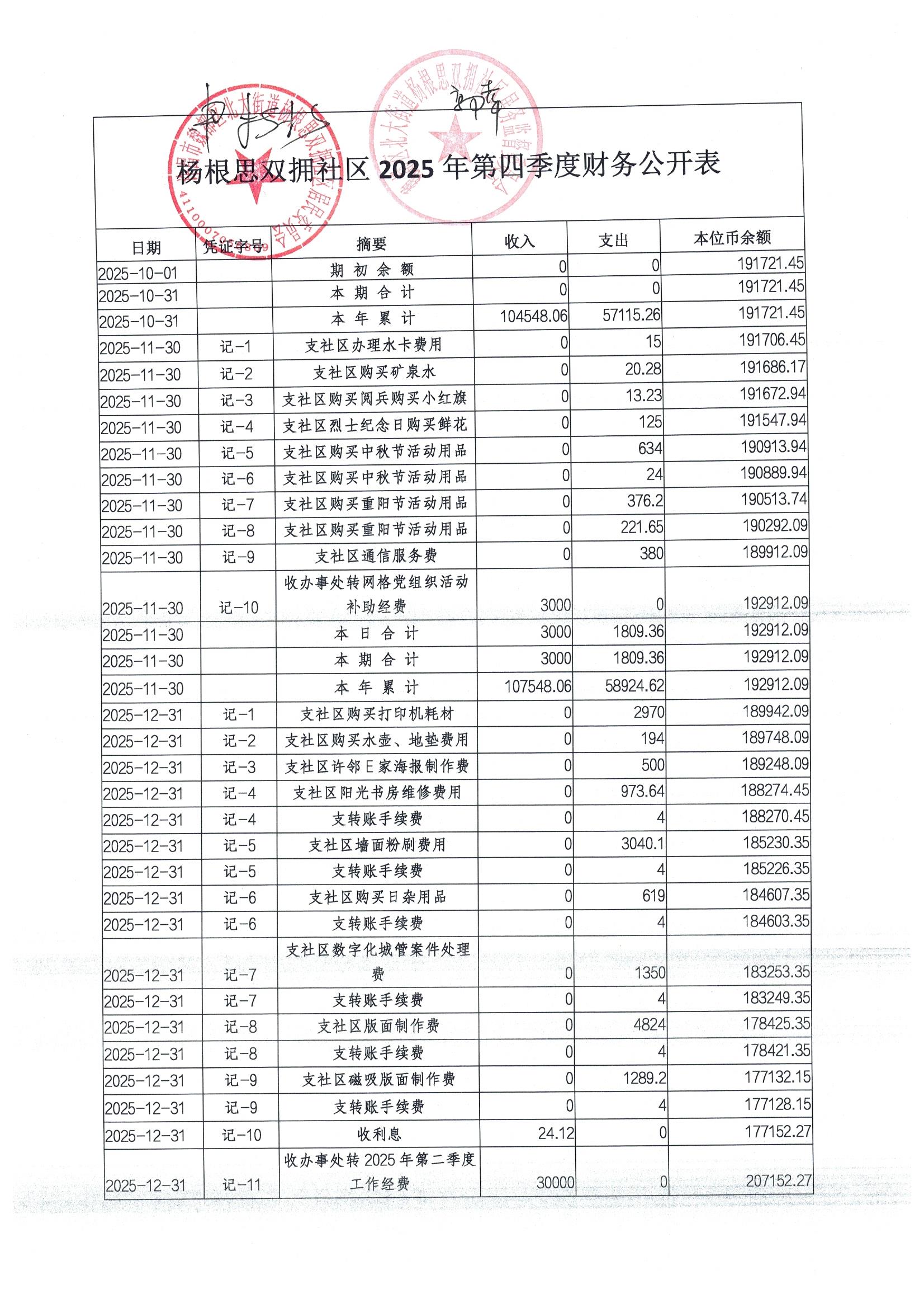北大街道办事处杨根思双拥社区2025年第四季度银行存款收支公开表