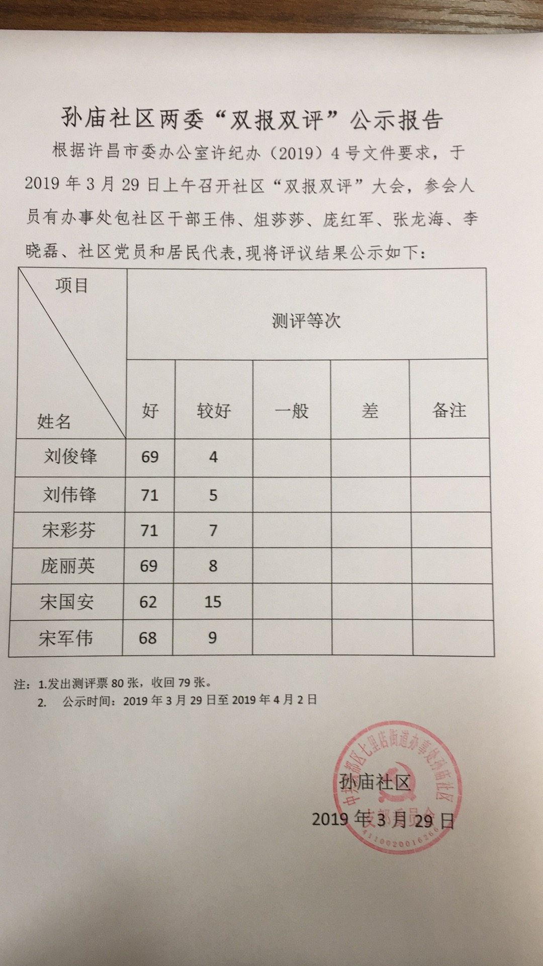 五一路办事处樊沟社区“双报双评”评议结果公示
