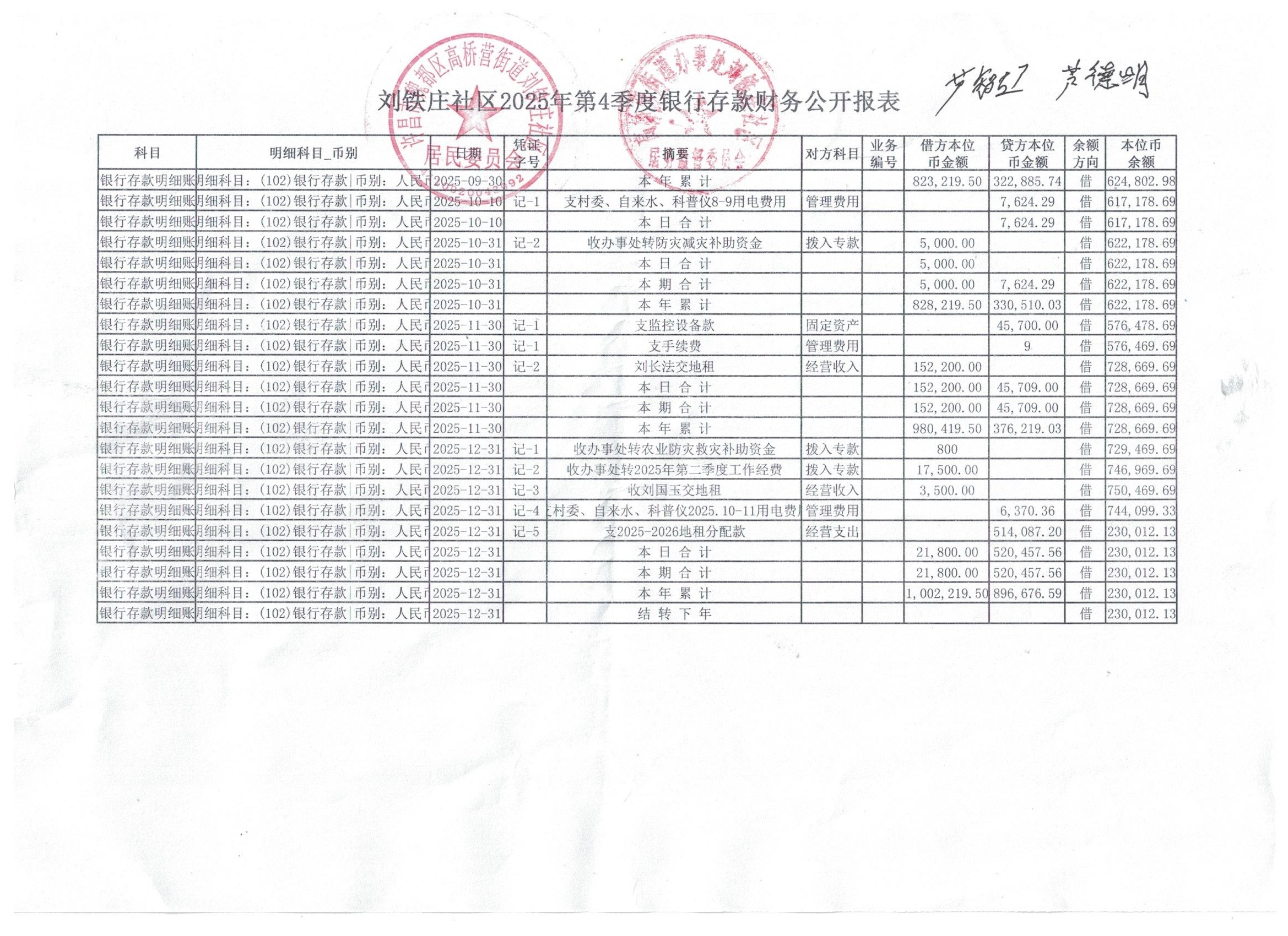 高桥营街道办事处刘铁庄社区2025年第四季度银行存款收支公开表