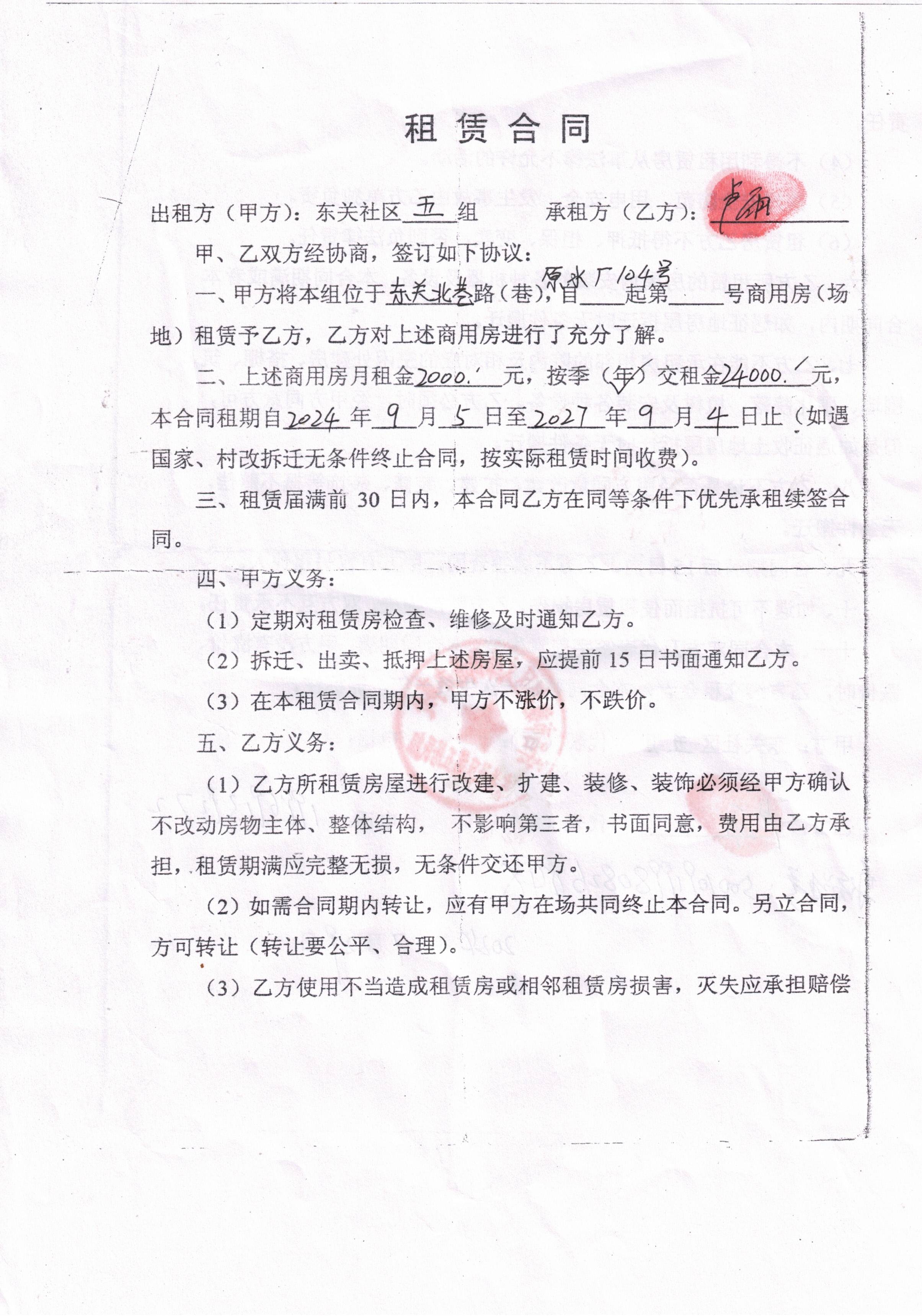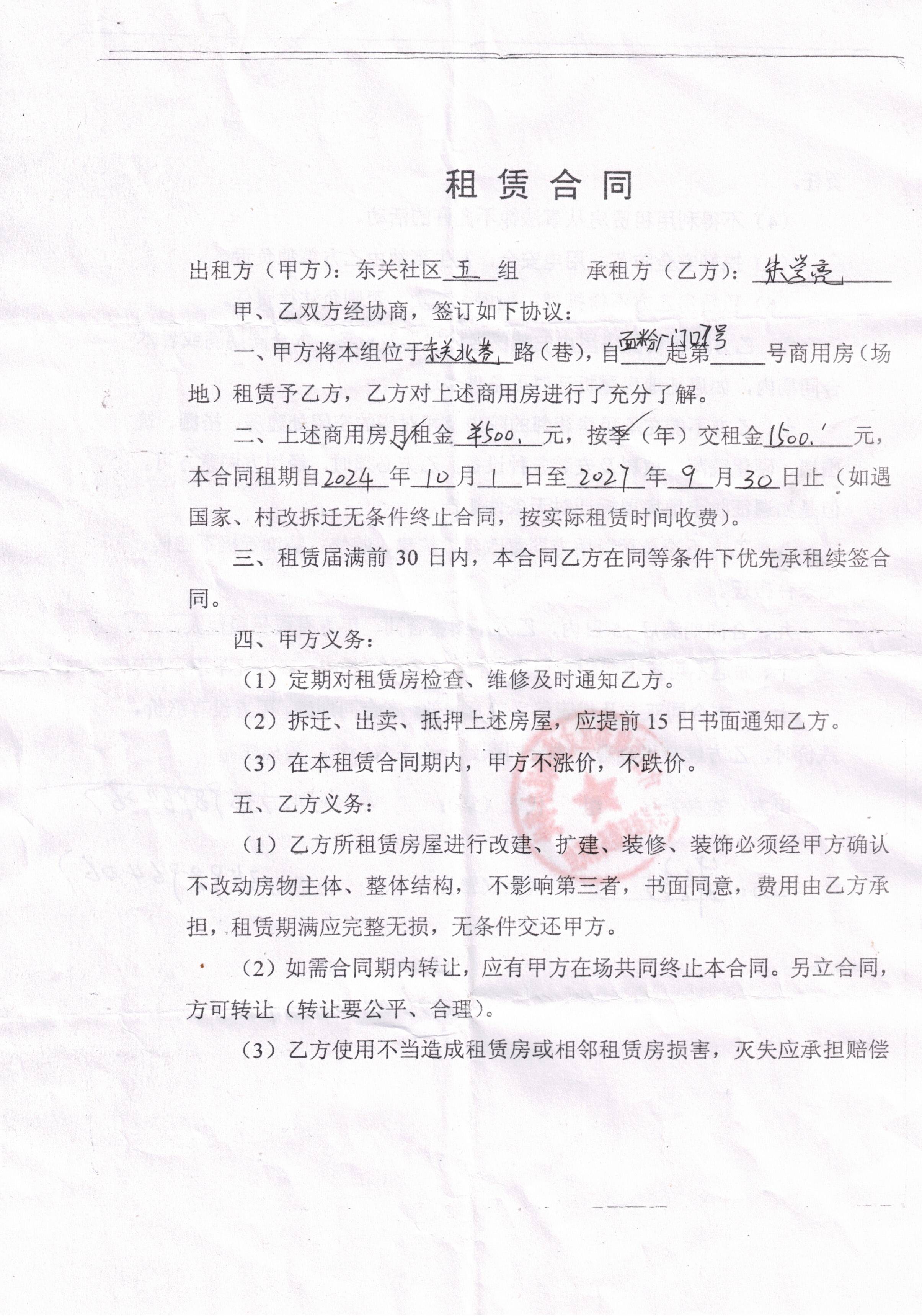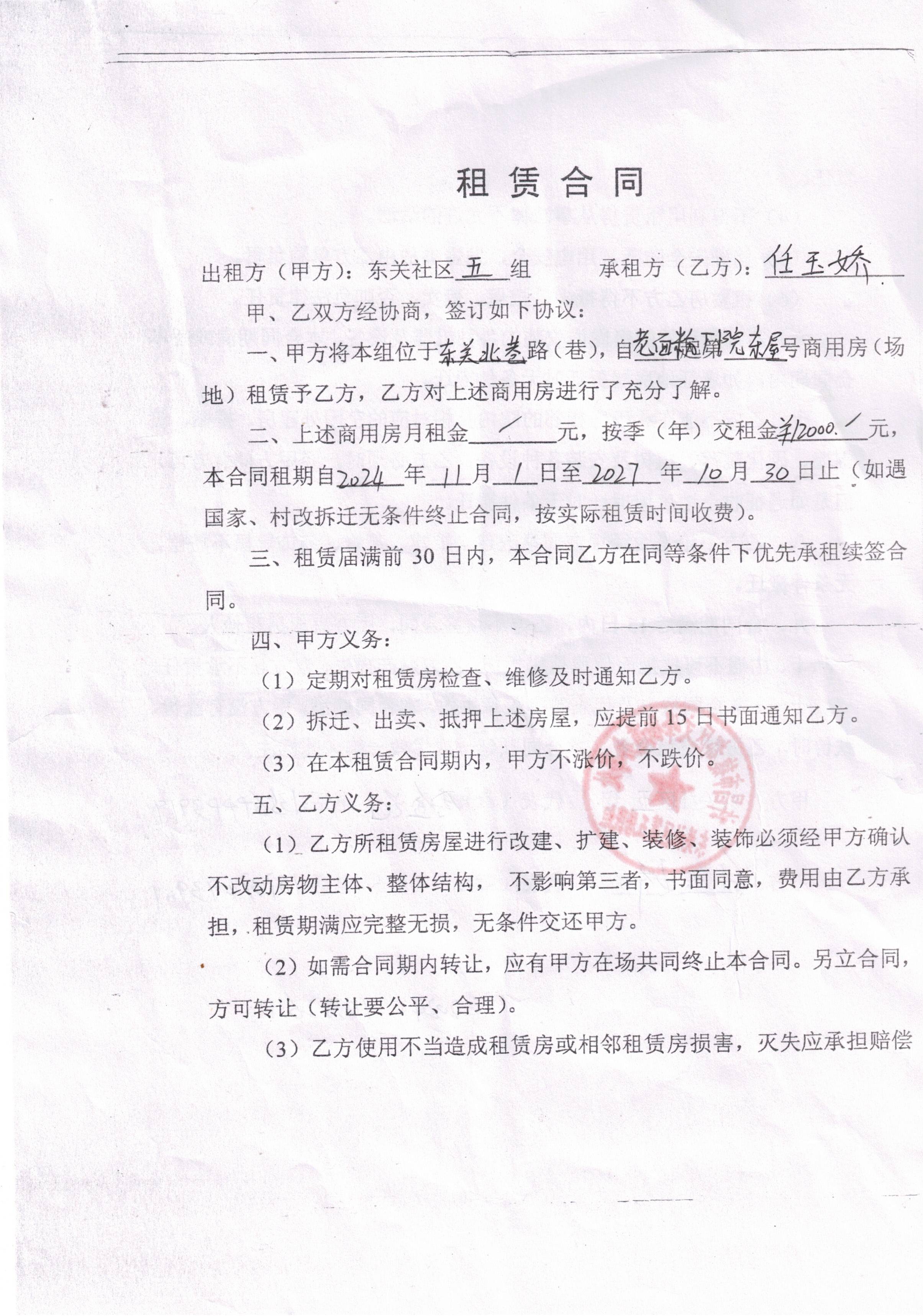 文峰办事处东关社区第五居民小组门面房及场院租赁协议