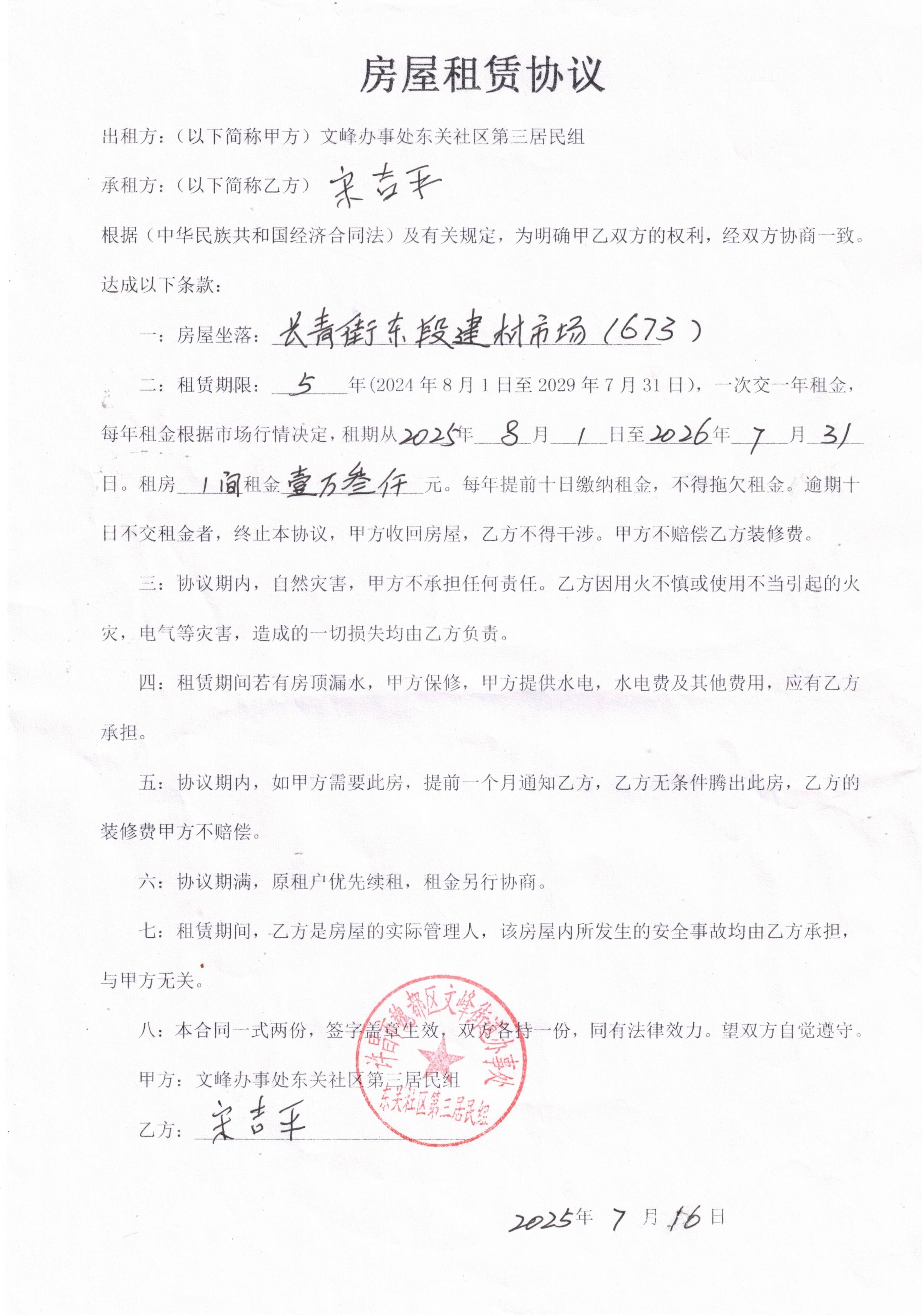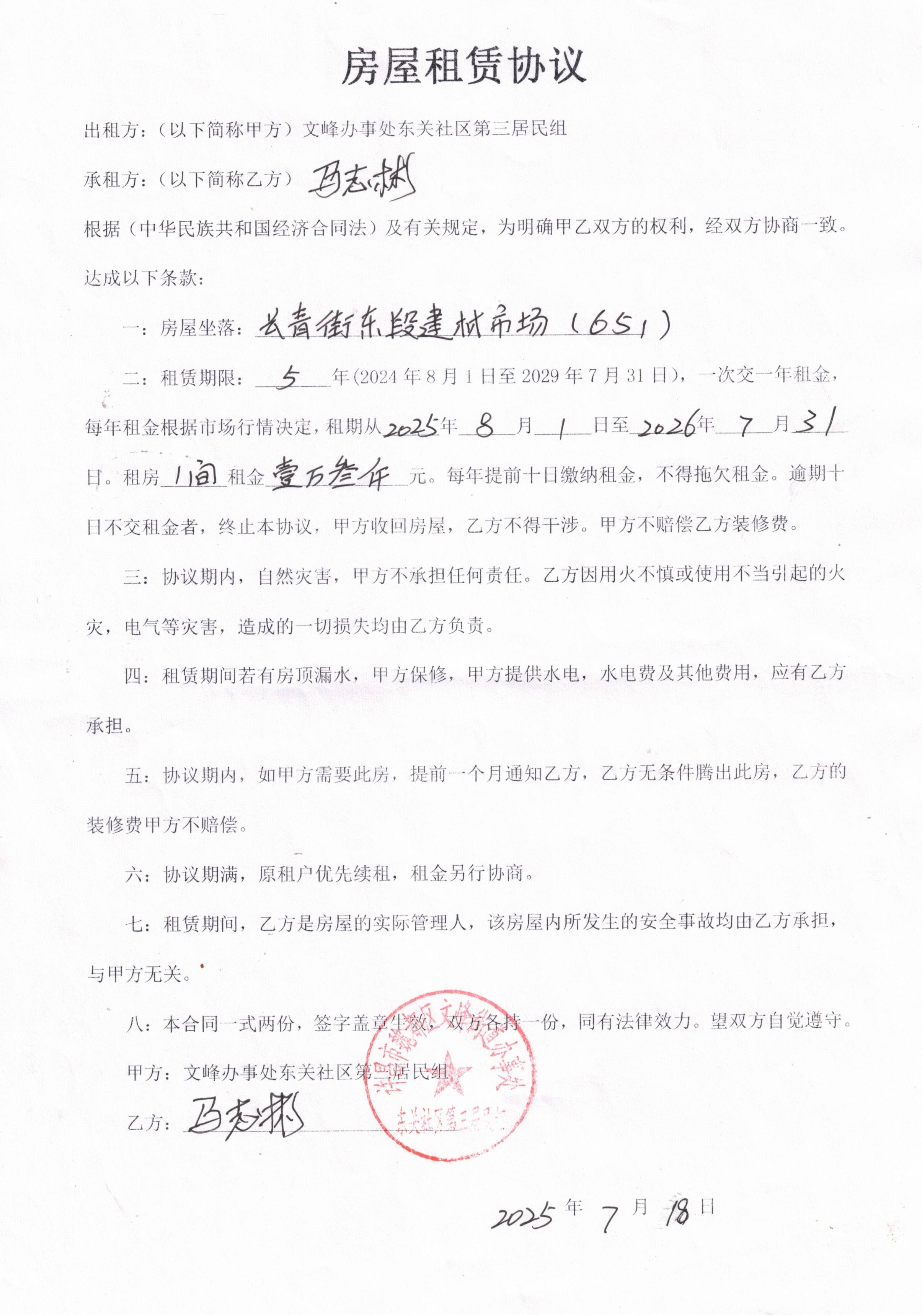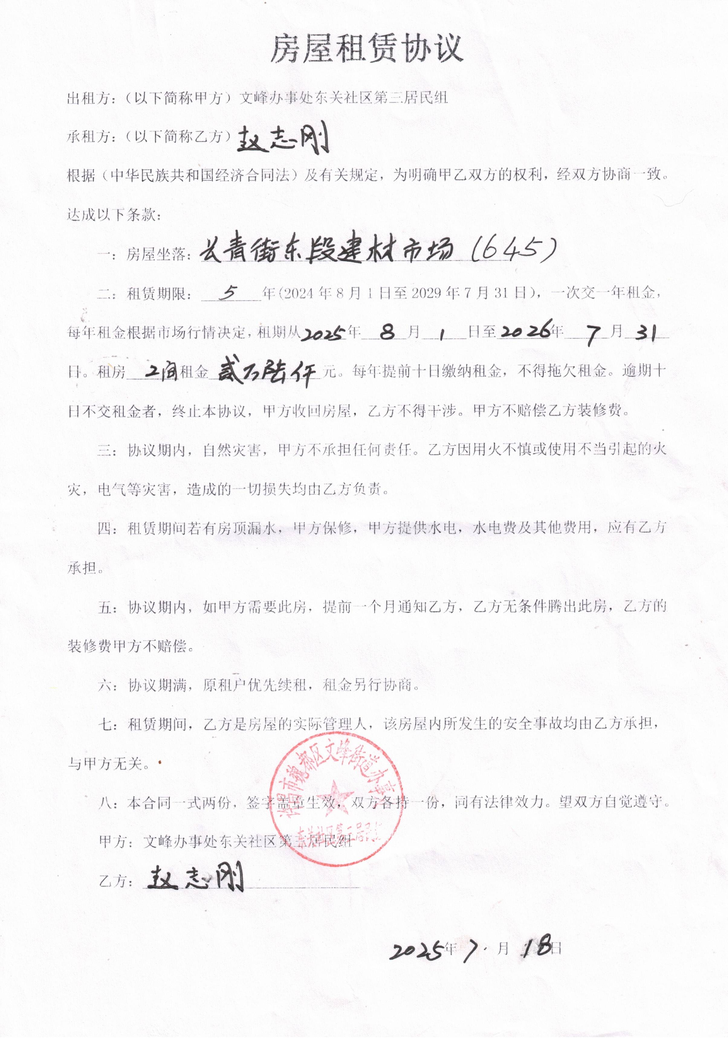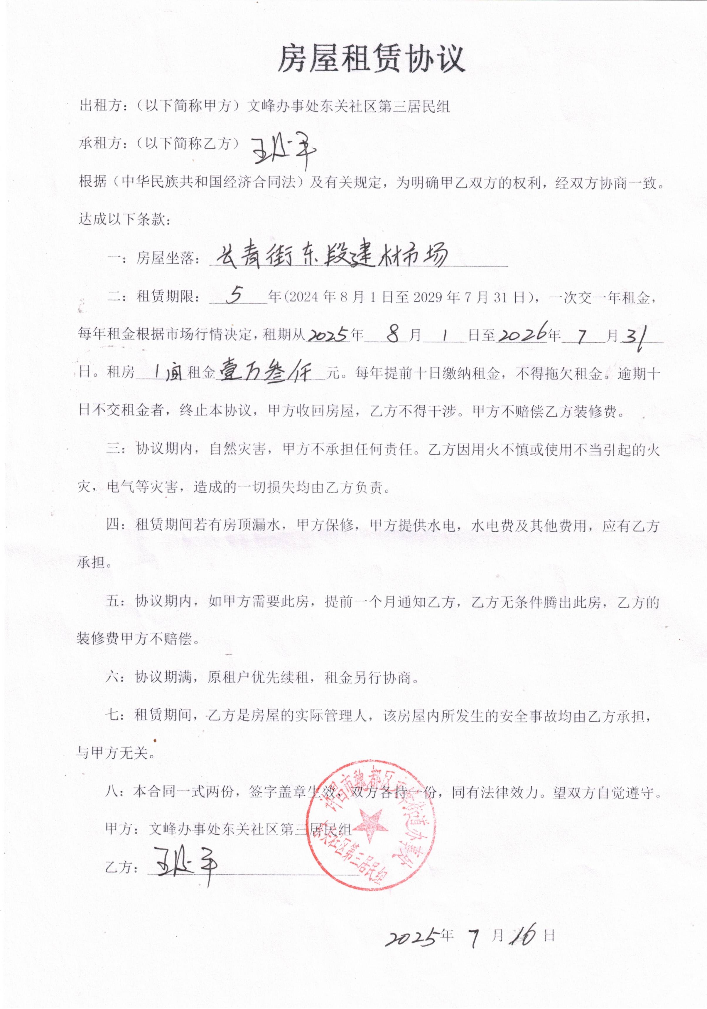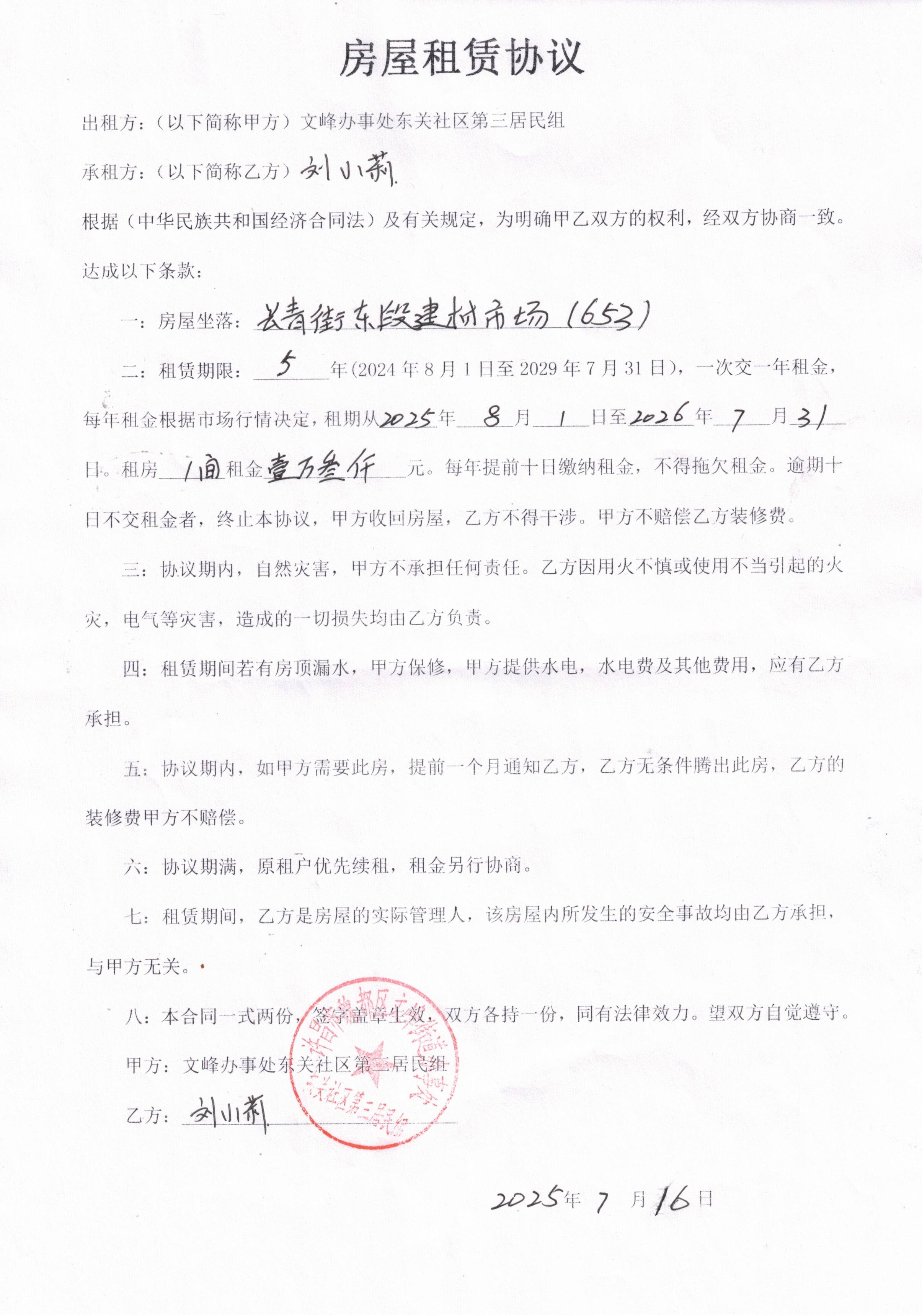 文峰办事处东关社区第二居民小组门面房及场院租赁协议