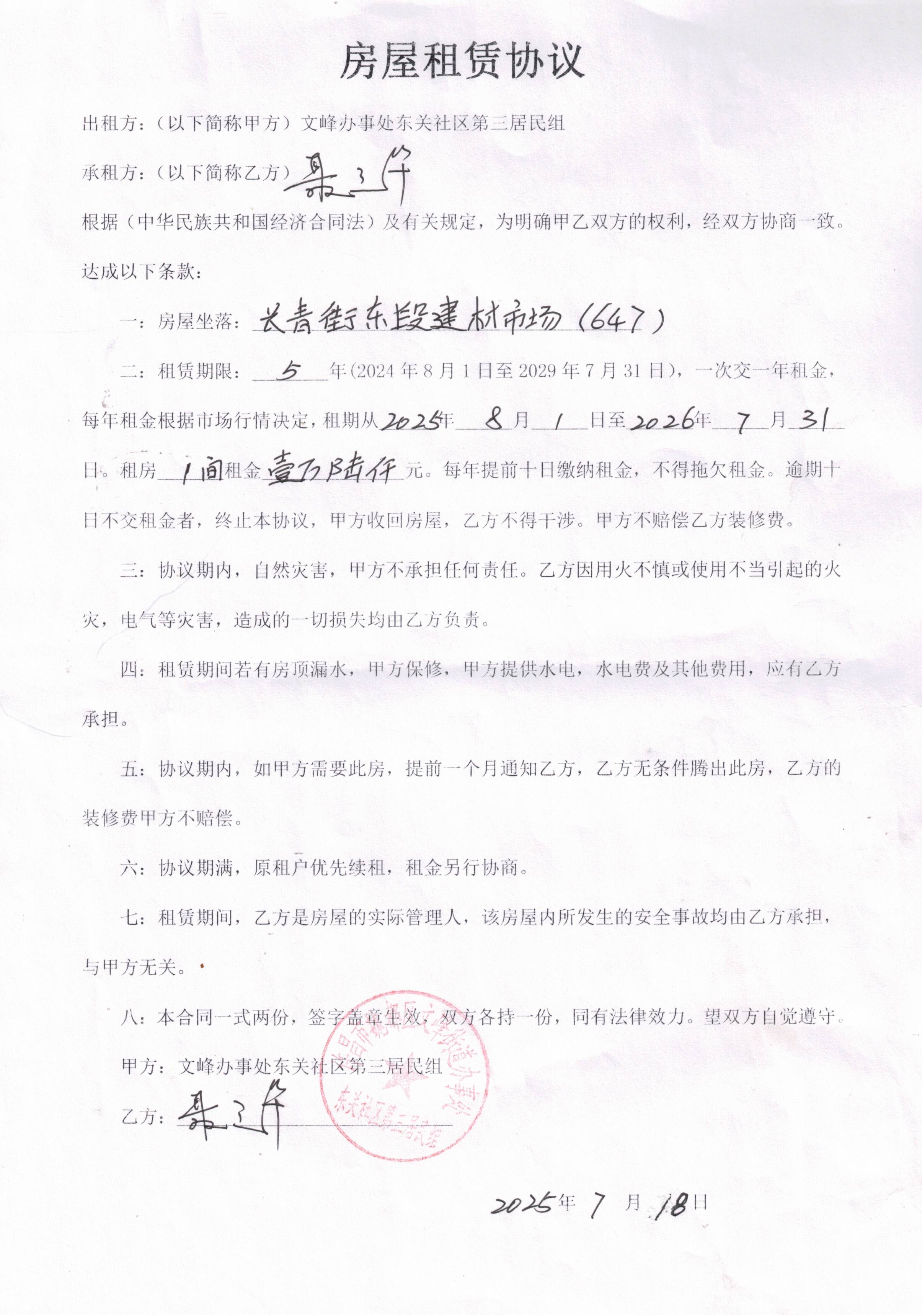 文峰办事处东关社区第三居民小组门面房及场院租赁协议