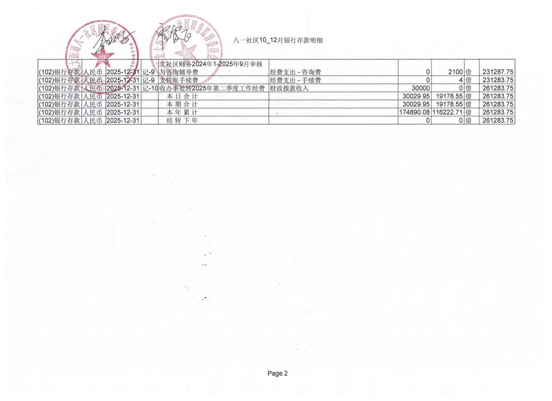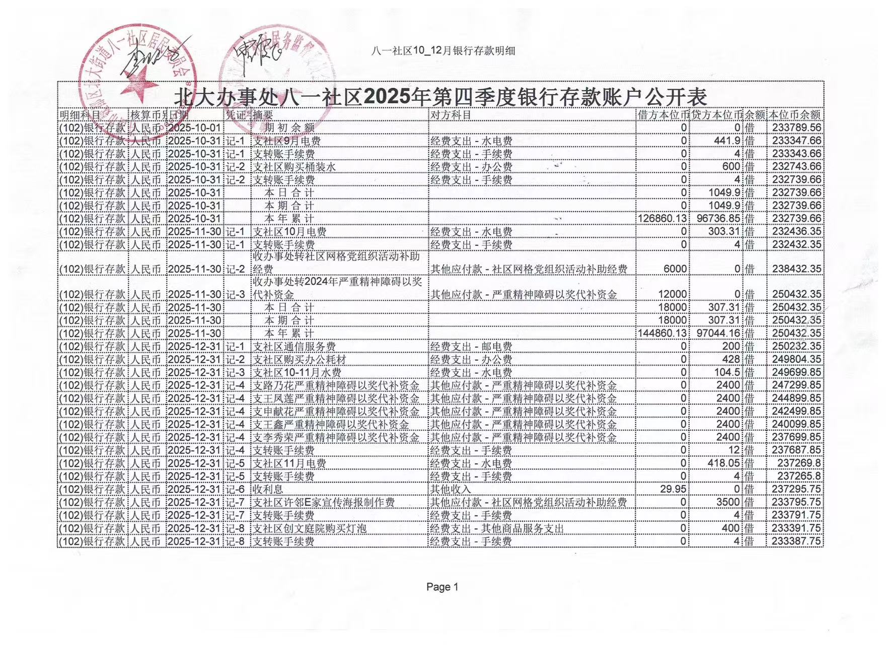 北大街道办事处八一社区2025年第四季度银行存款收支公开表