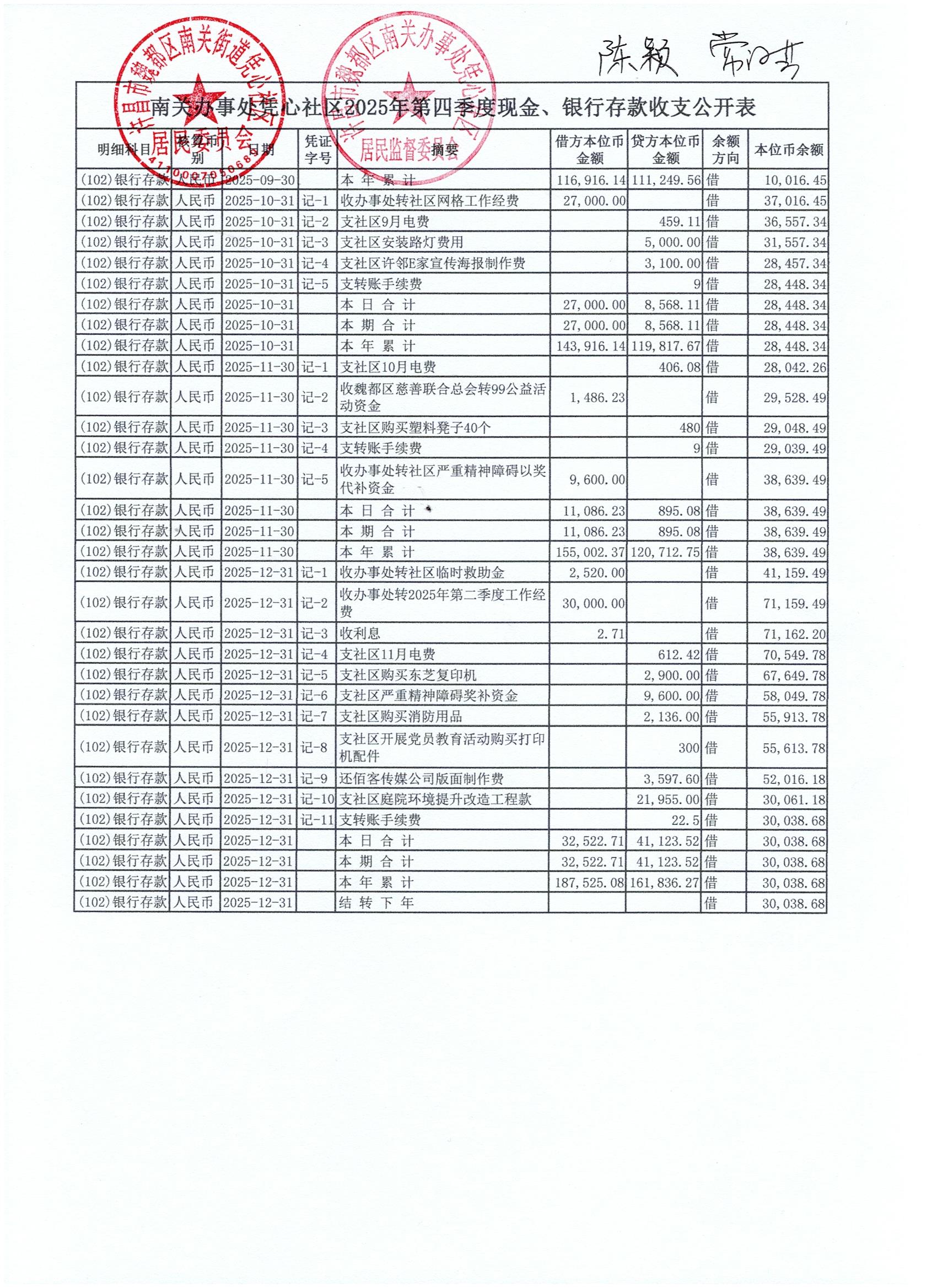 南关街道办事七一社区2025年第四季度银行存款收支公开表