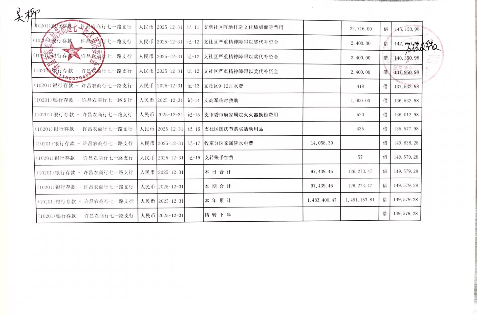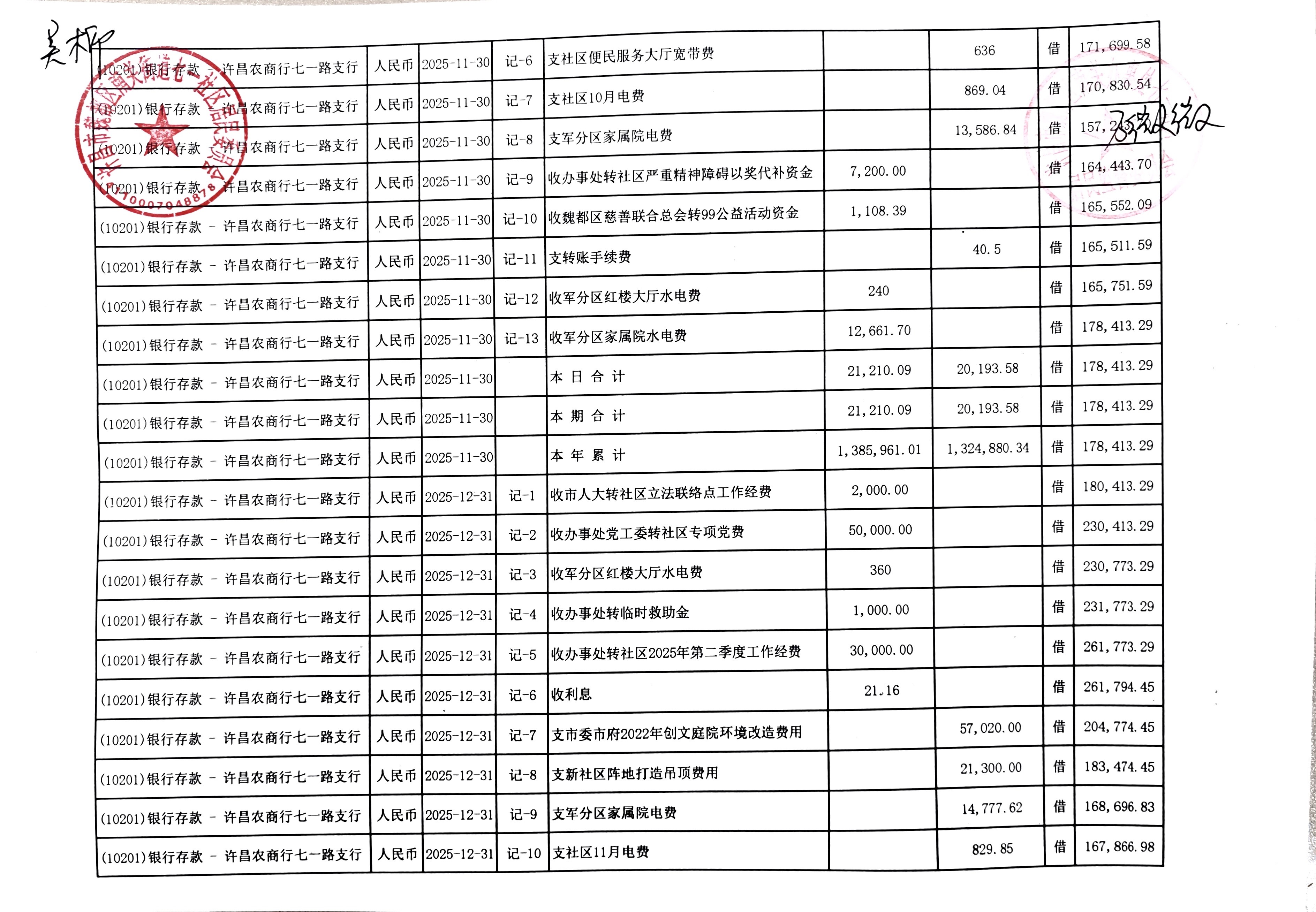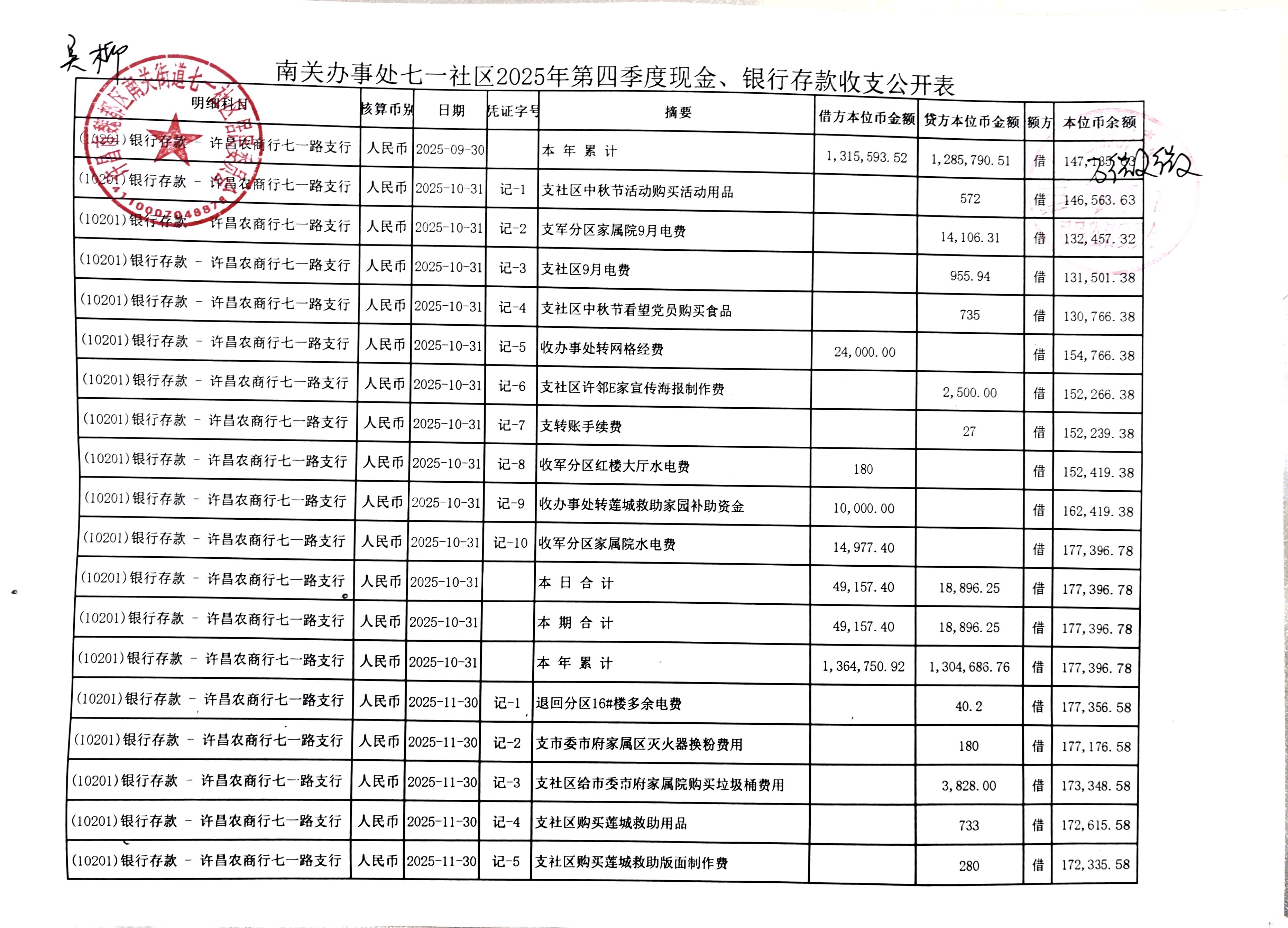 南关街道办事七一社区2025年第四季度银行存款收支公开表