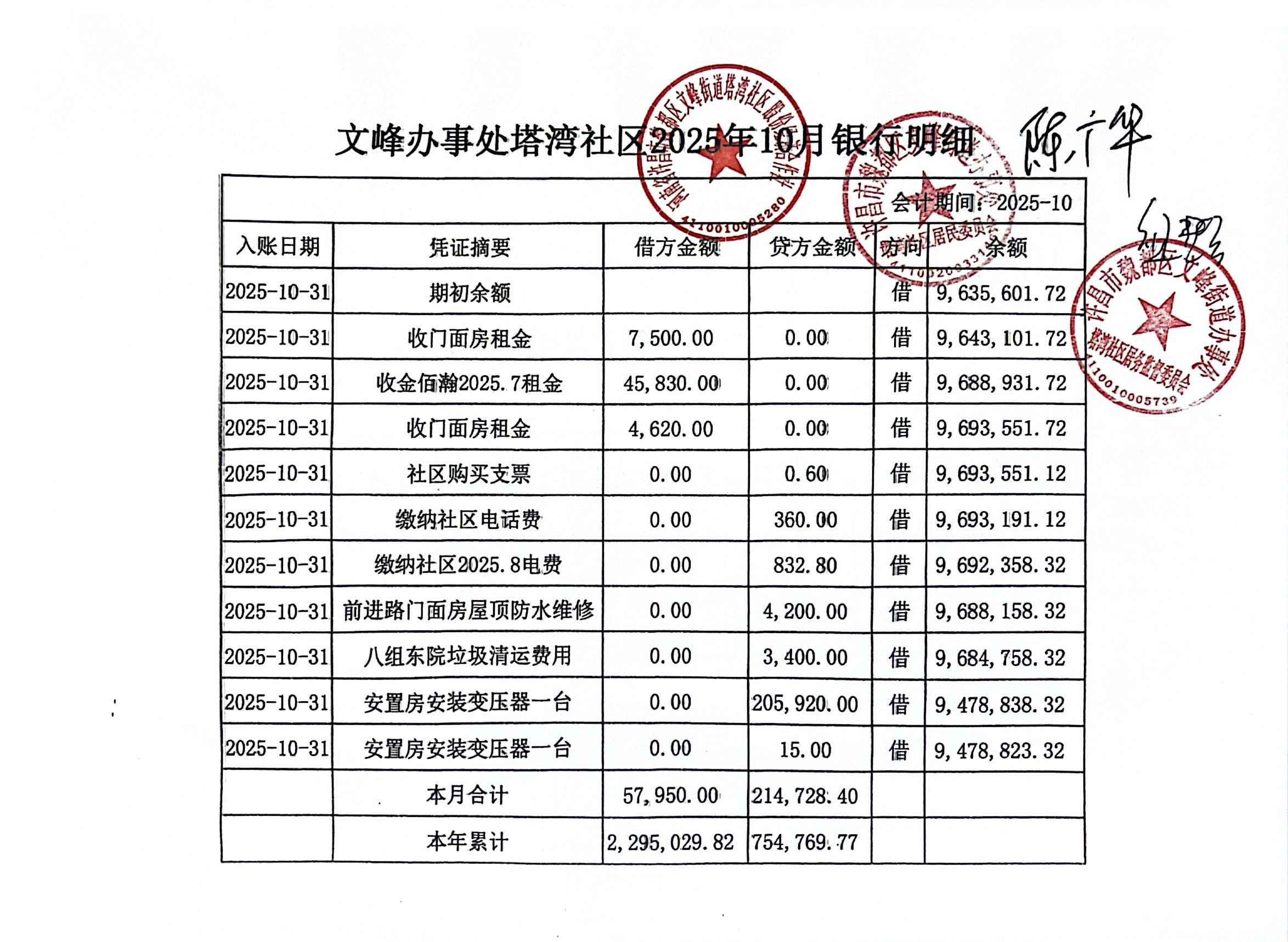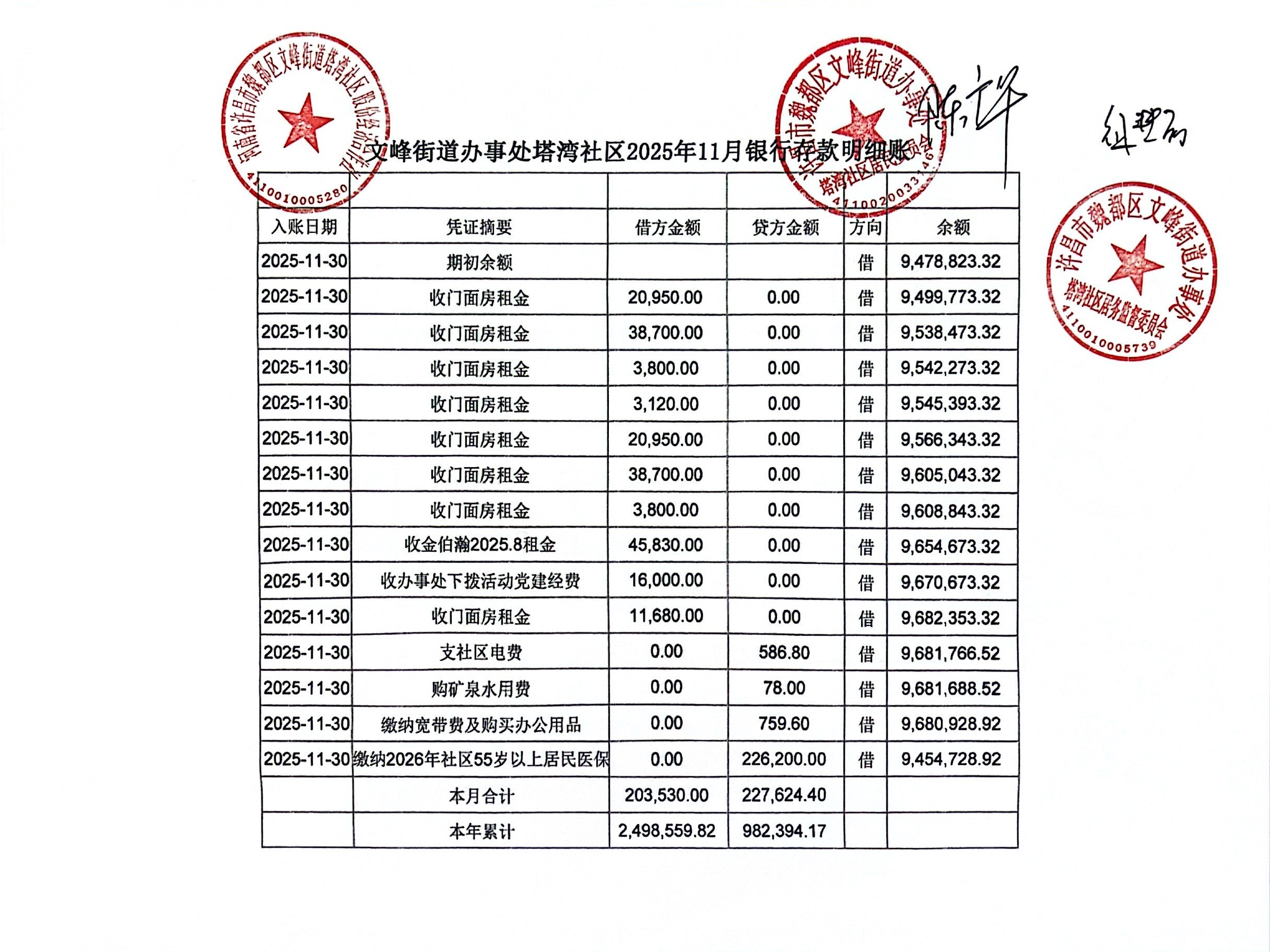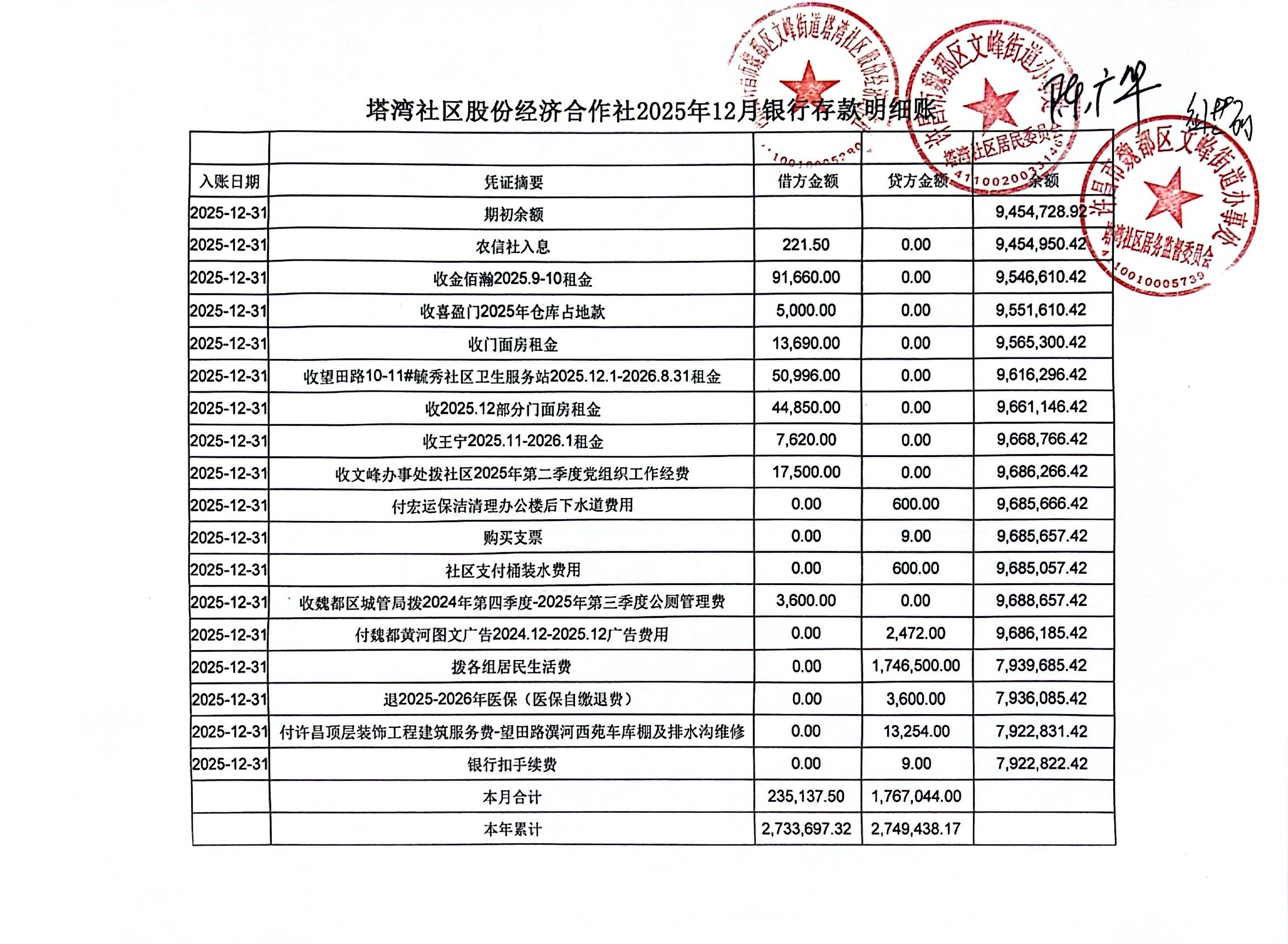 文峰办事处塔湾社区2025年第四季度银行存款收支公开表
