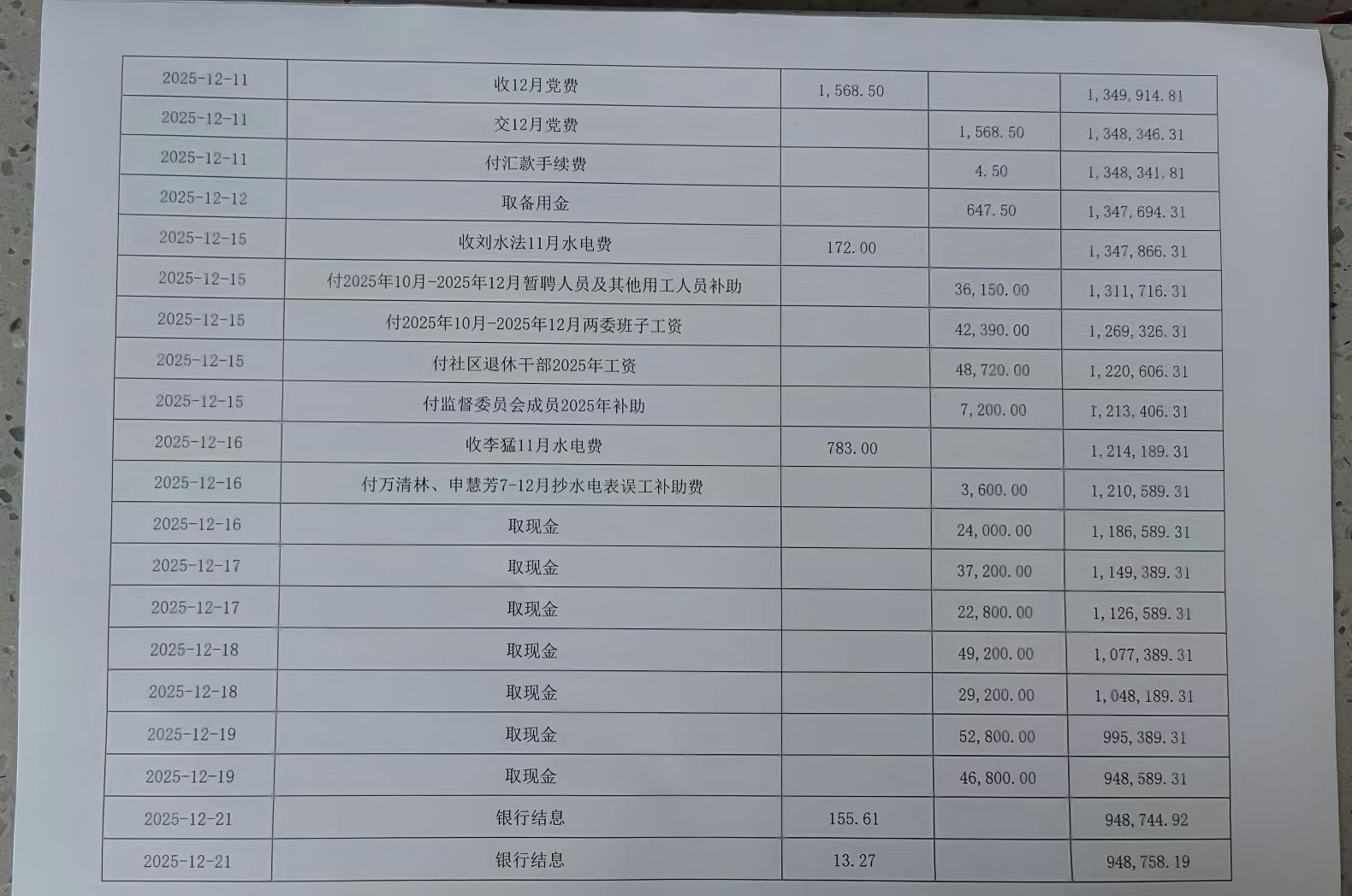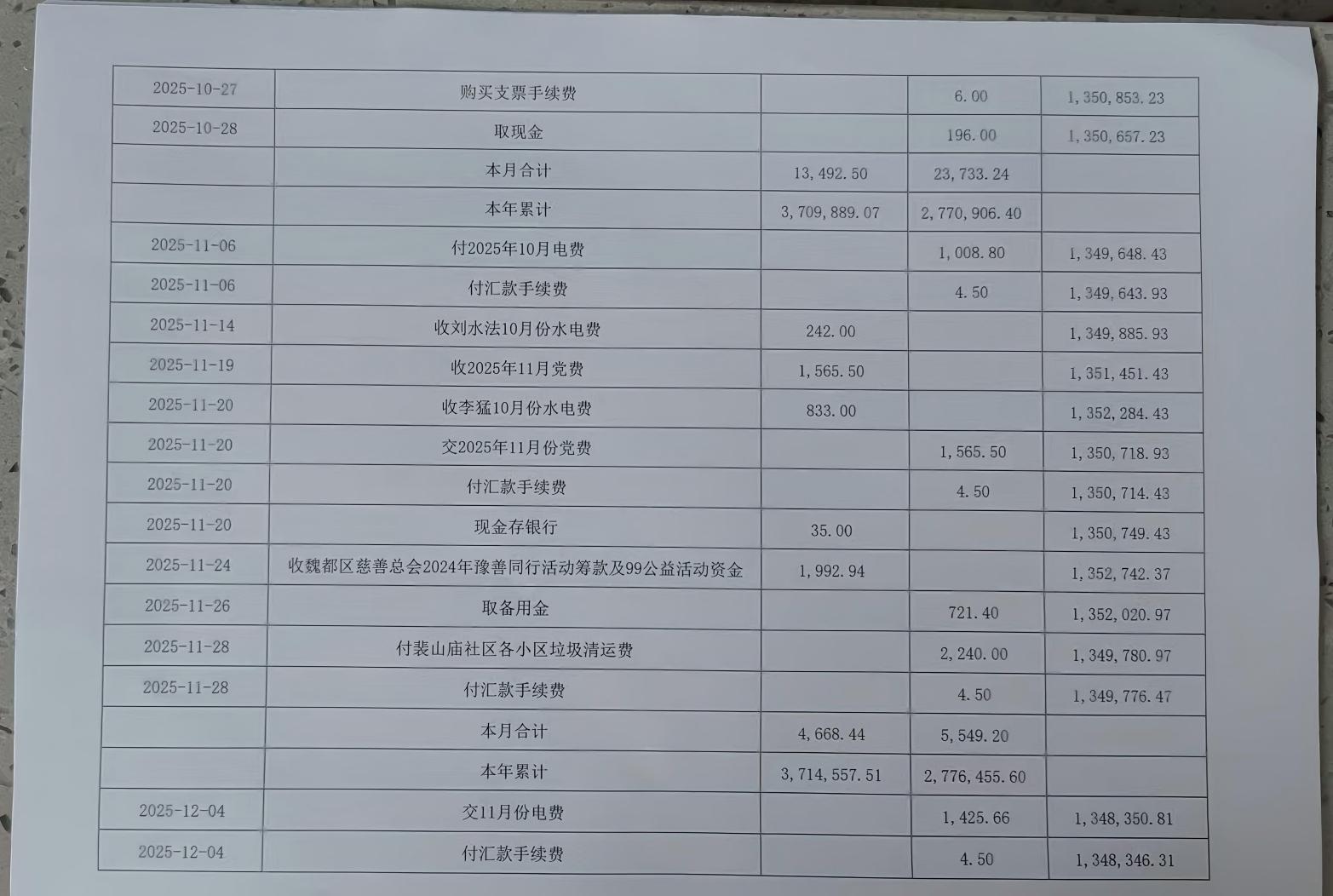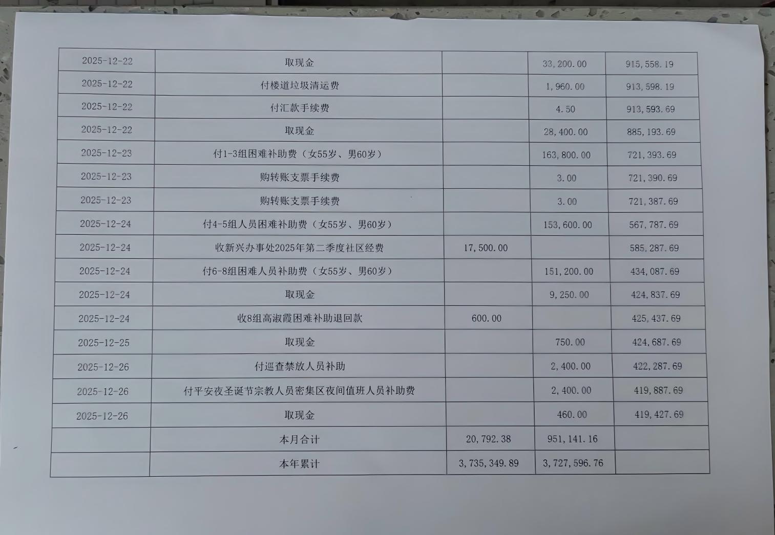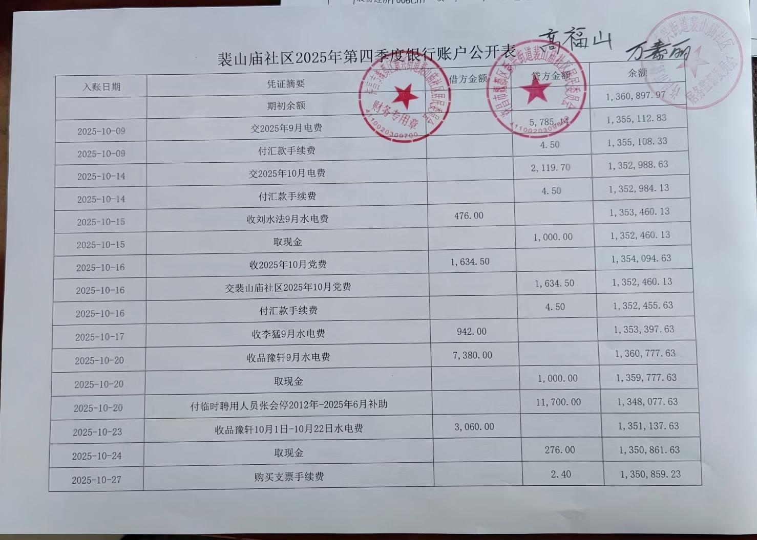 新兴街道办事处裴山庙社区2025年第四季度银行存款收支公开表