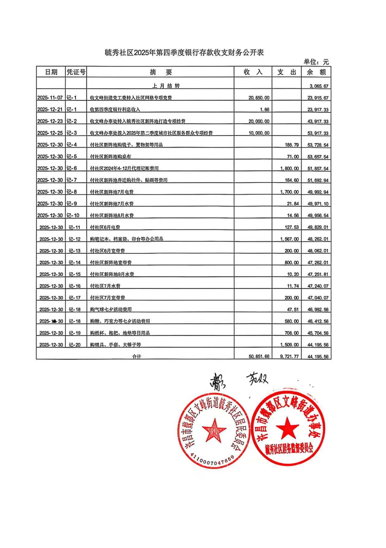 文峰办事处毓秀社区2025年第四季度银行存款收支公开表