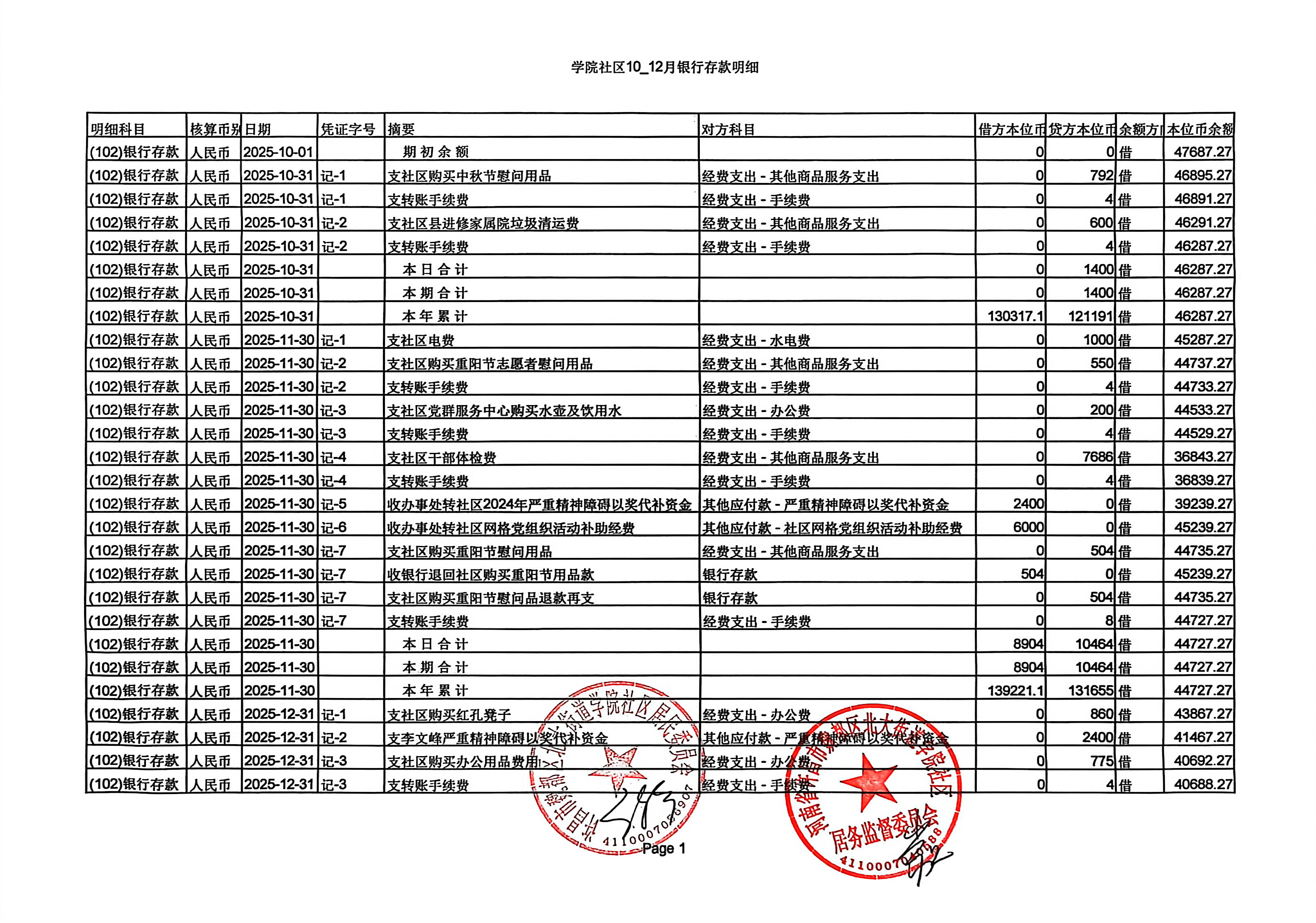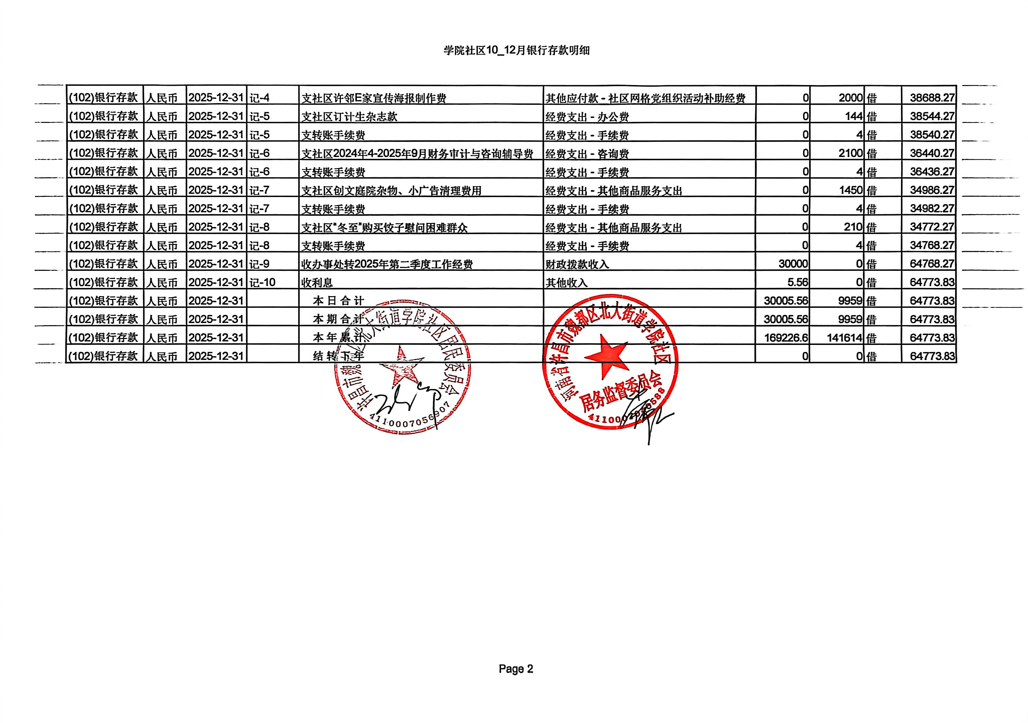 北大街道办事处学院社区2025年第四季度银行存款收支公开表