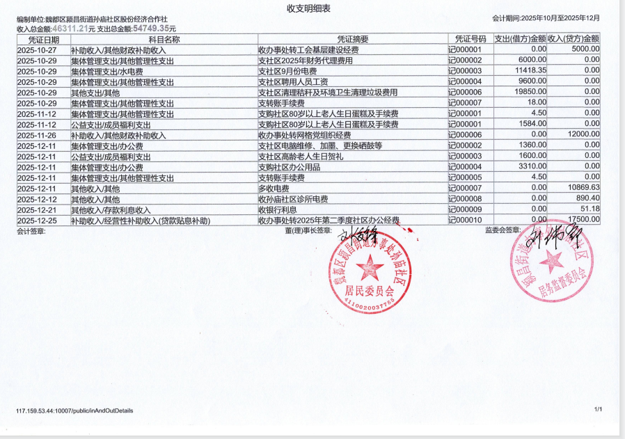 颍昌办事处孙庙社区2025年第四季度银行存款收支公开表
