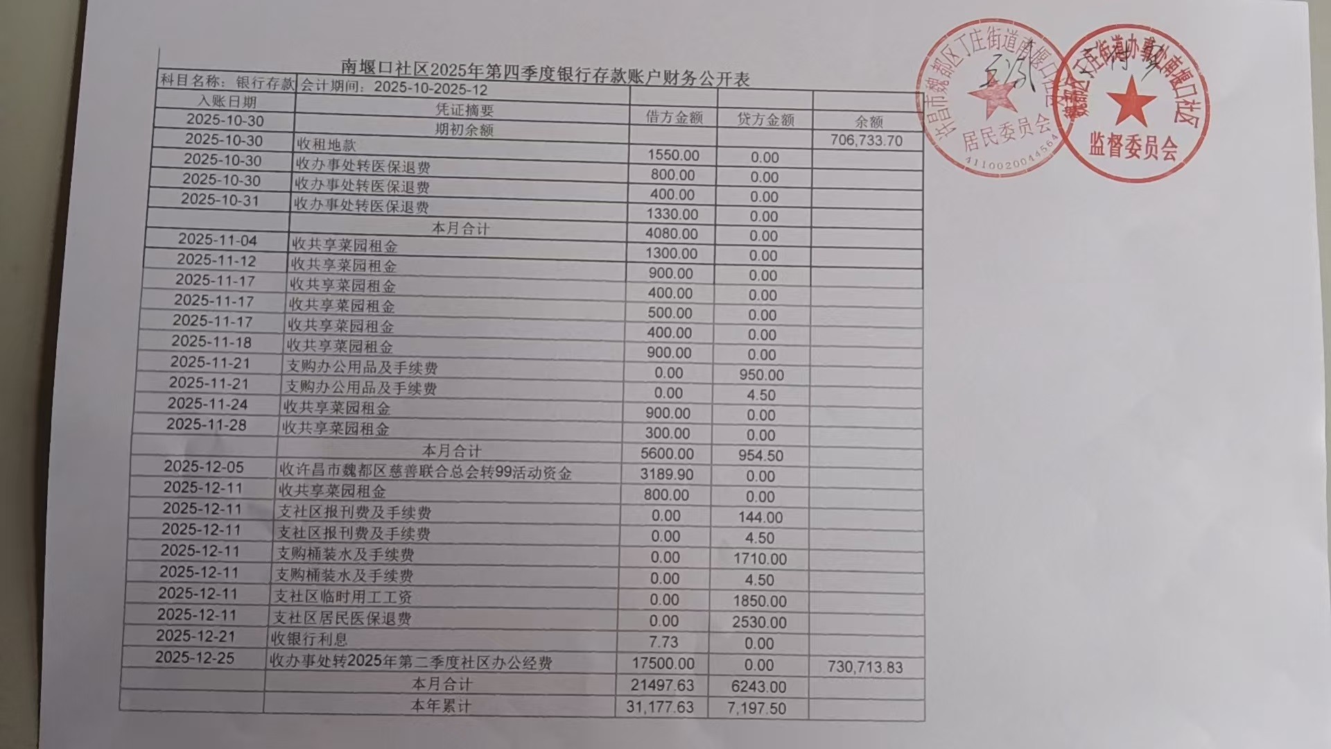 丁庄街道办事处南堰口社区2025年第四季度银行存款收支公开表