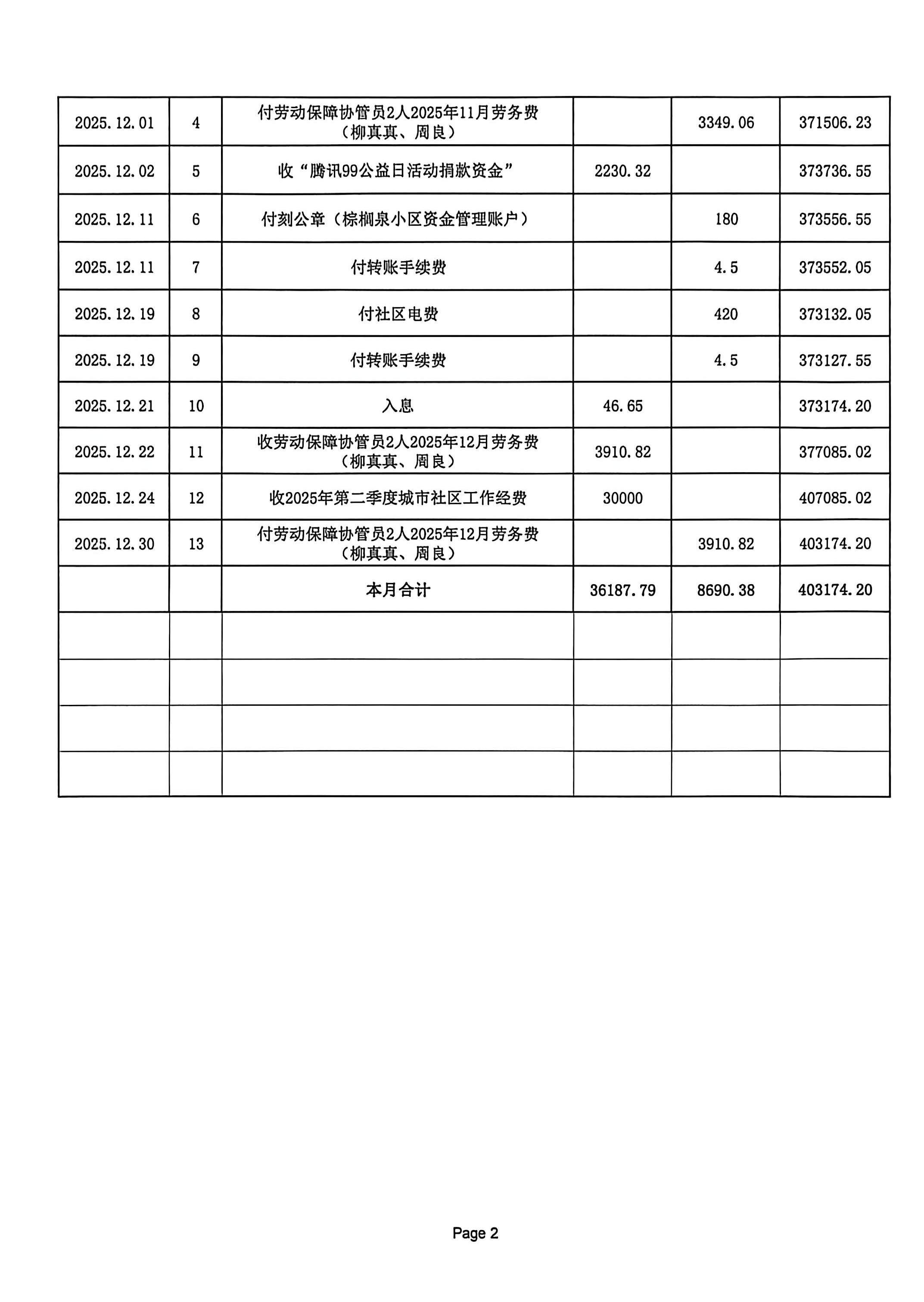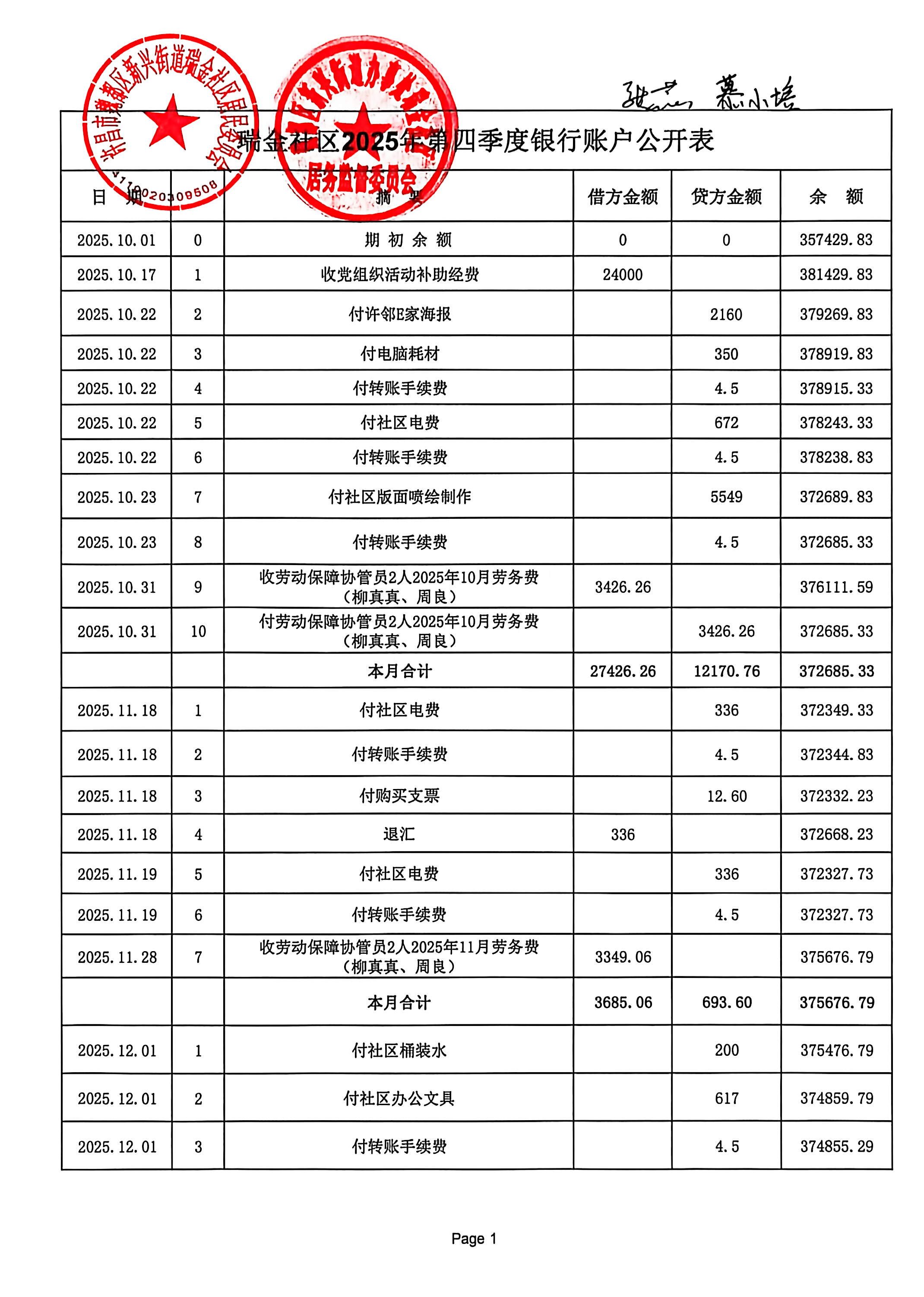 新兴街道办事处瑞金社区2025年第四季度银行存款收支公开表